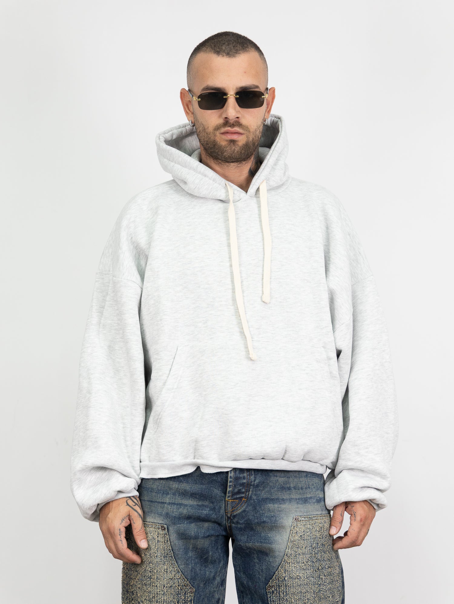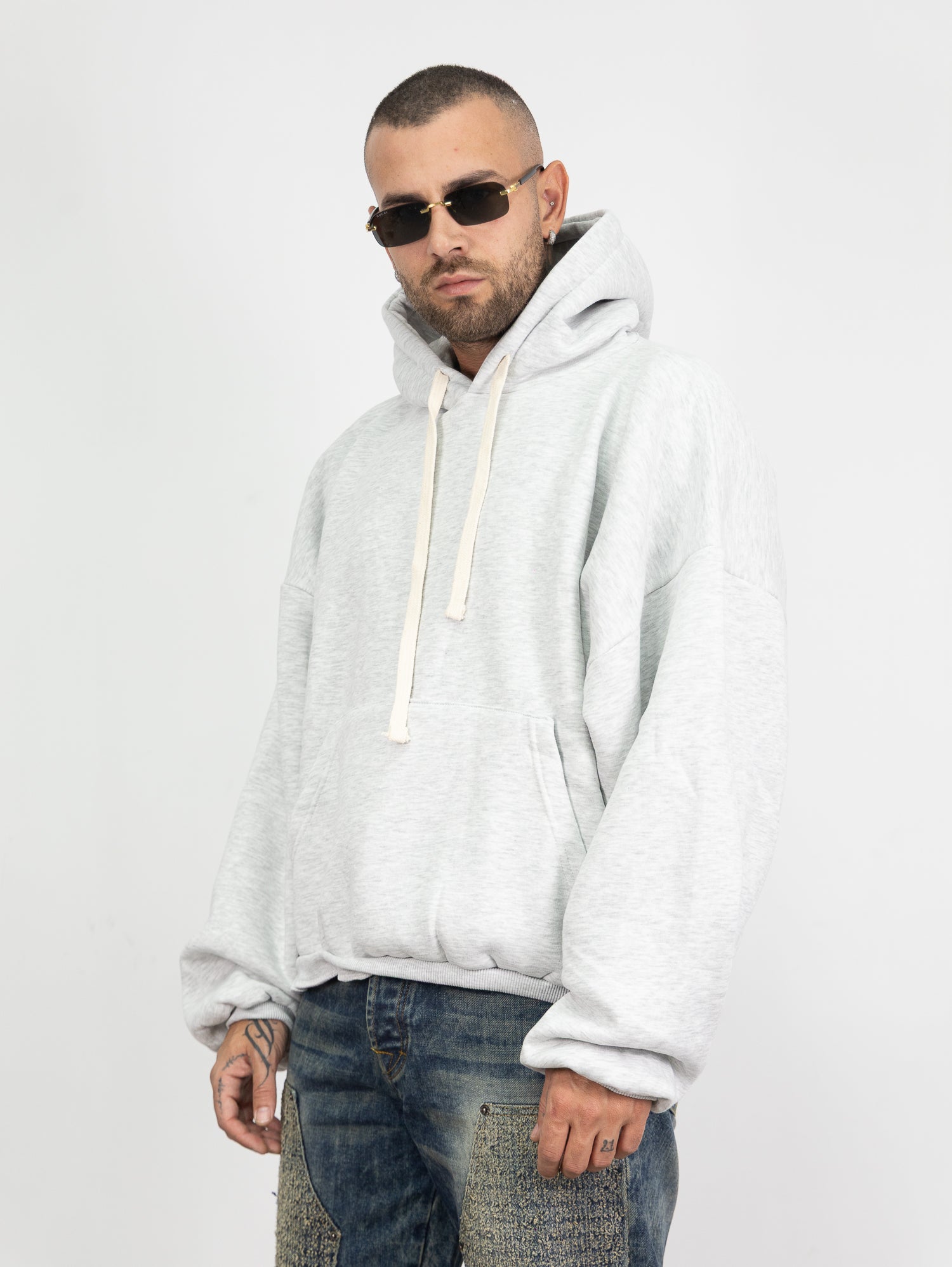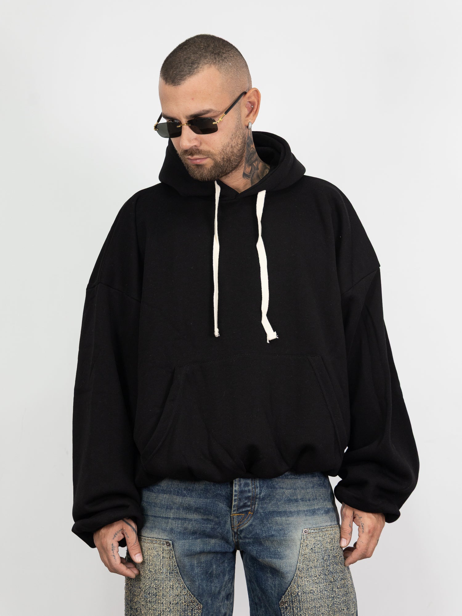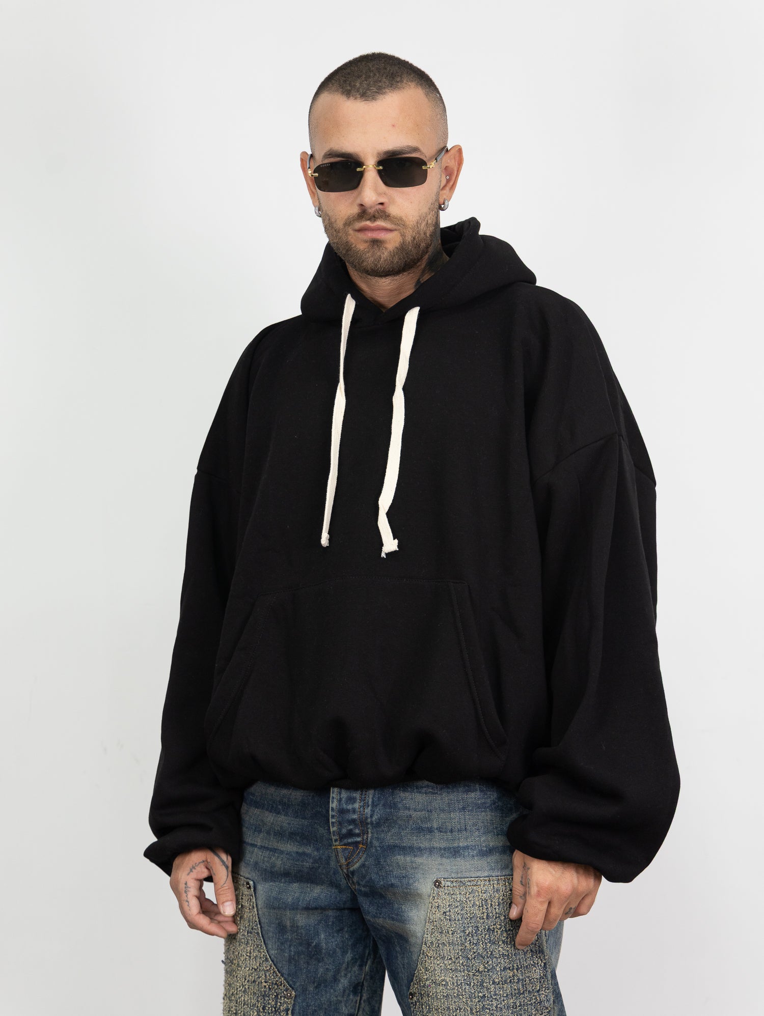 felpa con cappuccio e laccio,tascone frontale,ed elastico lungo i polsi e sul fondo