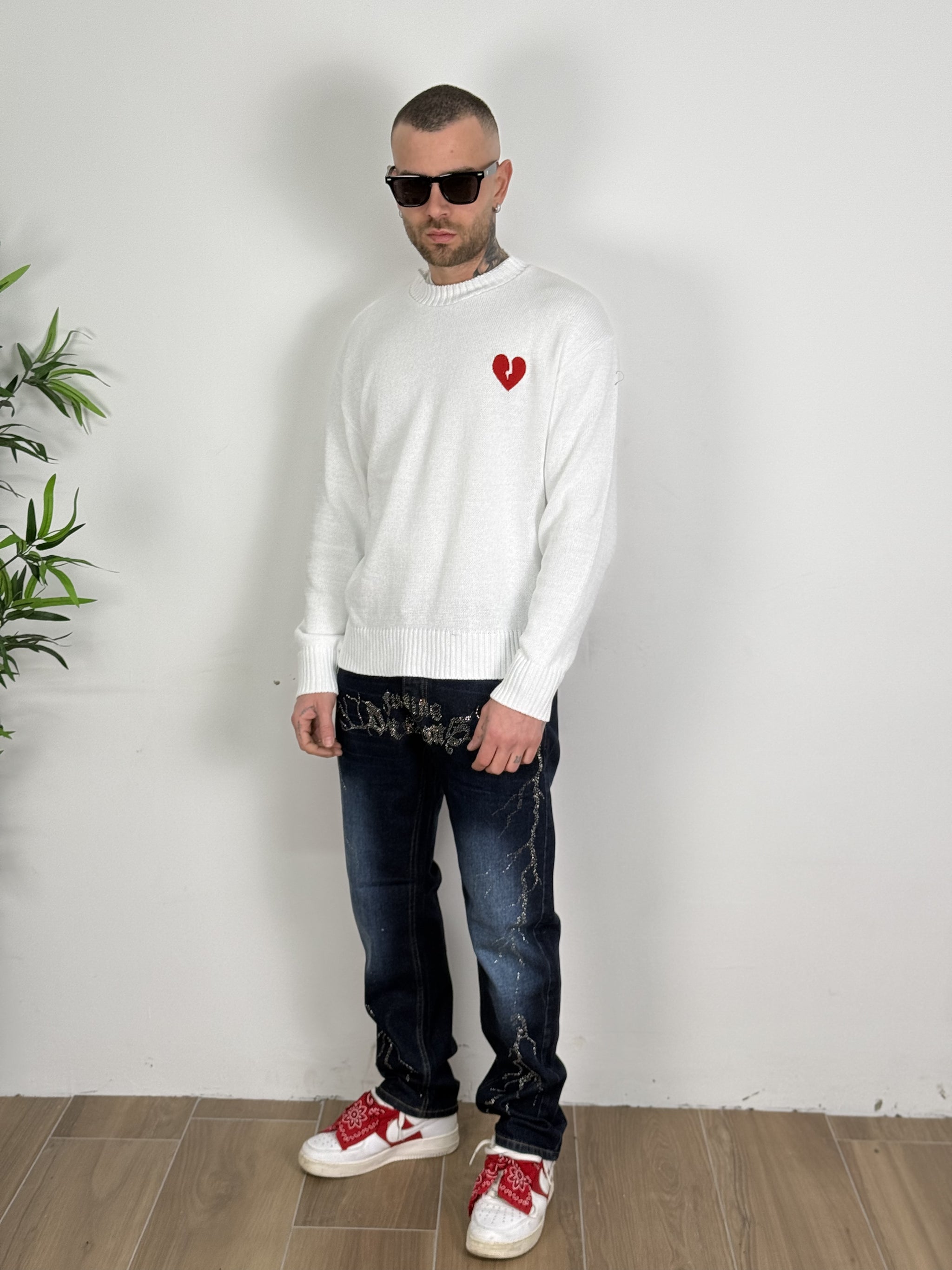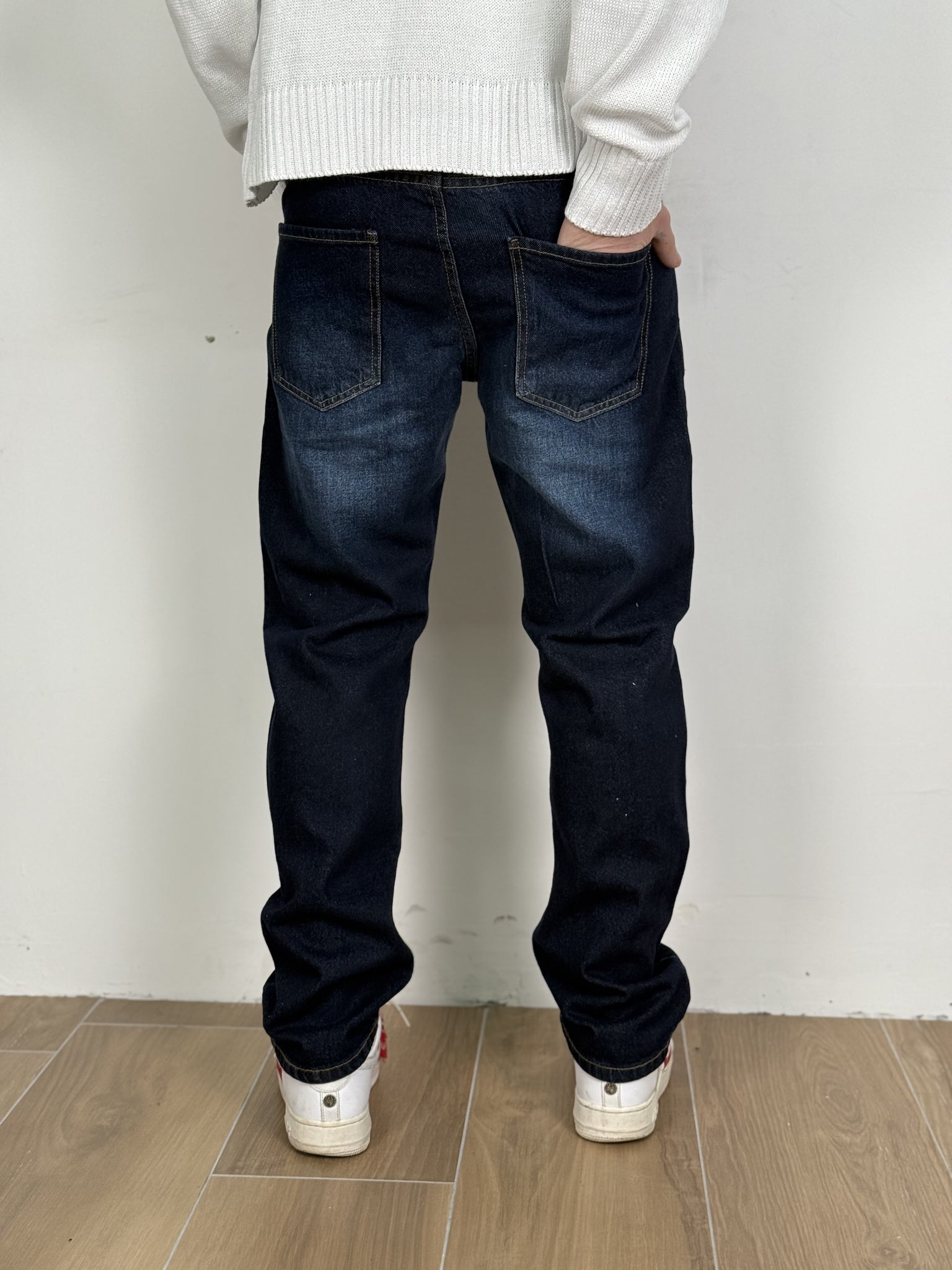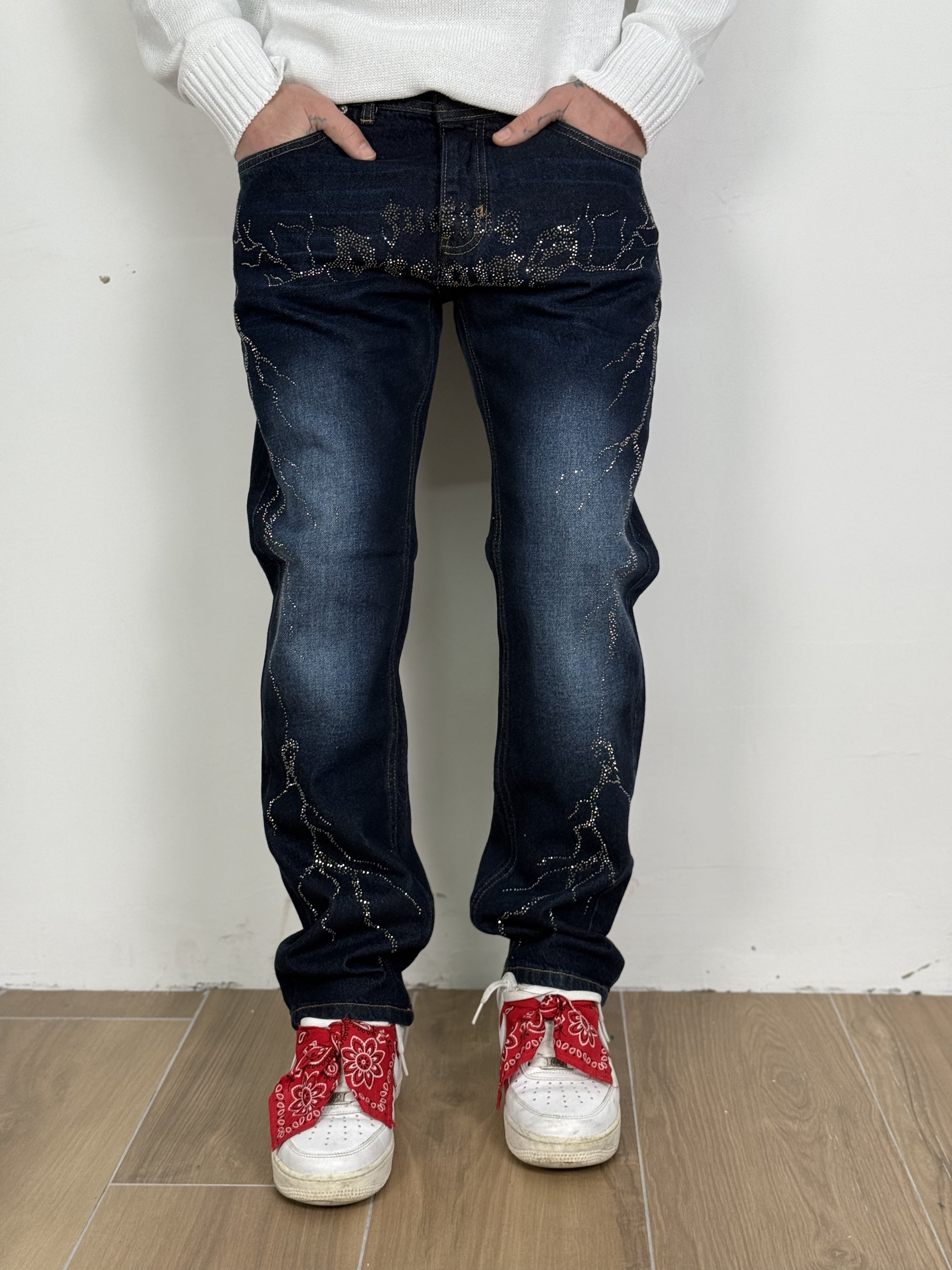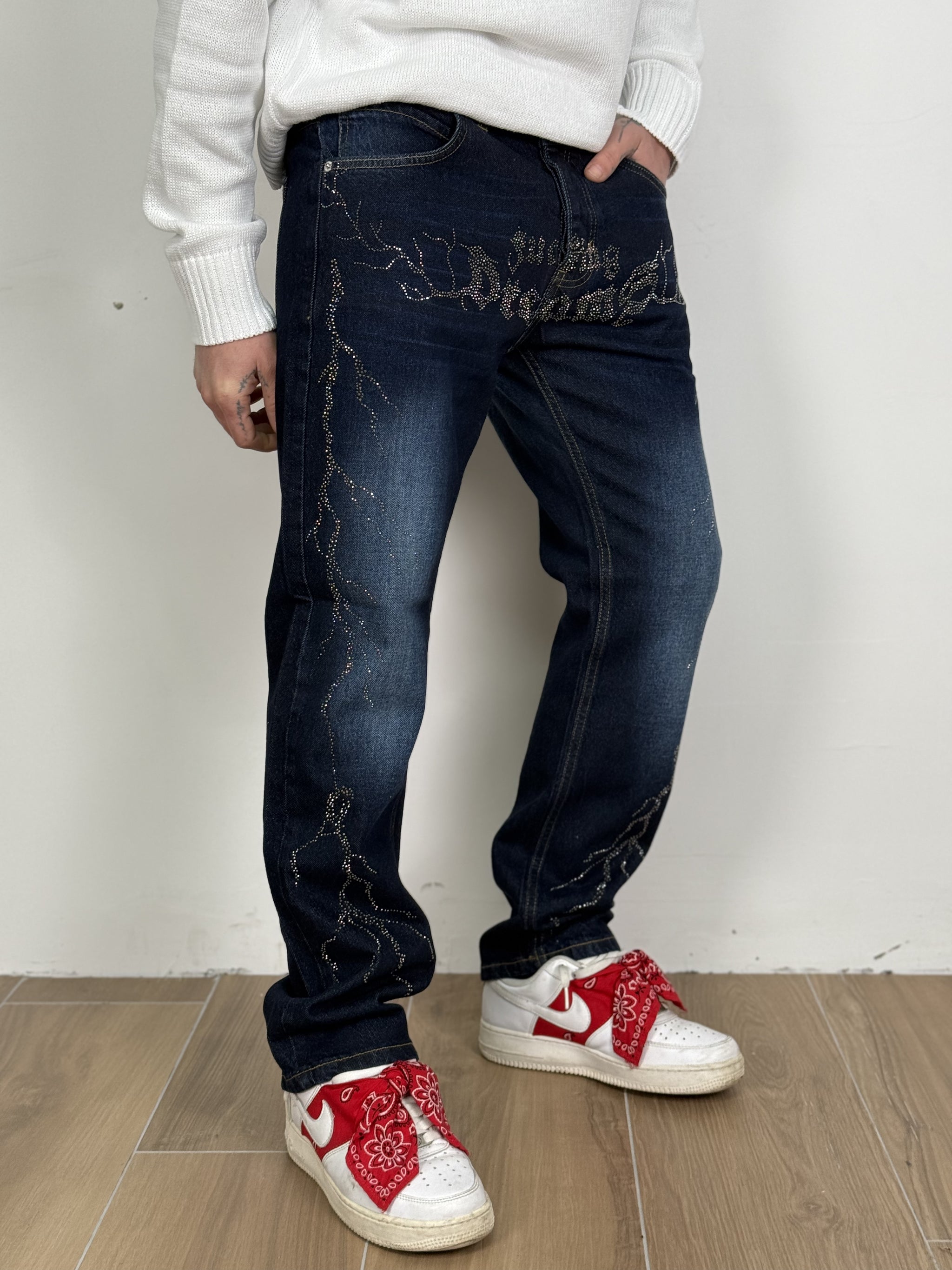 Denim con scritta frontale brillantinata e strass lungo la gamba,vestibilità regolare.