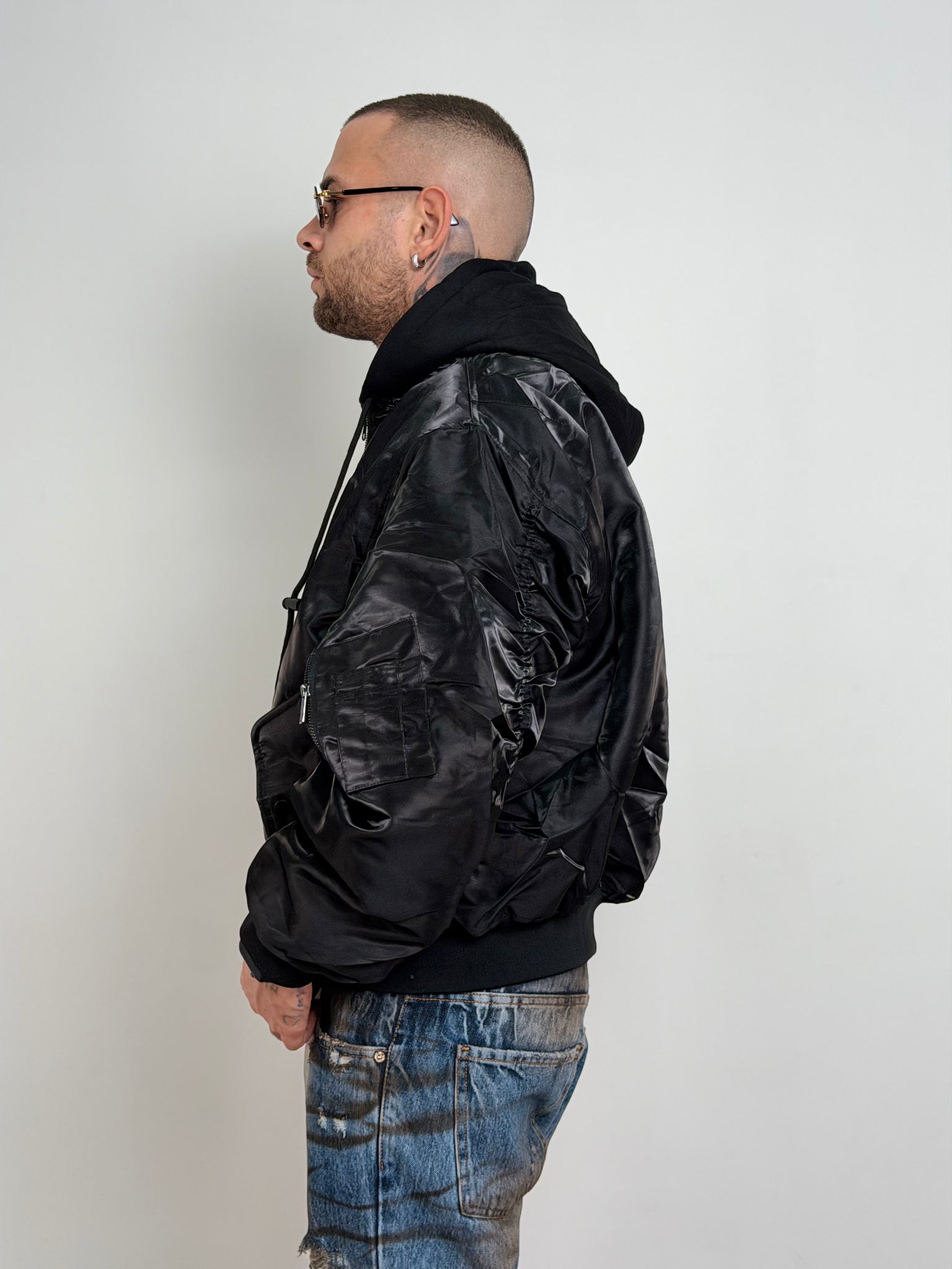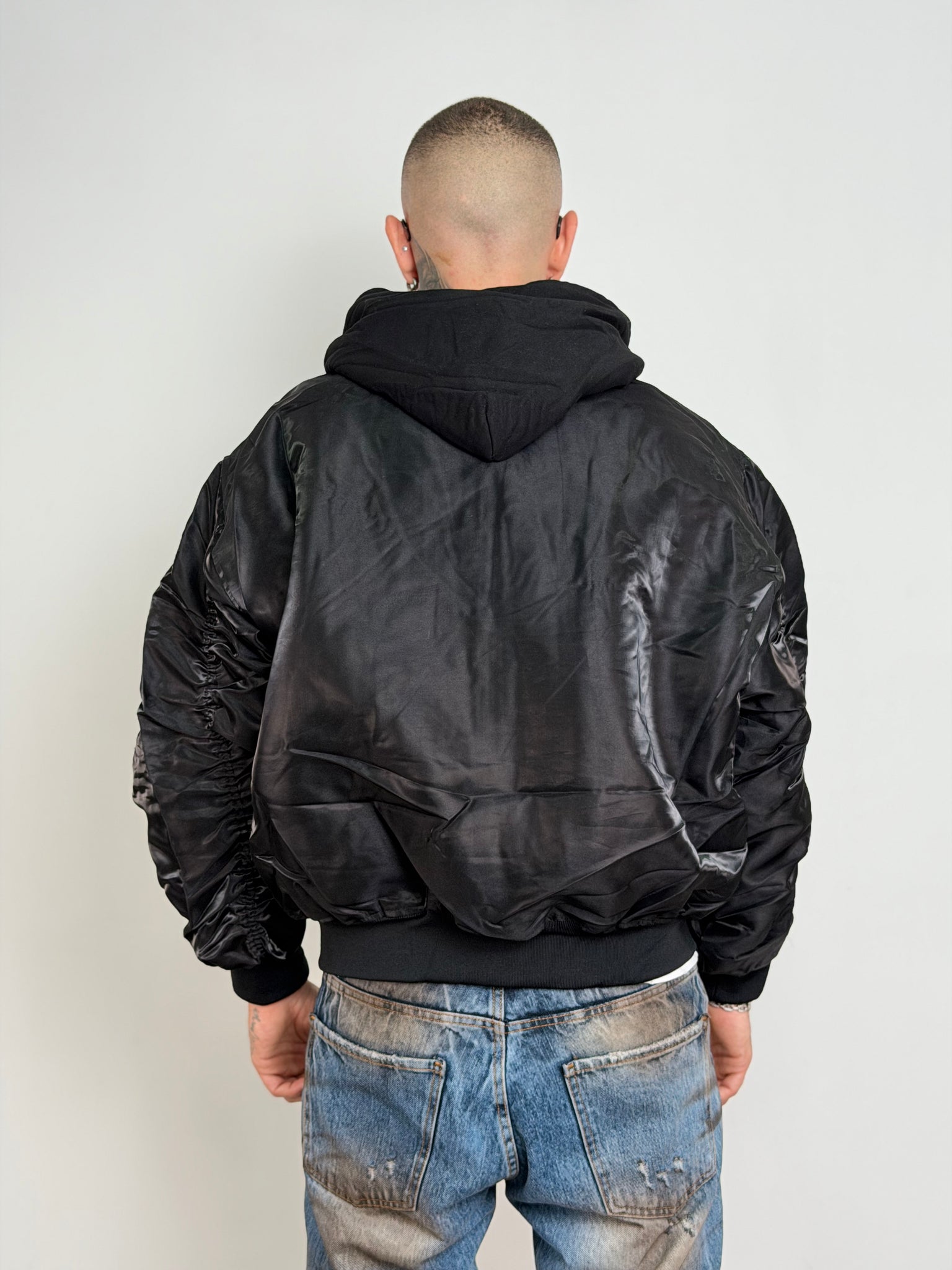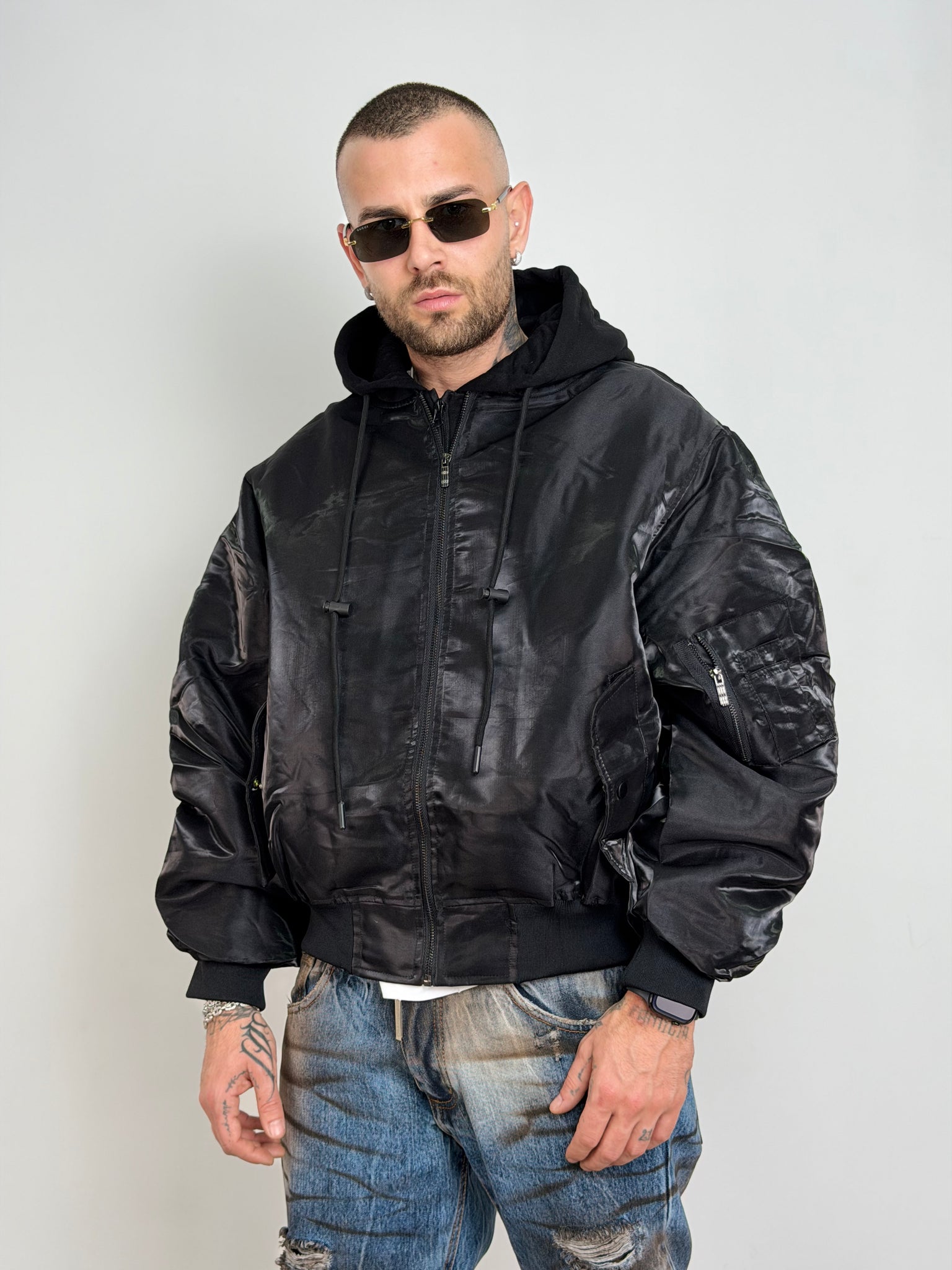 jacket in eco pelle con cappuccio e laccio e multi taschete frontali e laterali