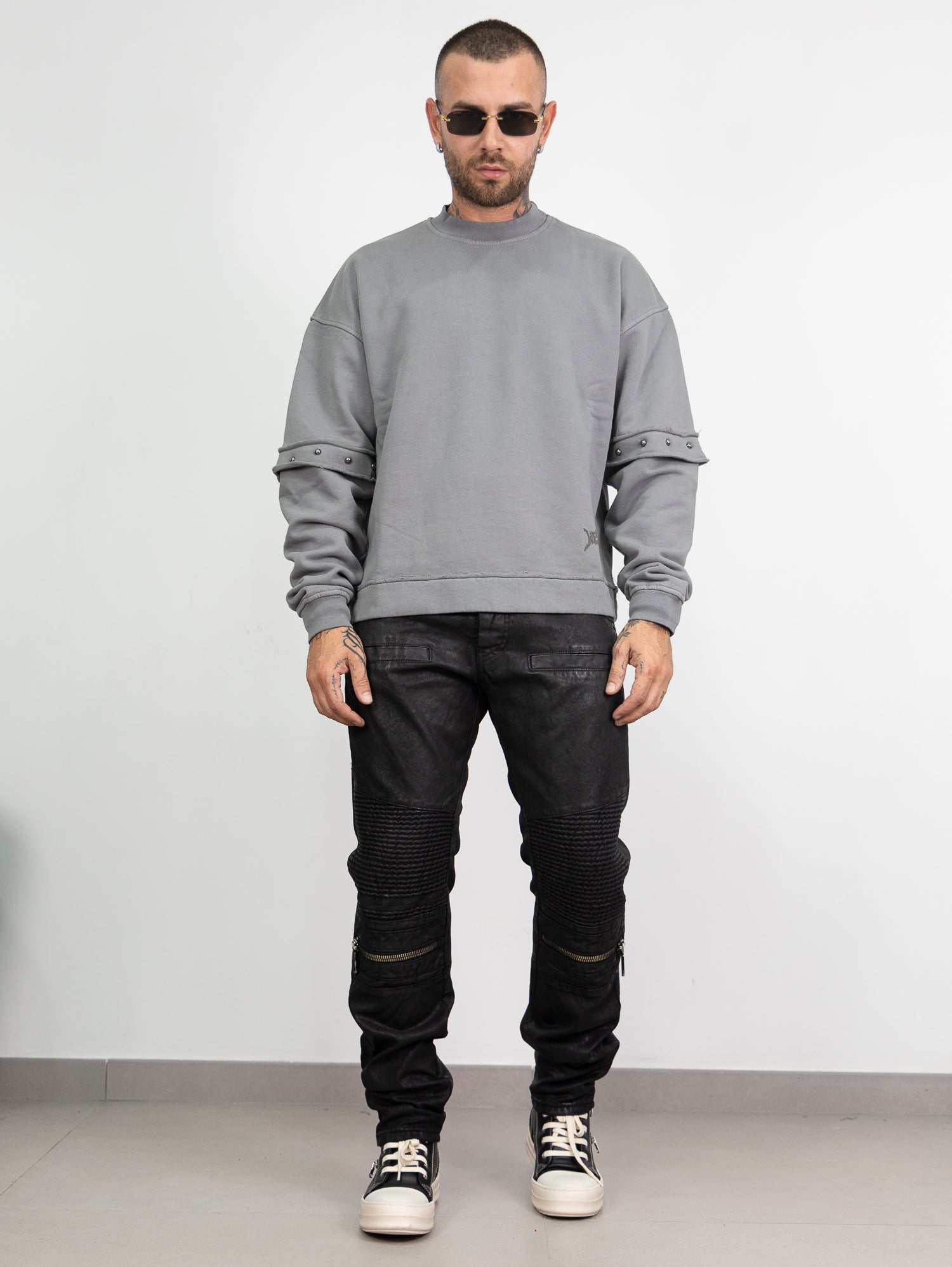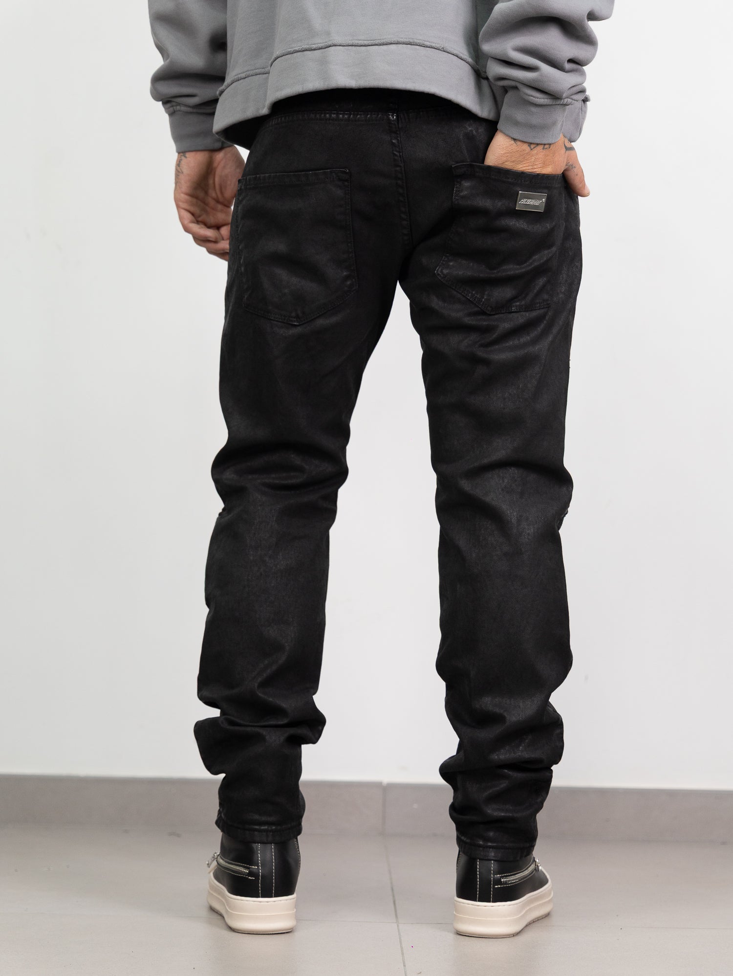 Biker spalmato con zip frontali e doppia tasca.