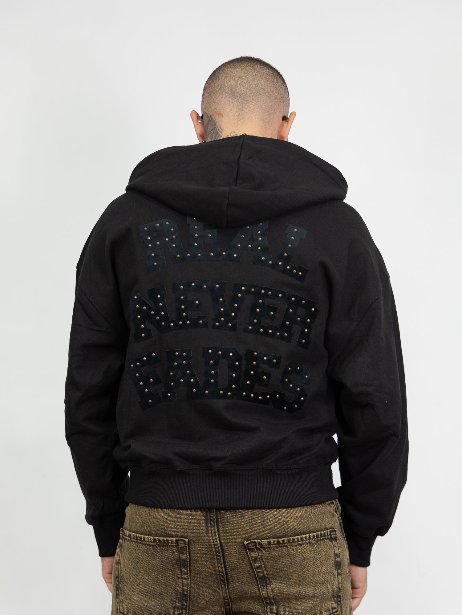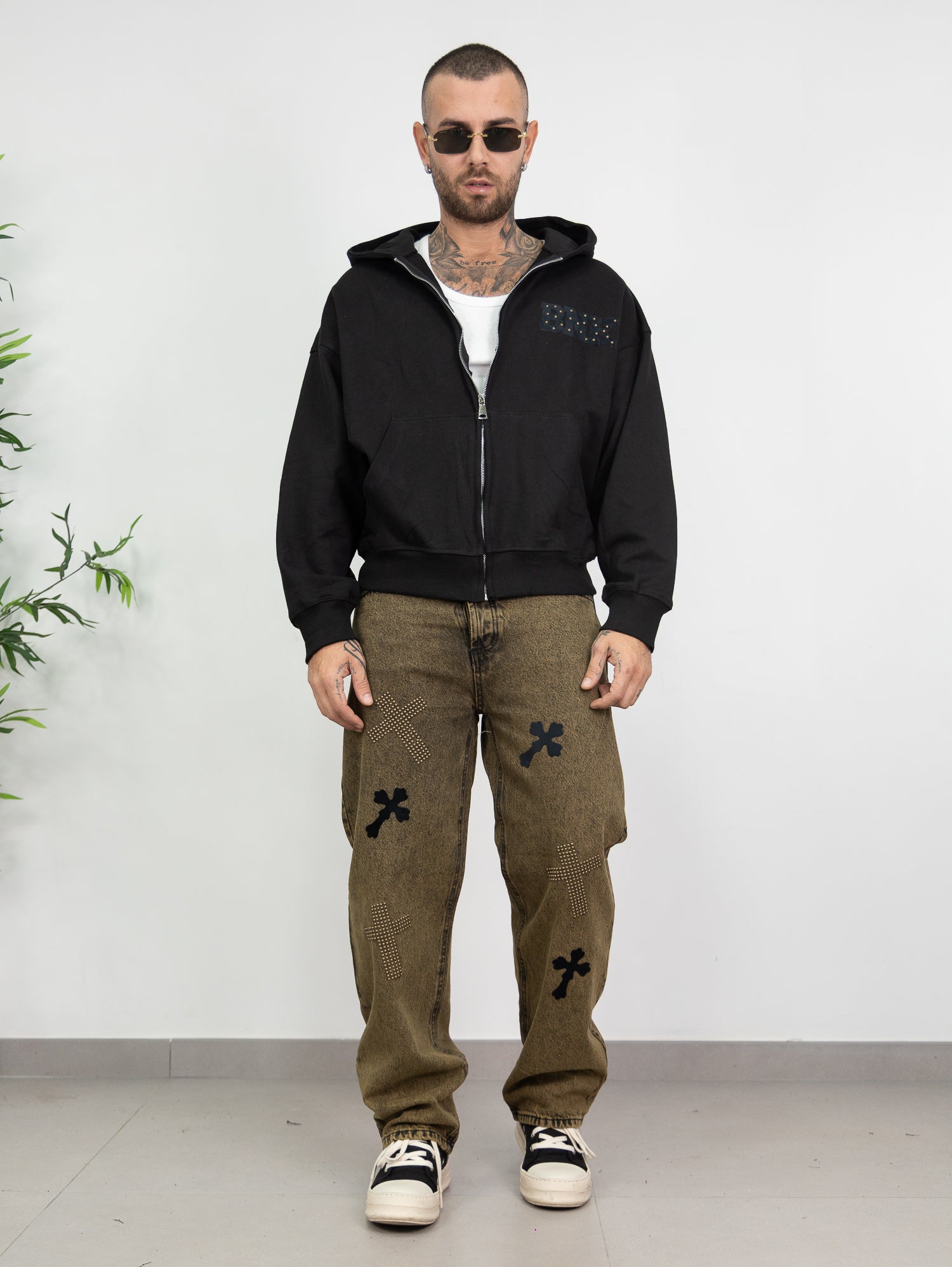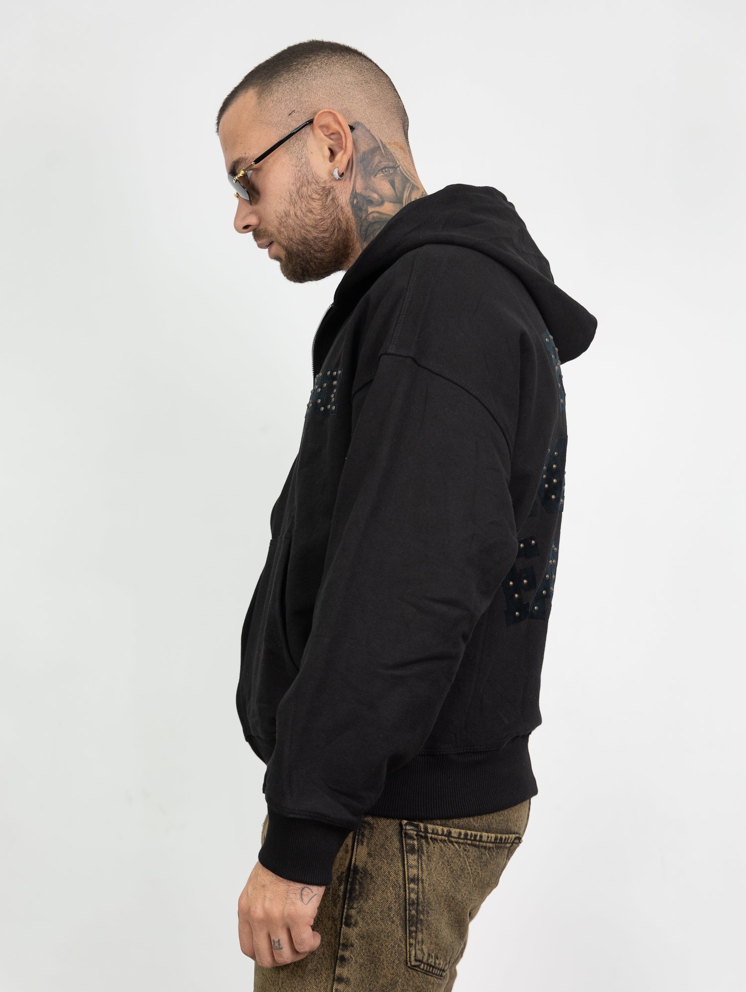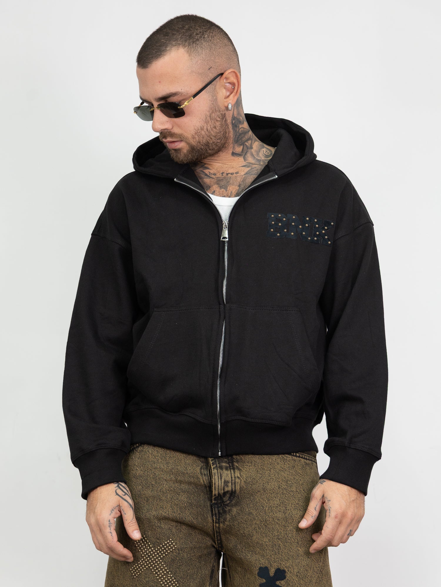 felpa con cappuccio e zip apribile con stampa borchiata in petto