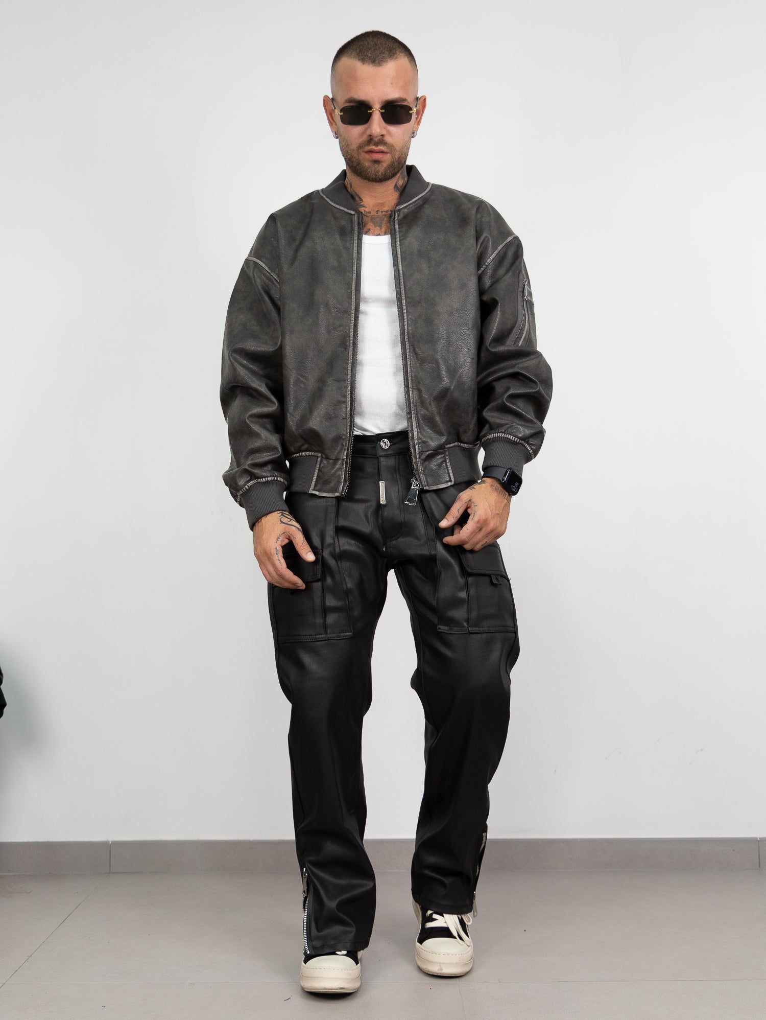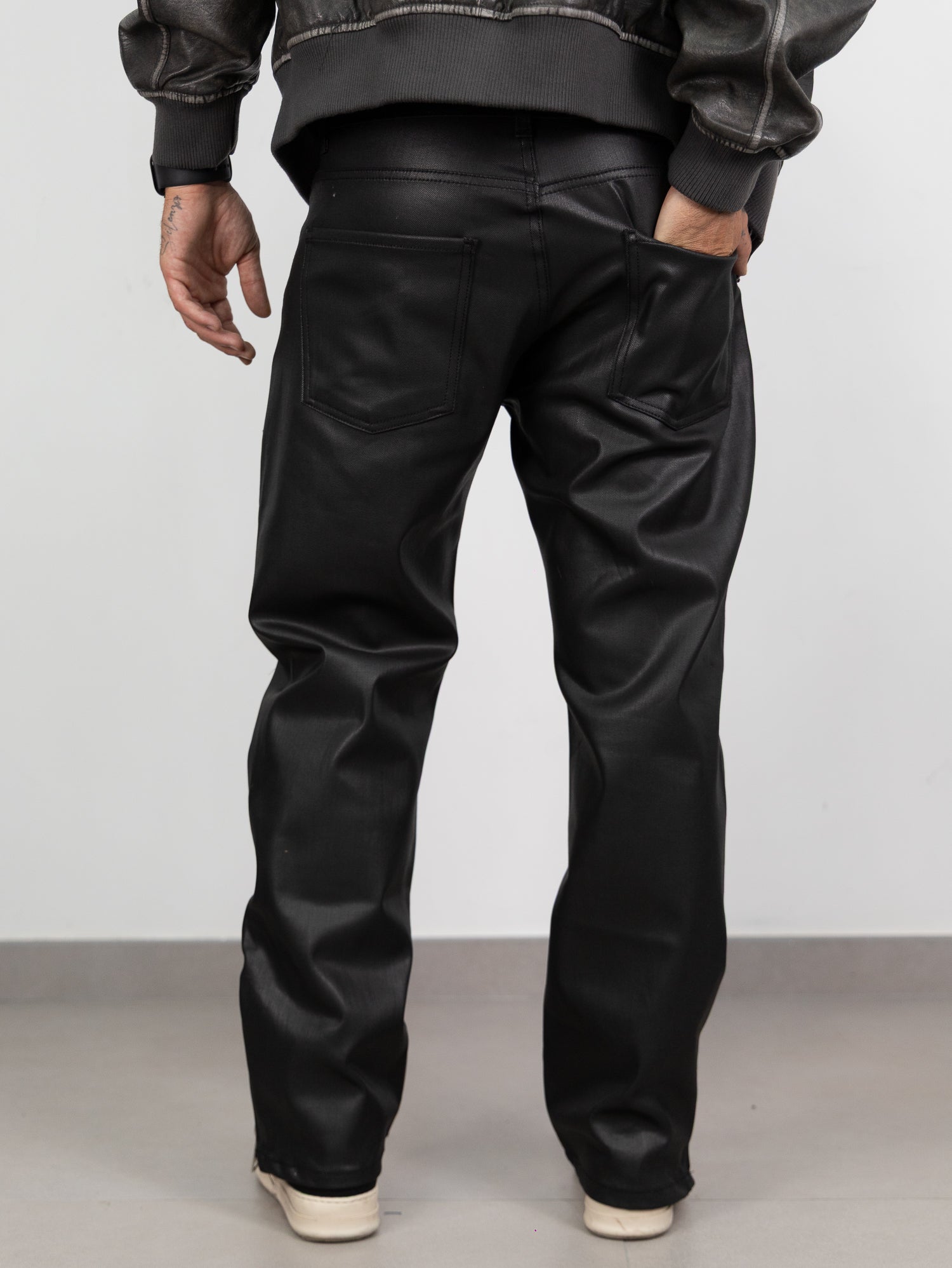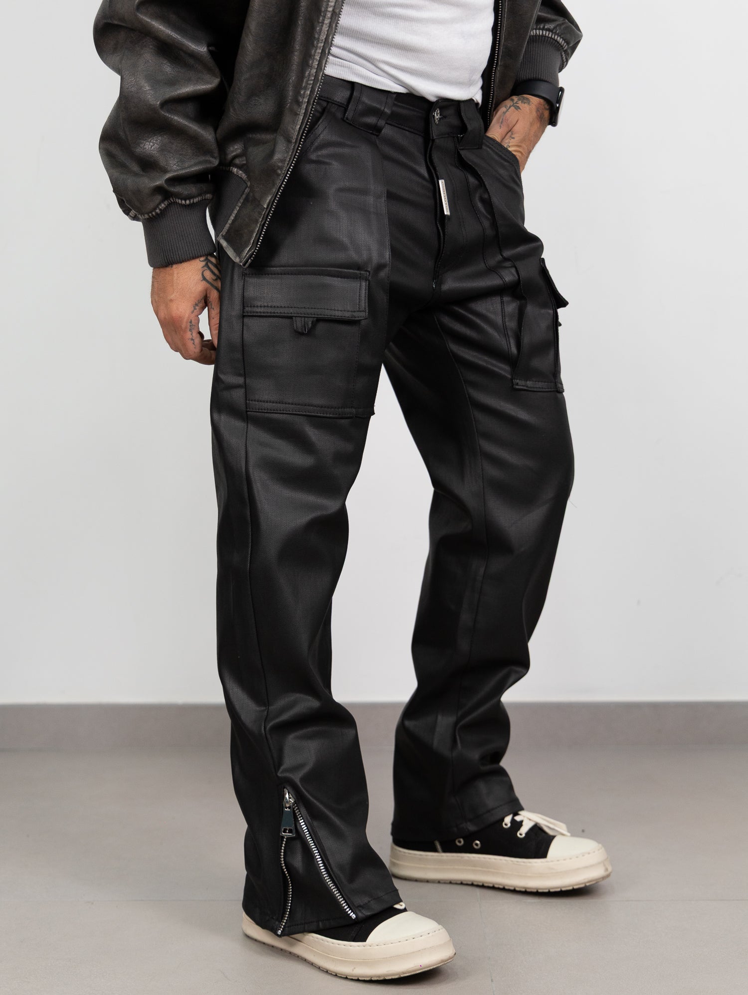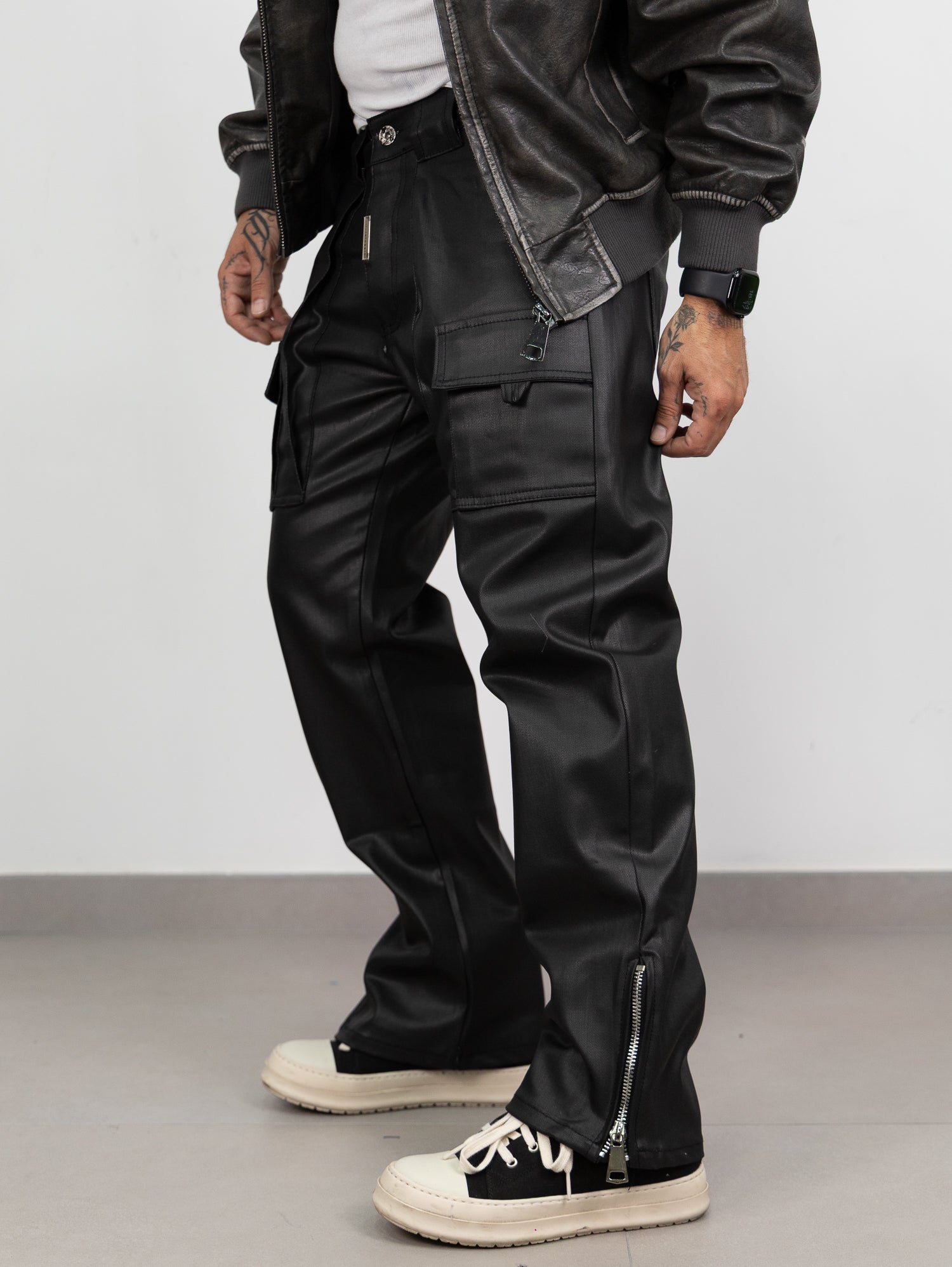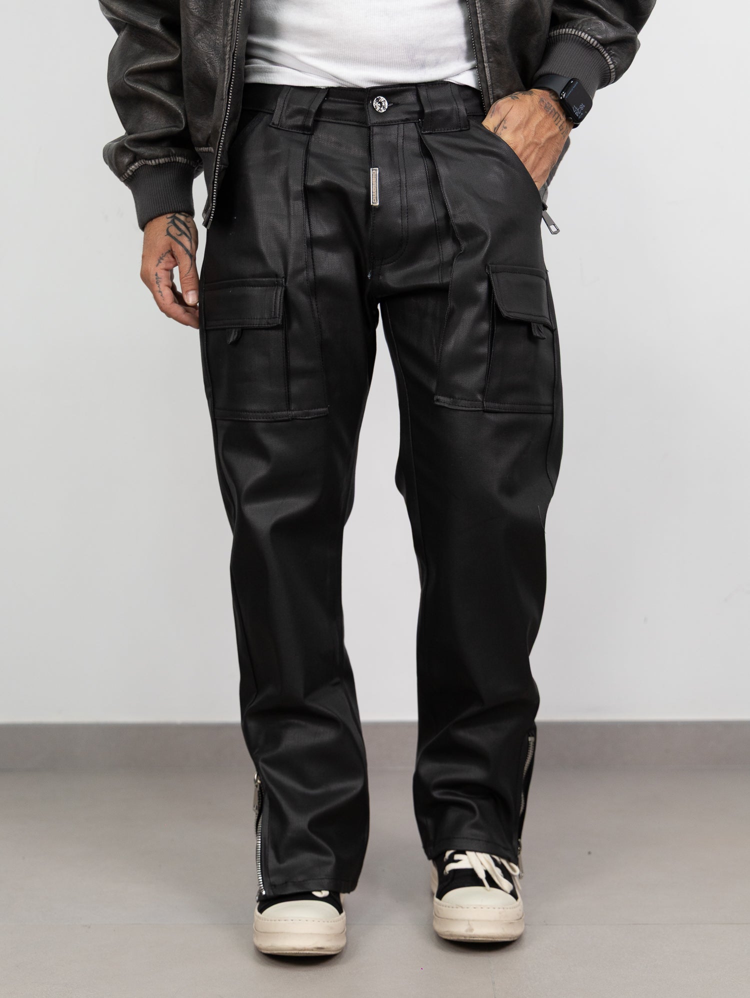 pantalone in eco pelle spalmato con tasconi frontali e zip apribibile sul fondo