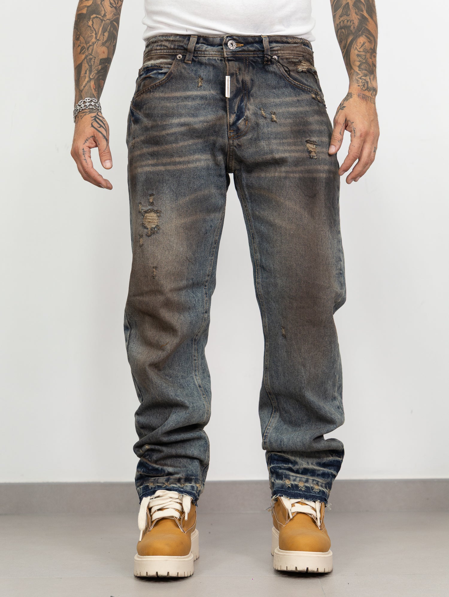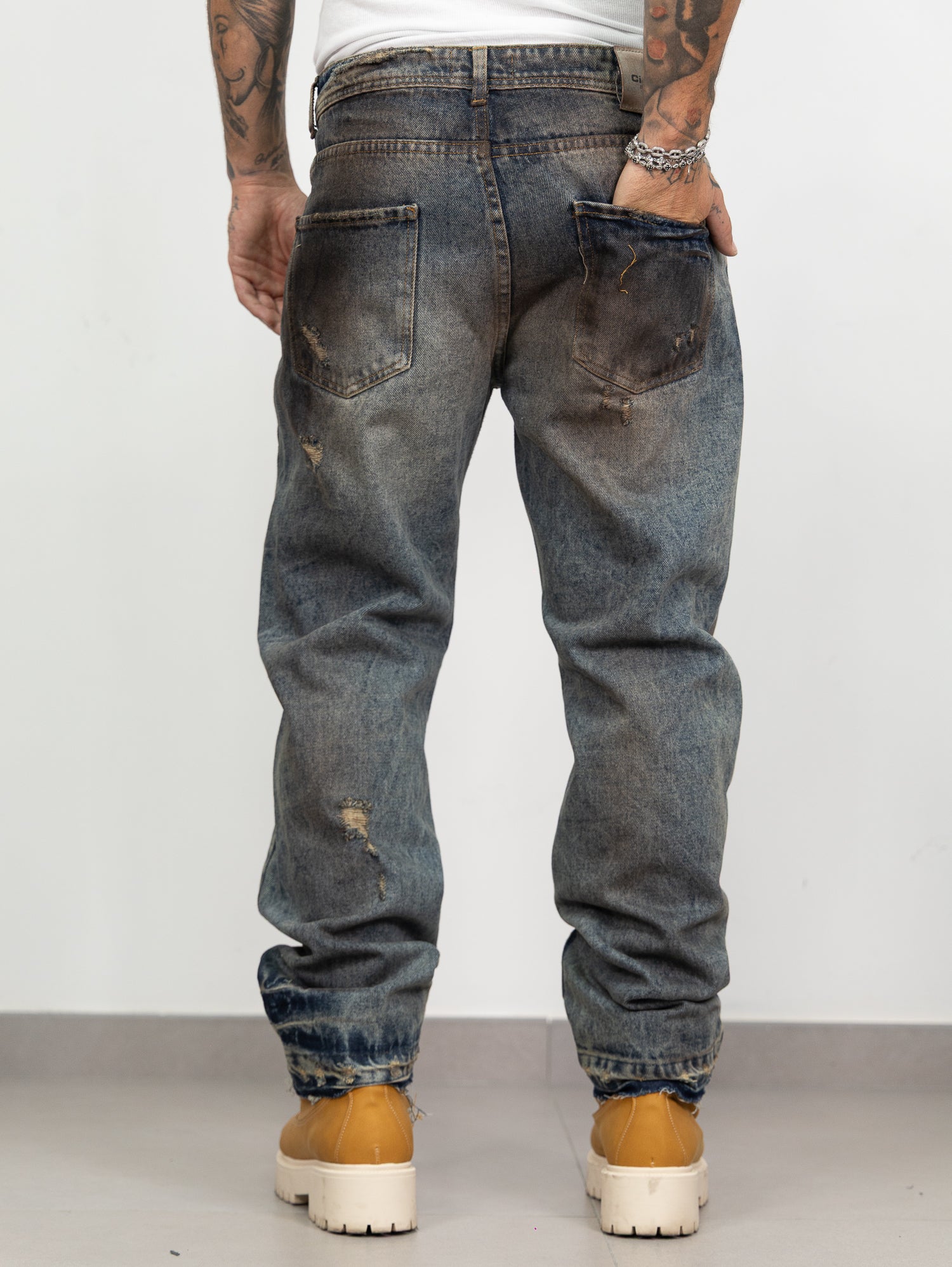 straight fit in denim sfumato doppio colore con rotture taglio vivo fronte\retro