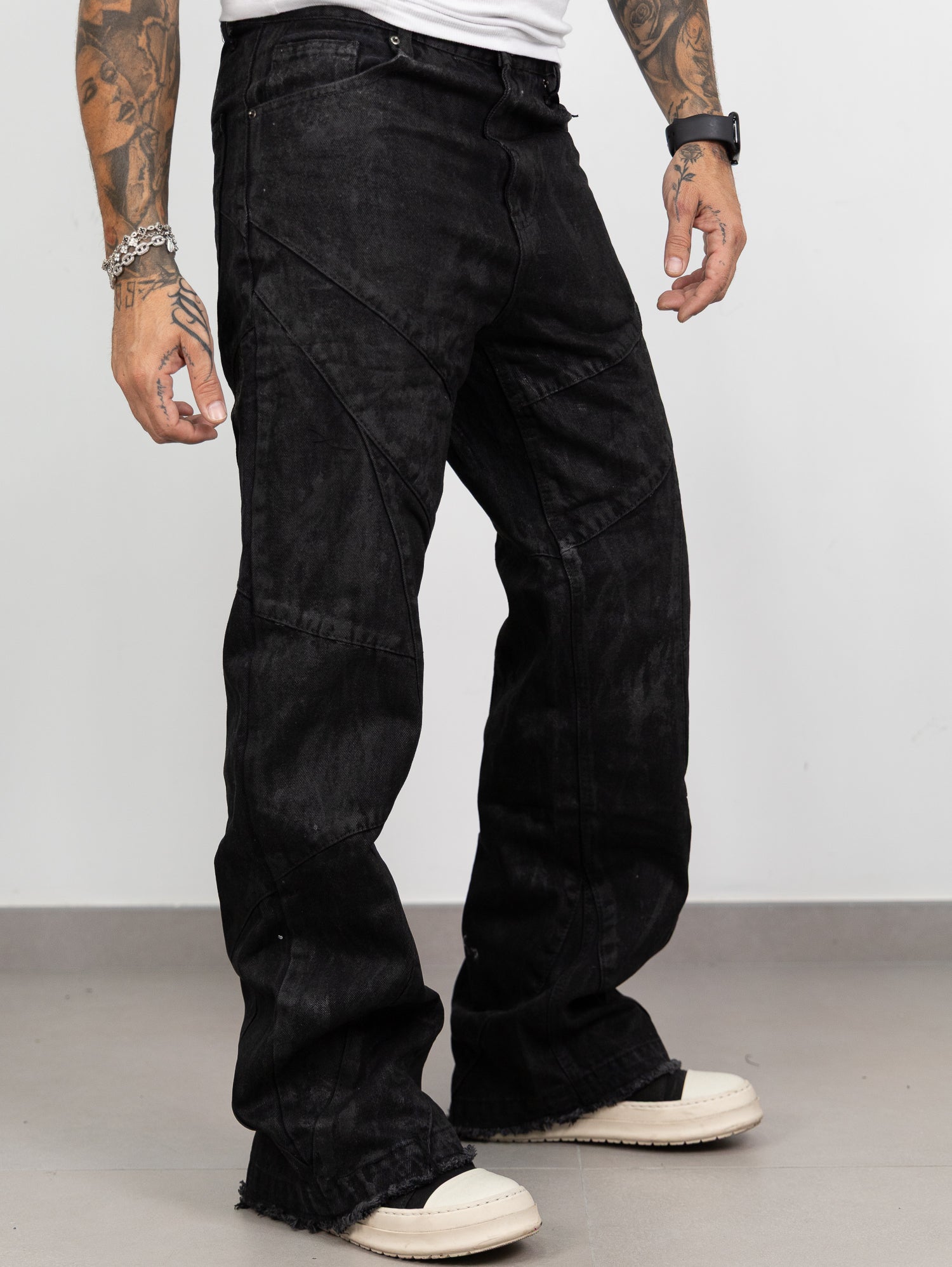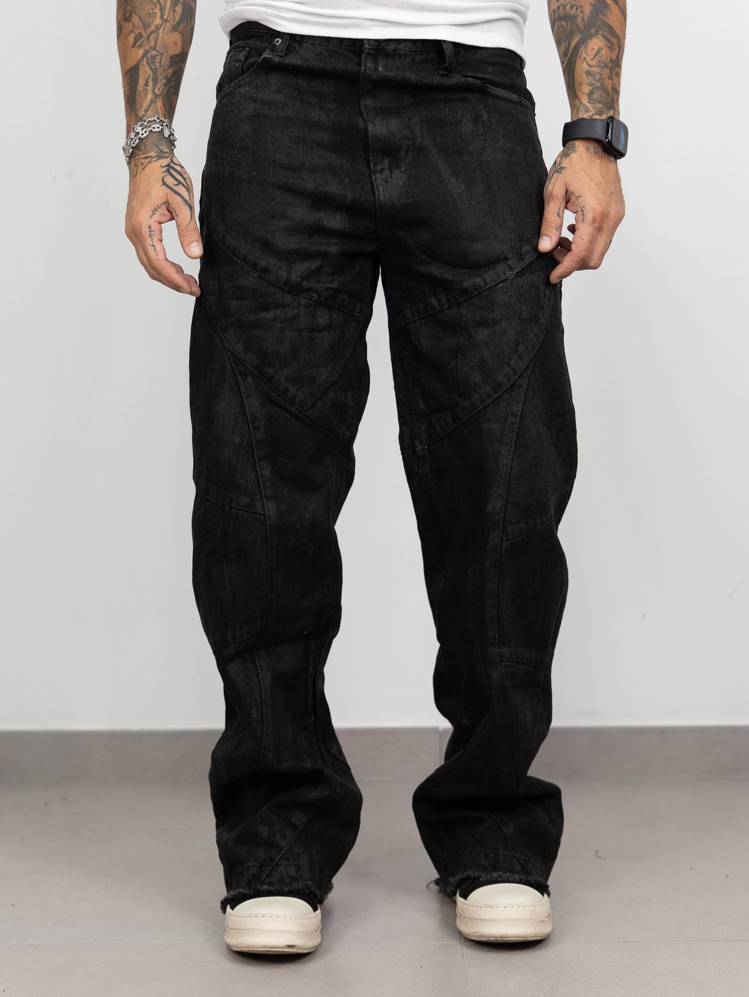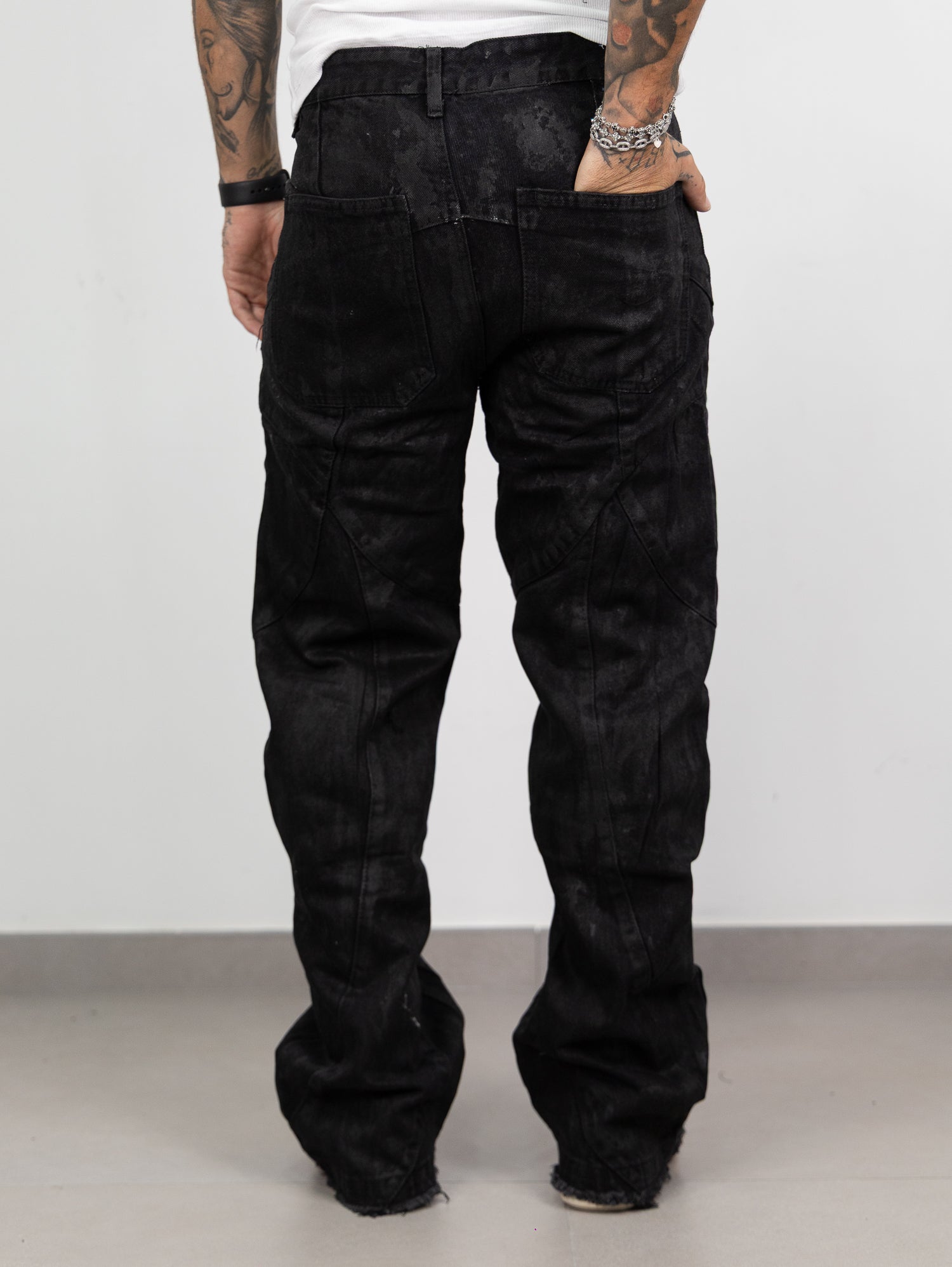 baggy in denim spalmato verniciato con cuciture esterne in rilievo colore su colore e rotture taglio vivo sul fondo.