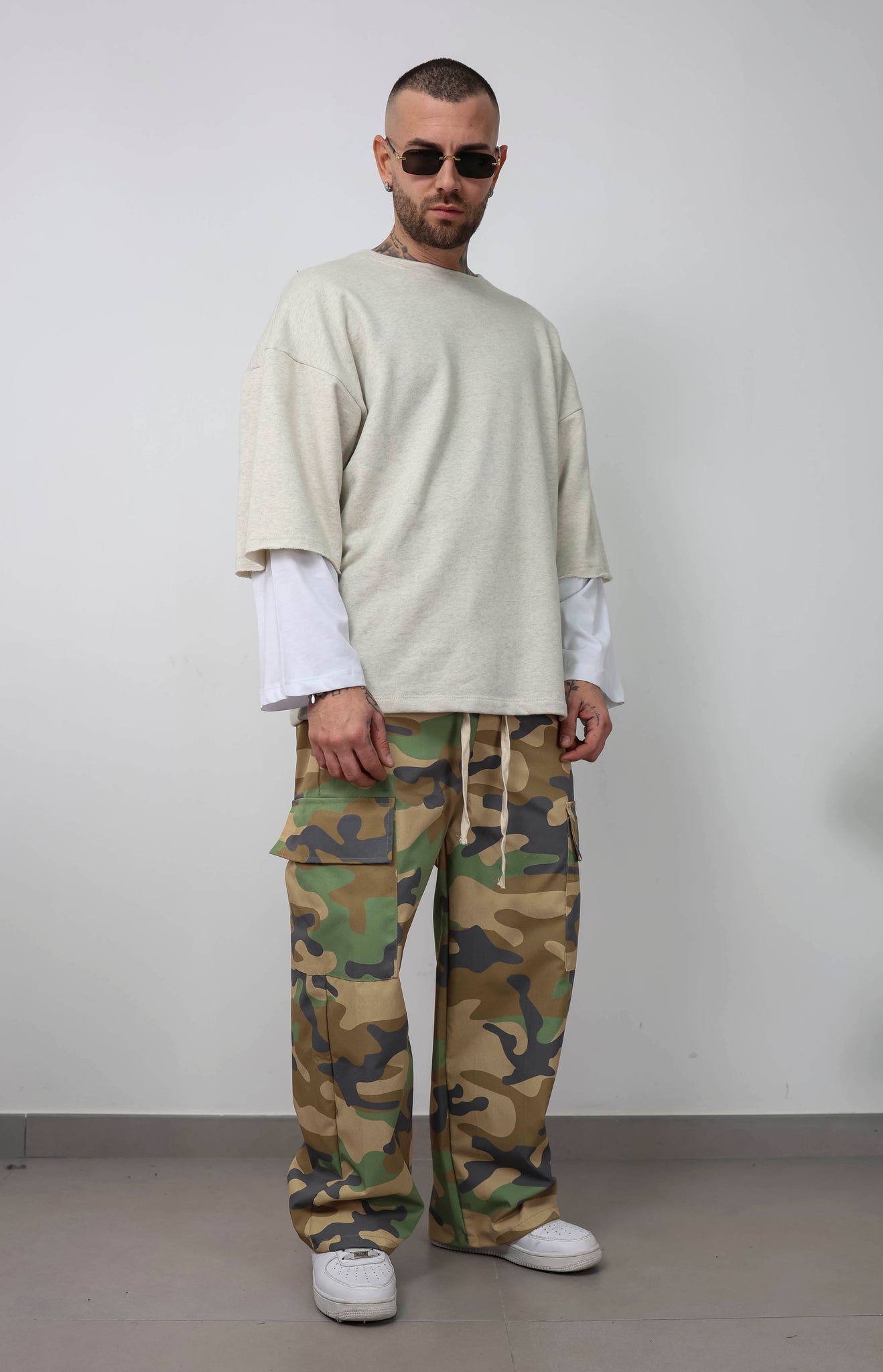 pantalone mimetico con elastico e laccio in vita e tasche laterali