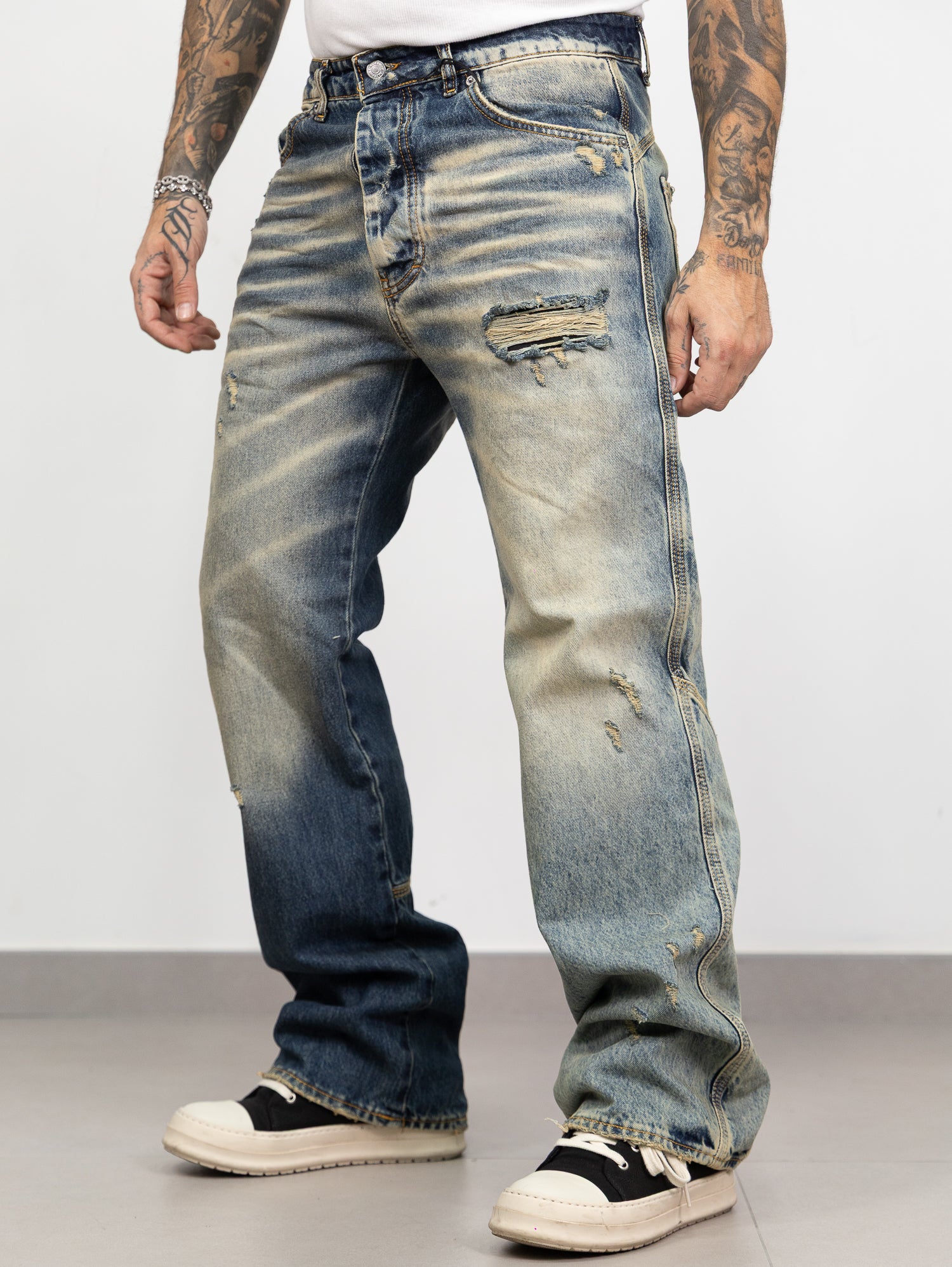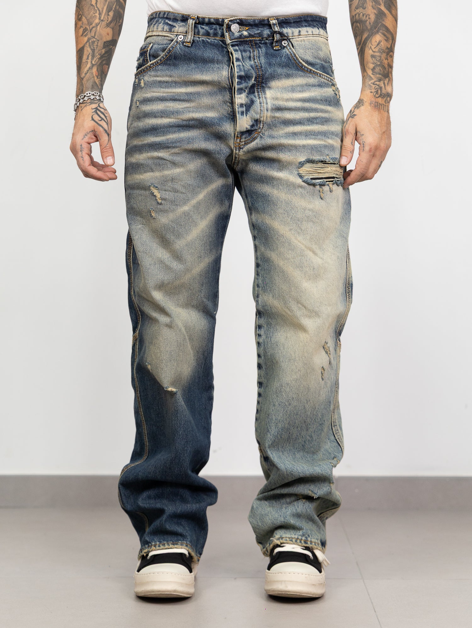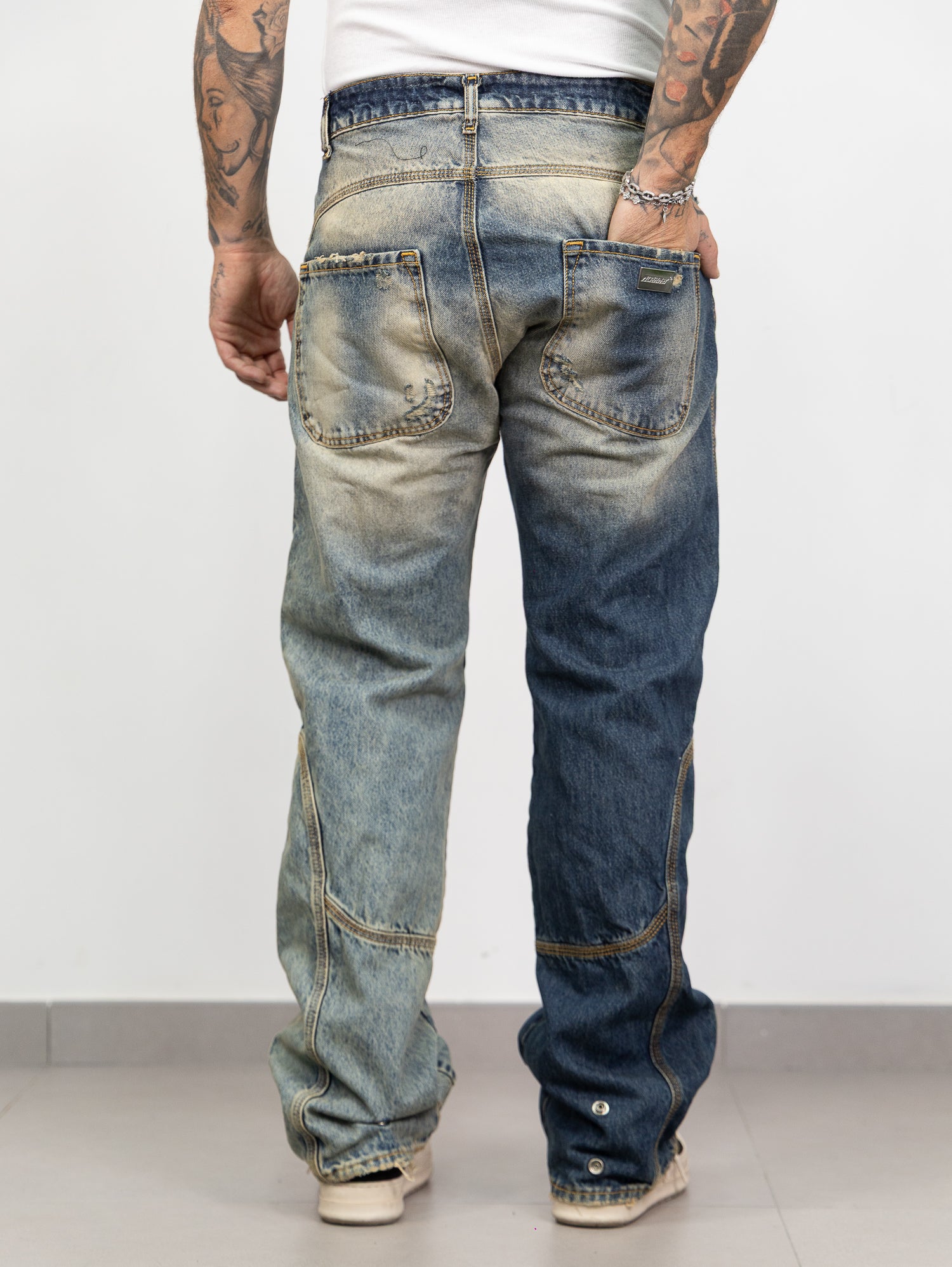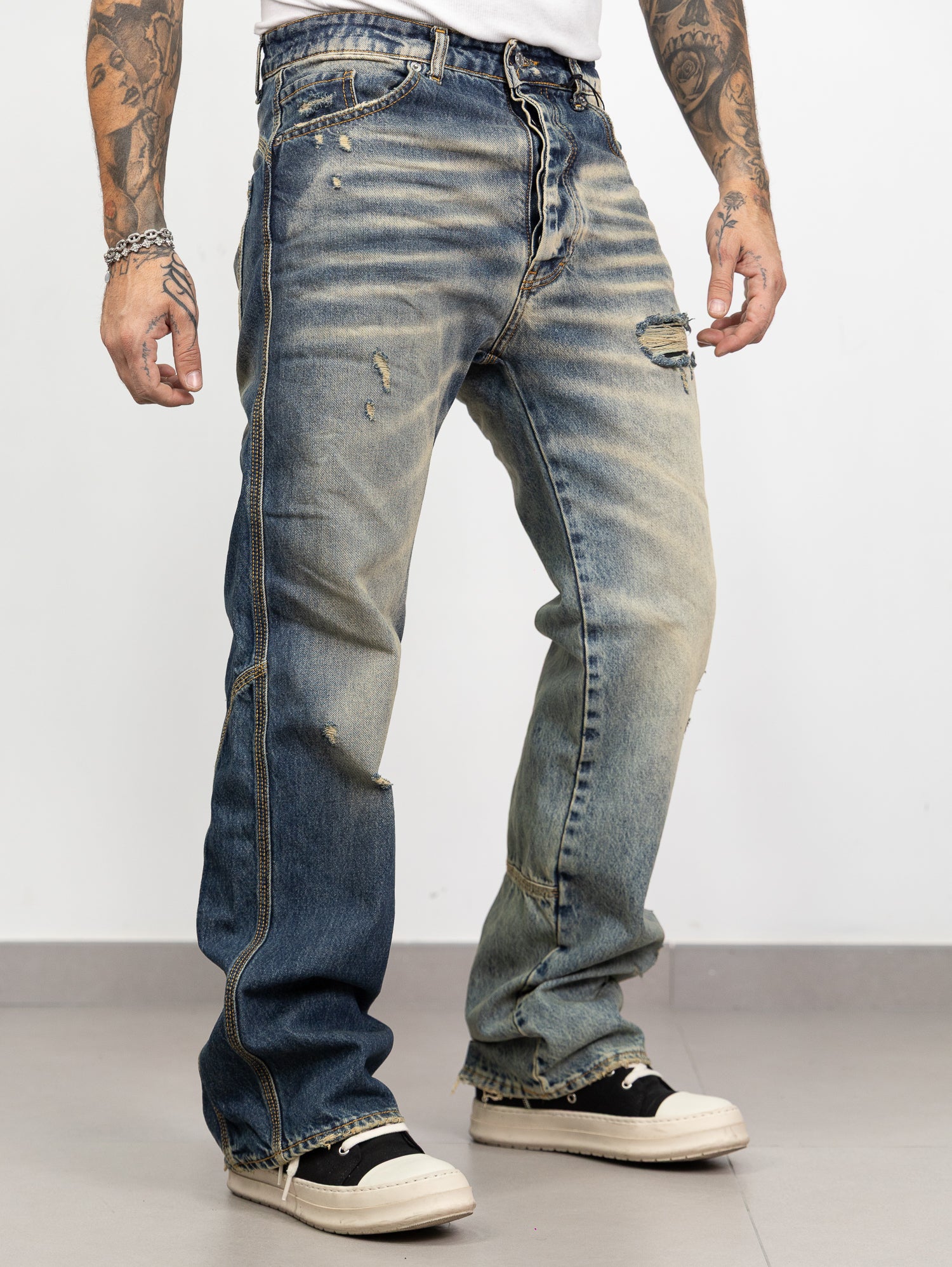 flare in denim sfumato doppio colore,con roture taglio vivo fronte\retro e sul fondo e cuciture a contrasto esterne in rilievo