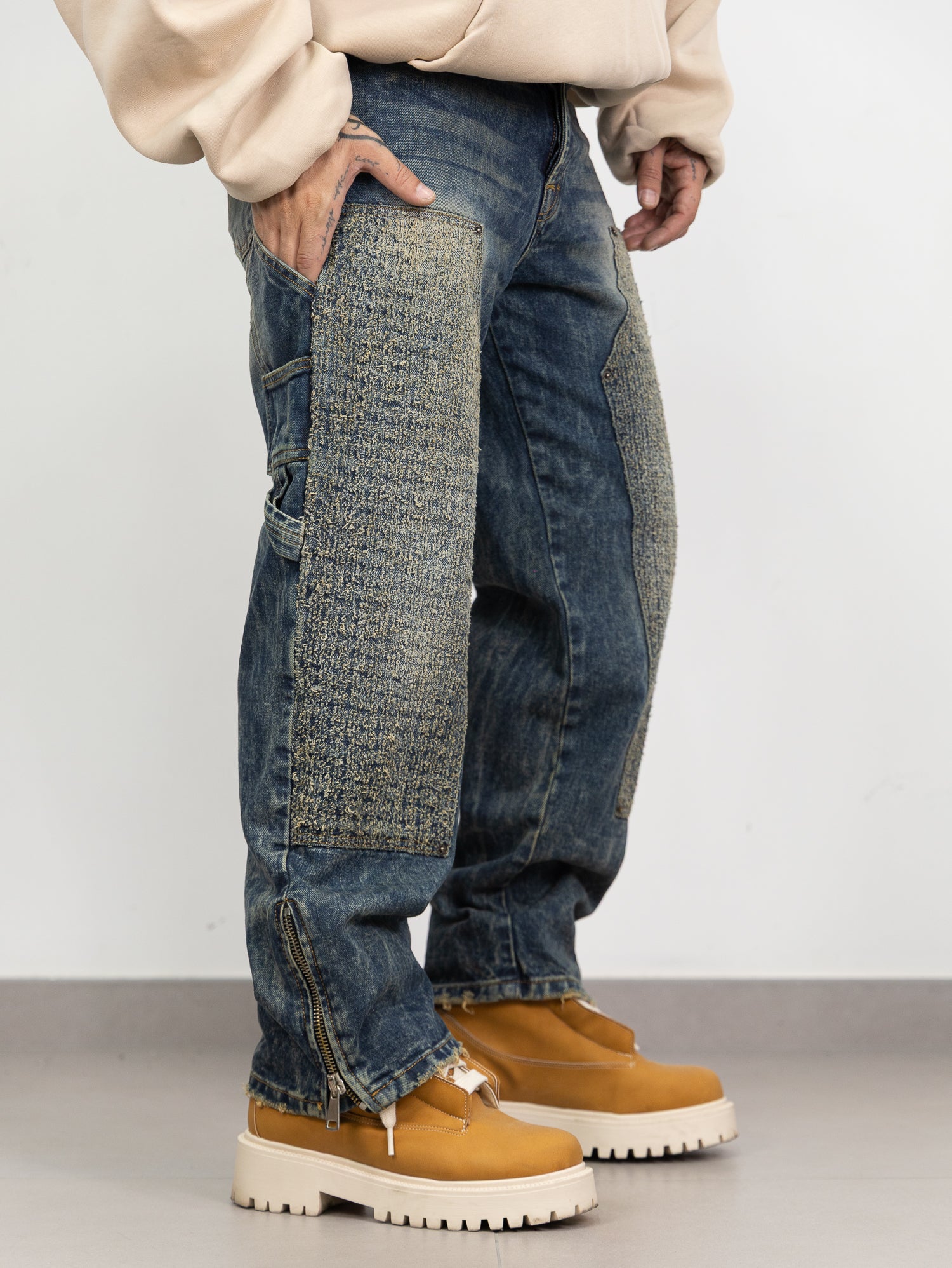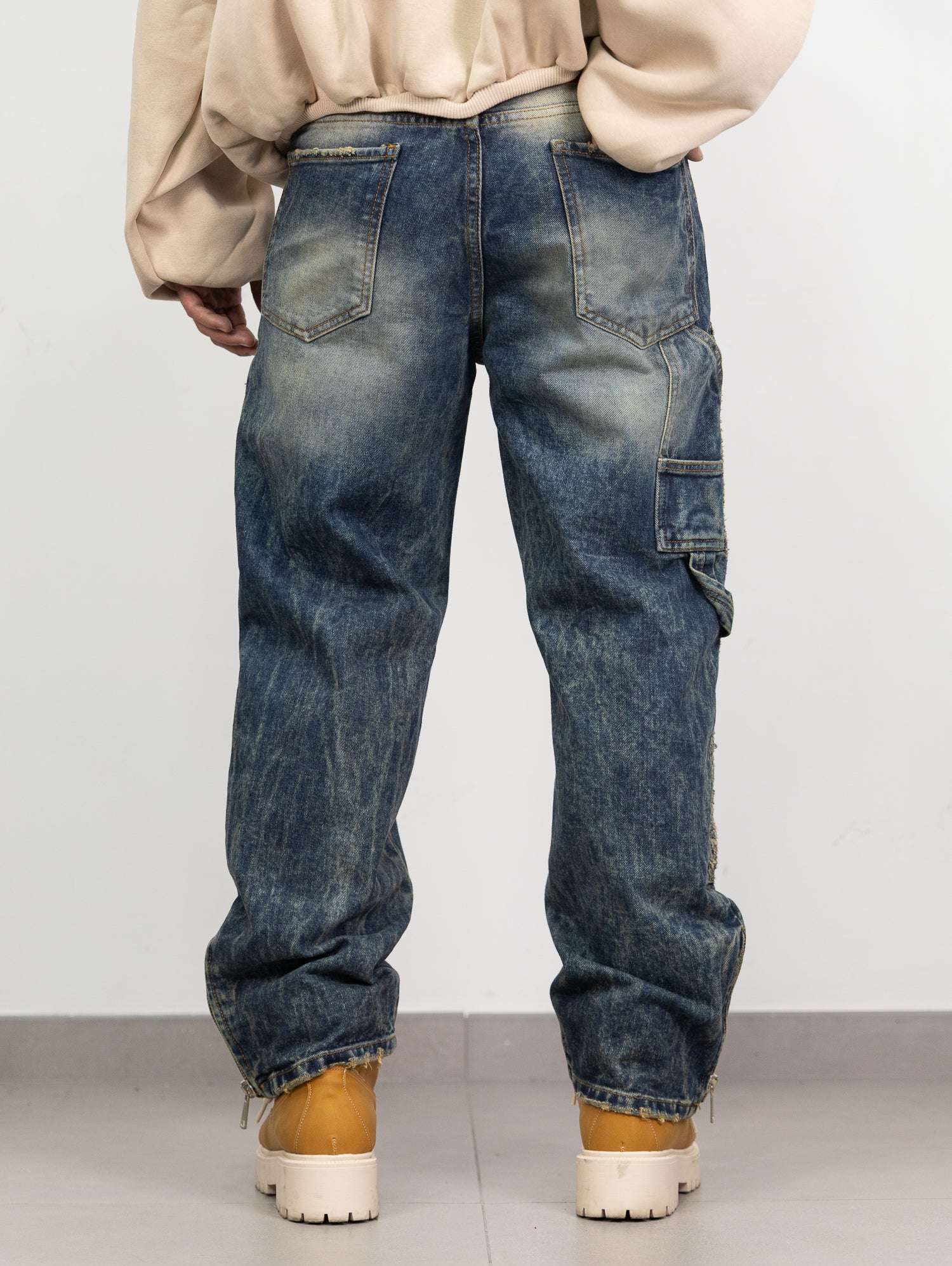 baggy in denim sfumato sabbiato,con dettagli carpenter e zip apribile sul fondo