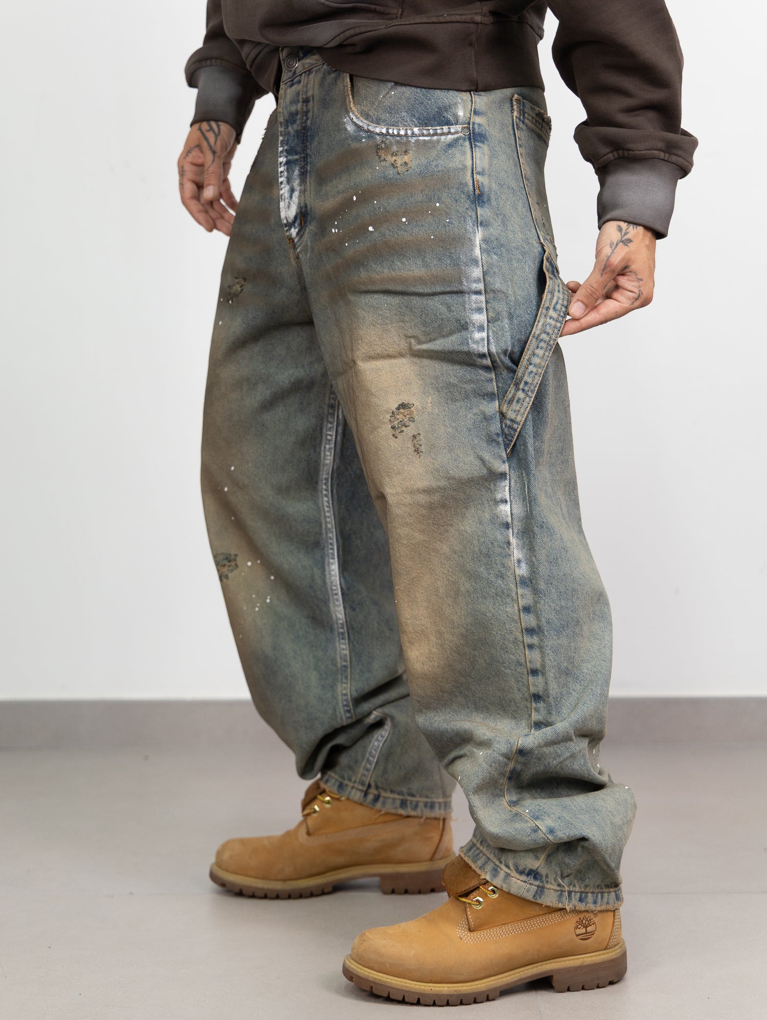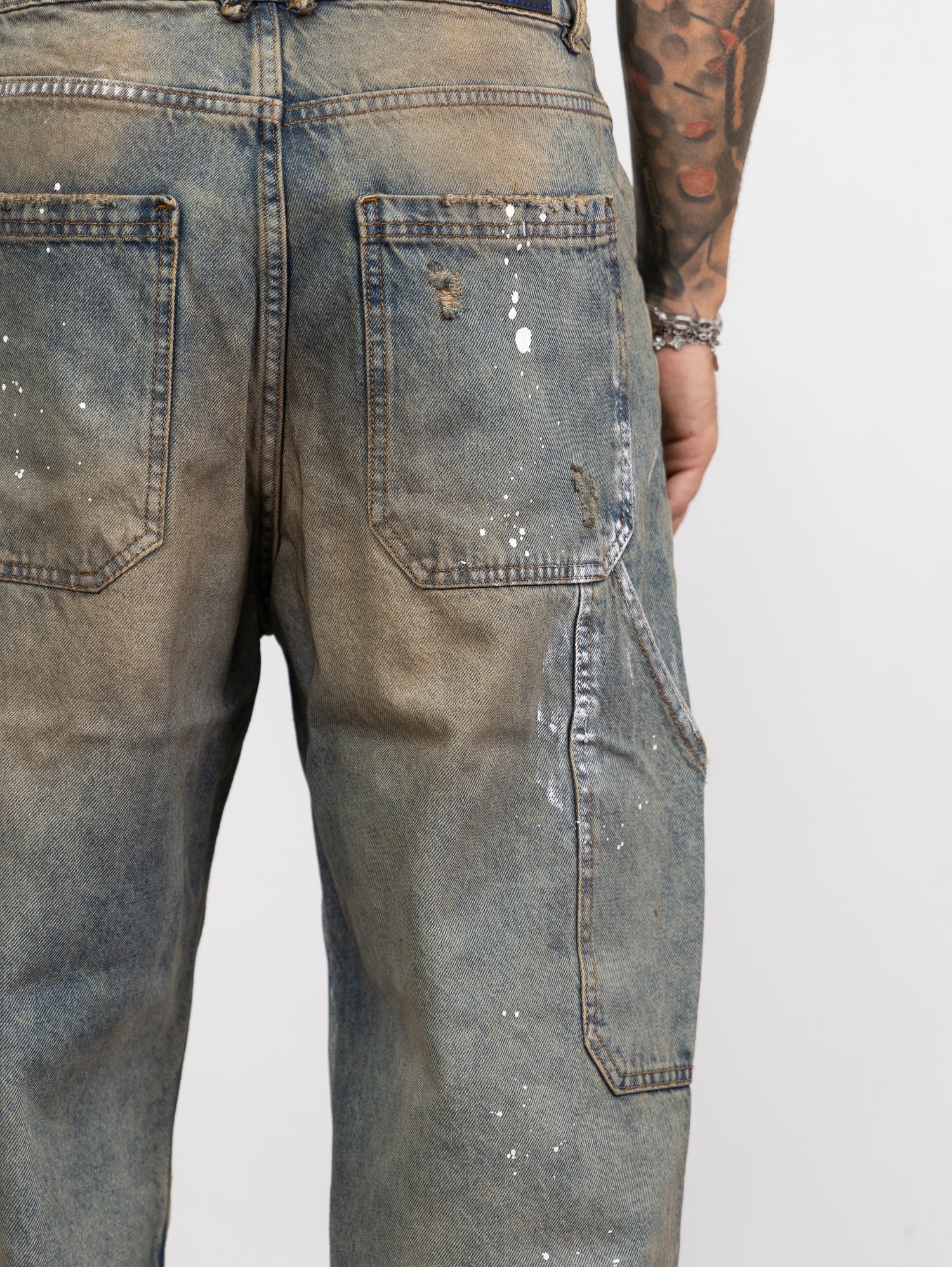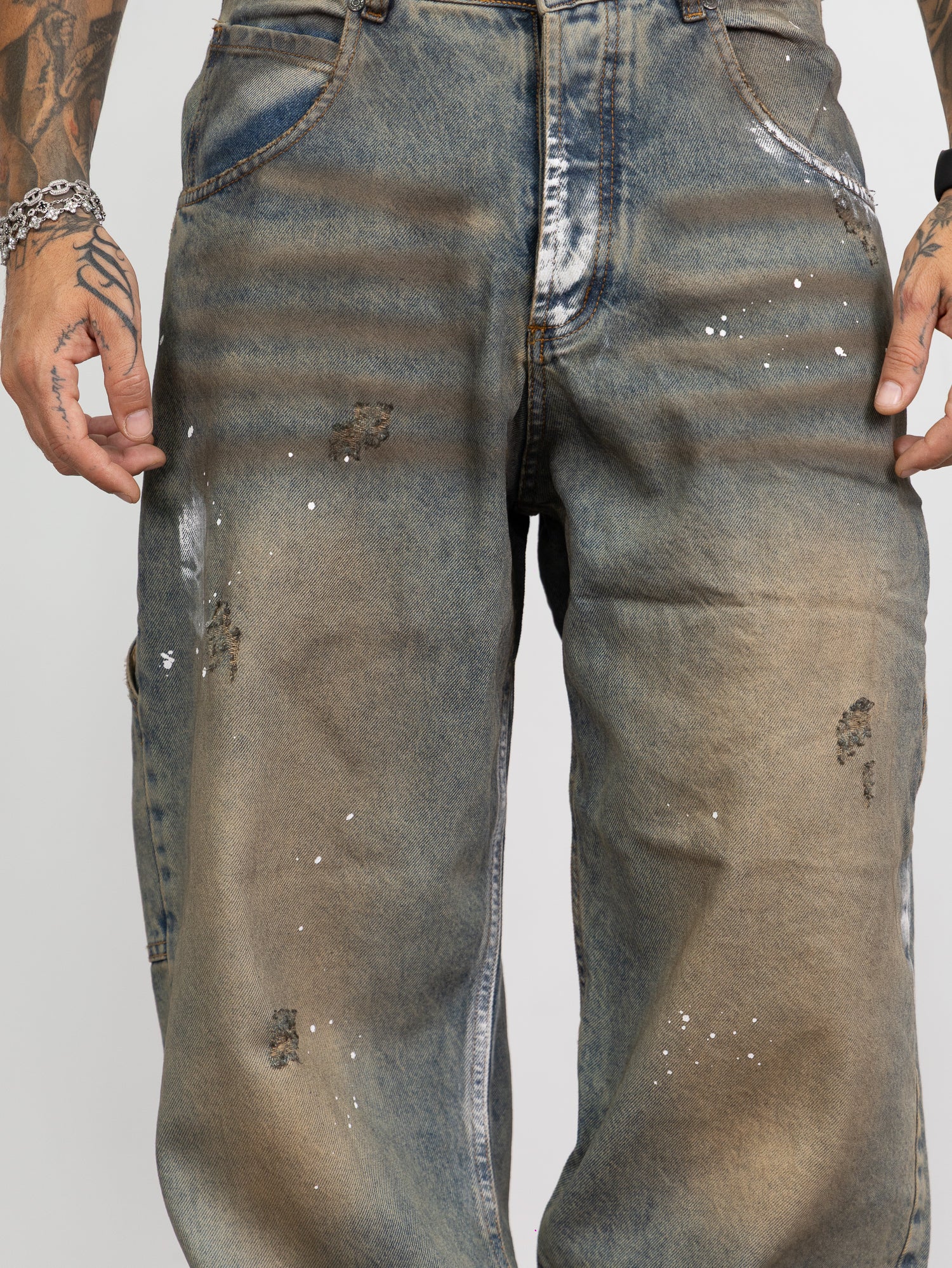 baggy in denim sfumato sabbiato con schizzi di pittura e rotture taglio vivo sul fondo.