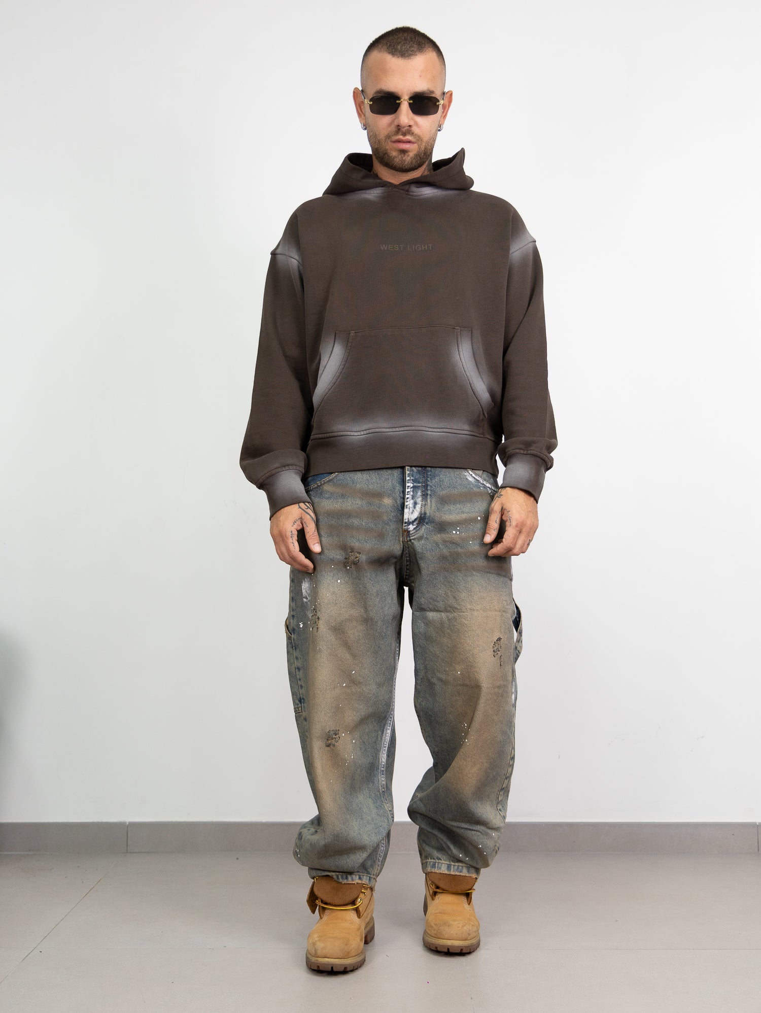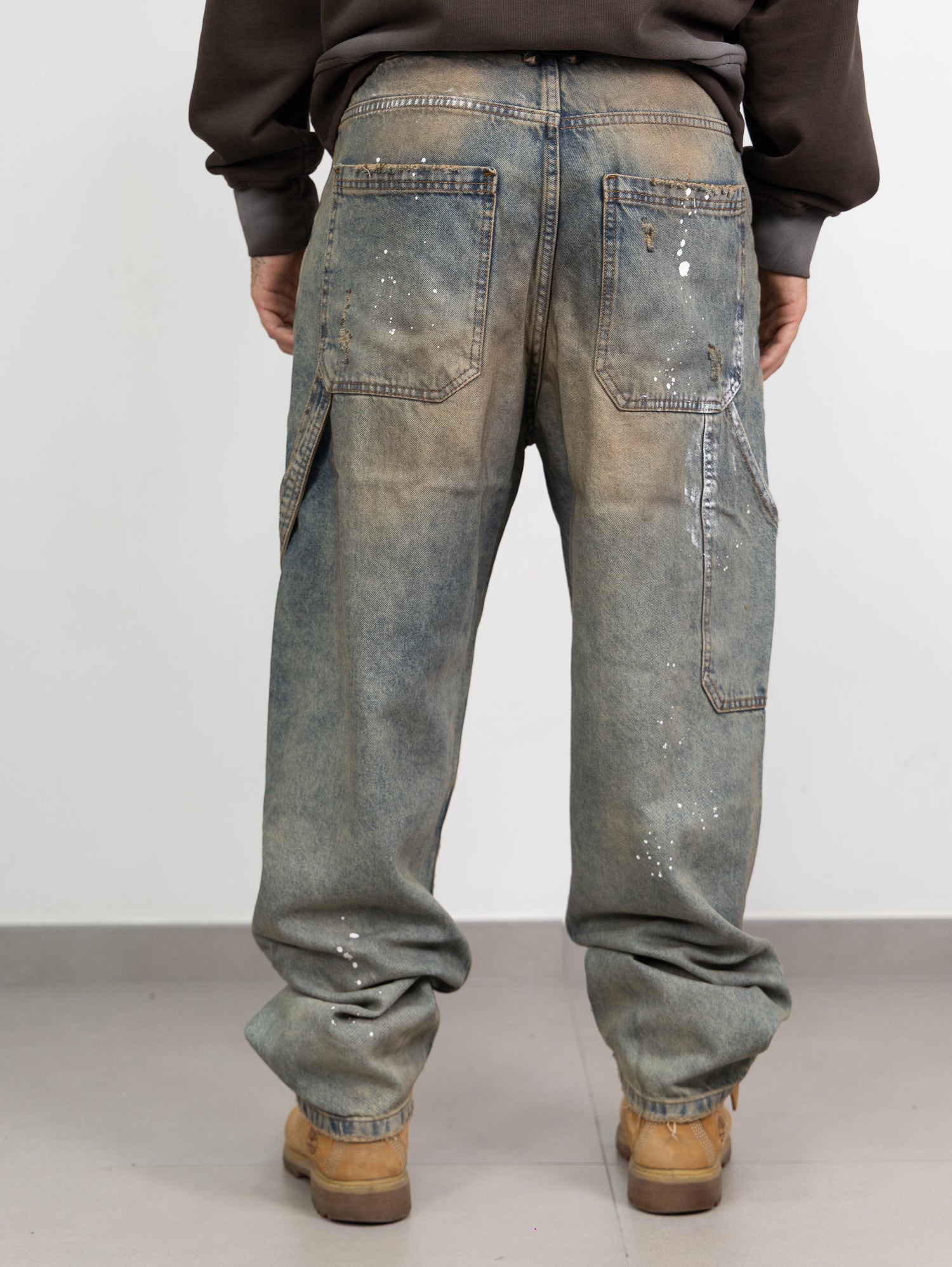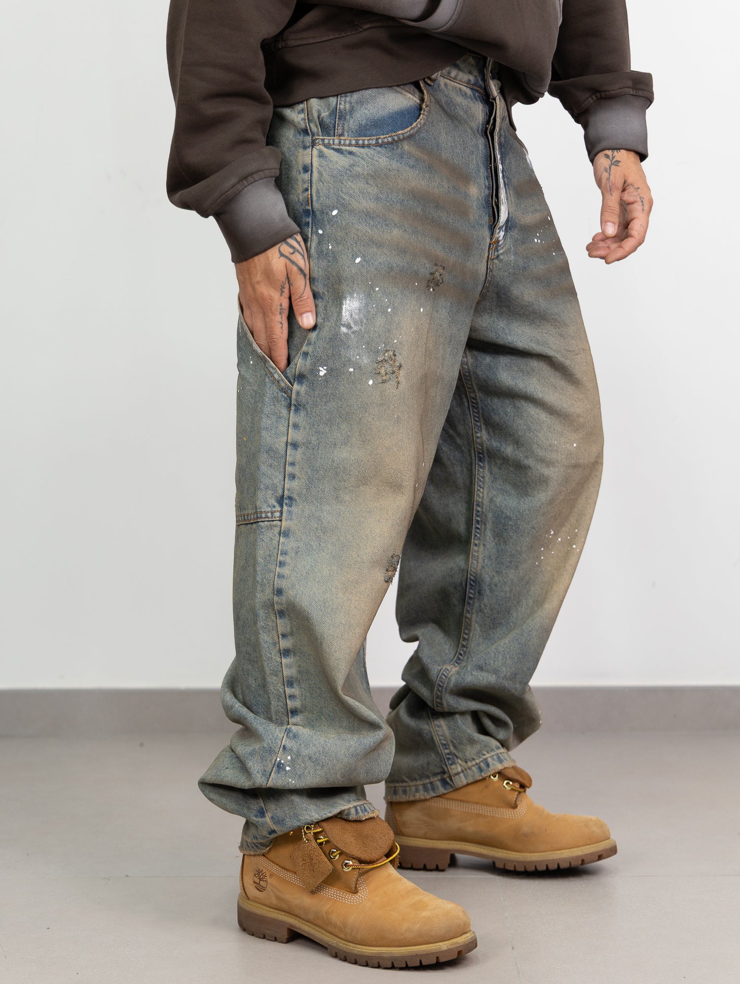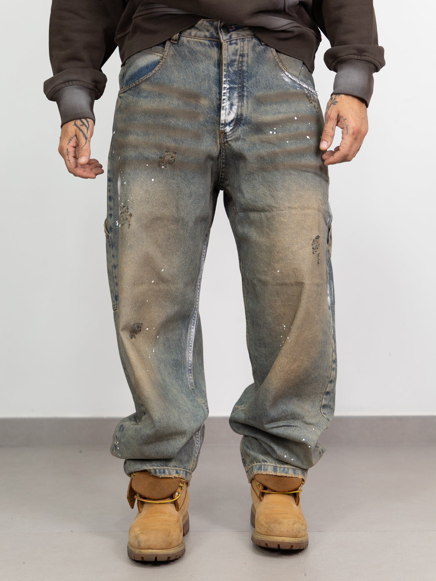 baggy in denim sfumato sabbiato con schizzi di pittura e rotture taglio vivo sul fondo.