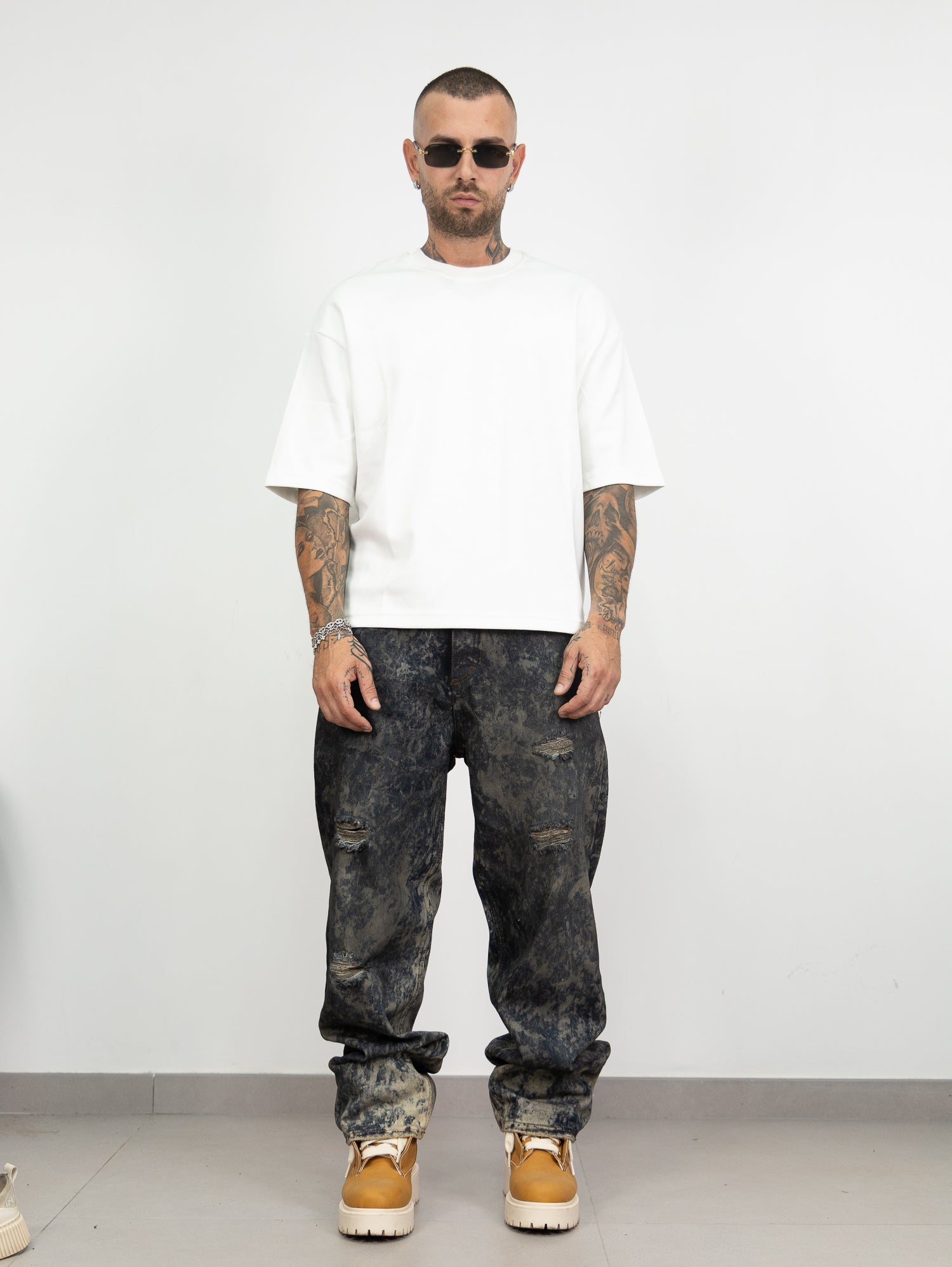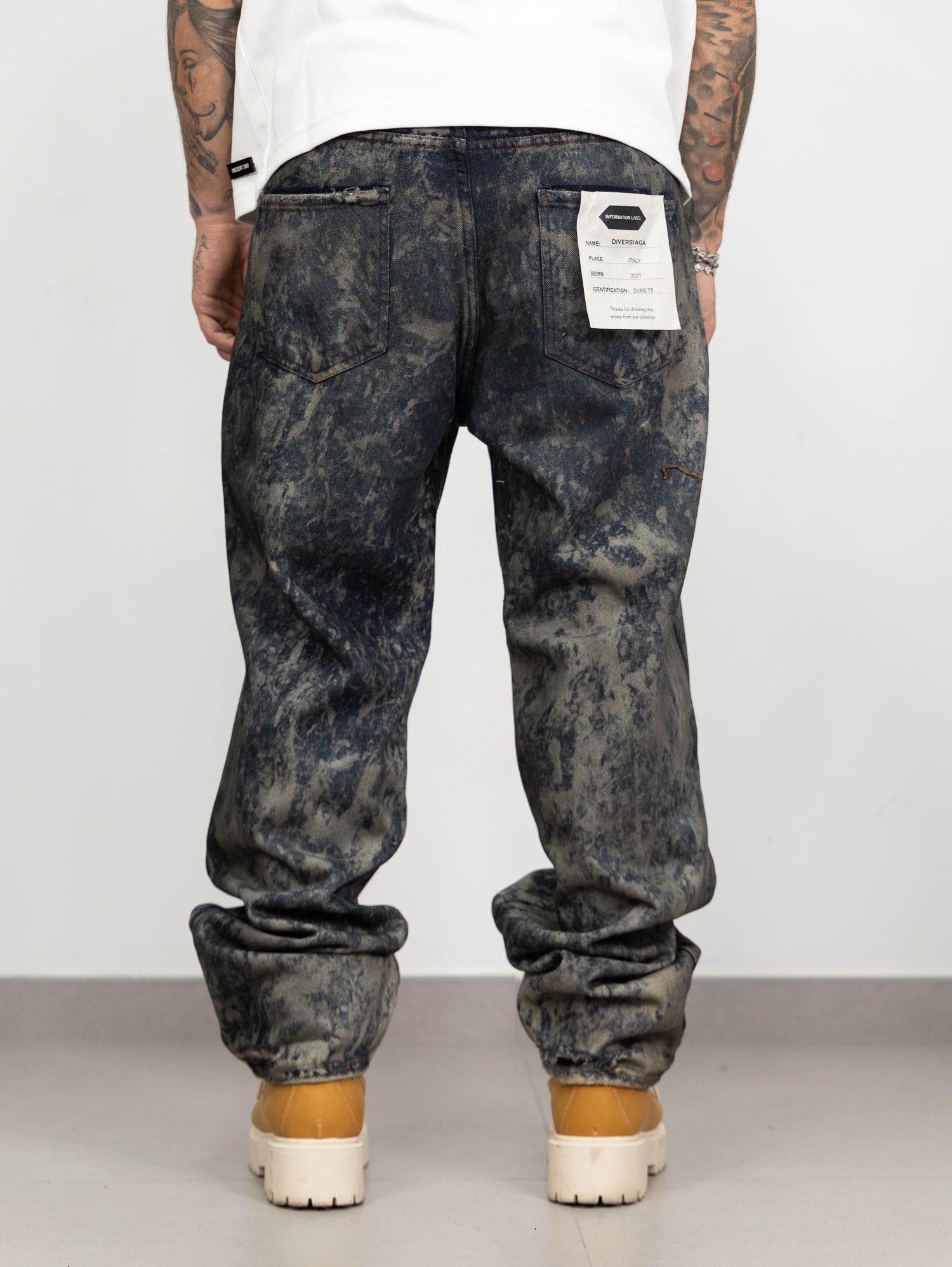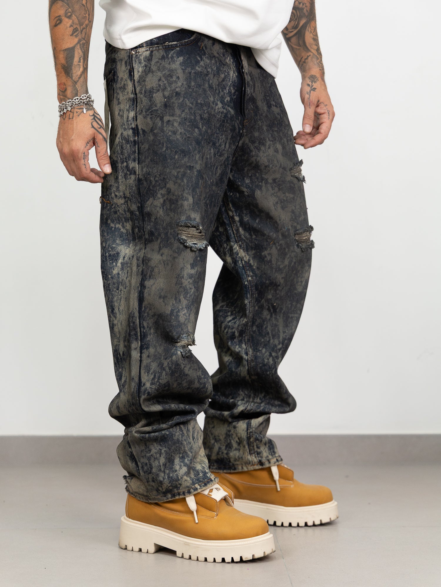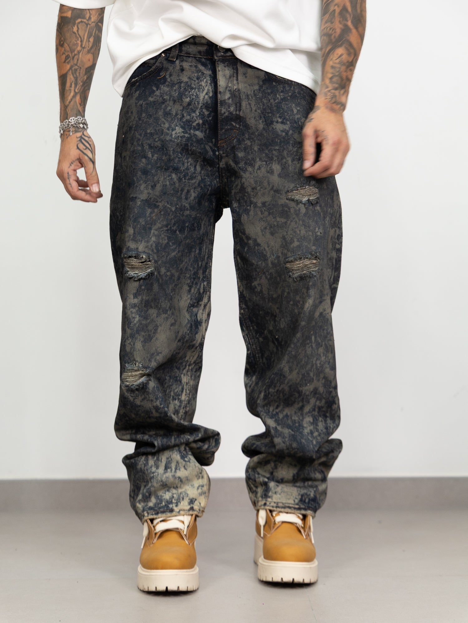 Denim con lavaggio gel sfumato a contrasto,con rotture frontali.
