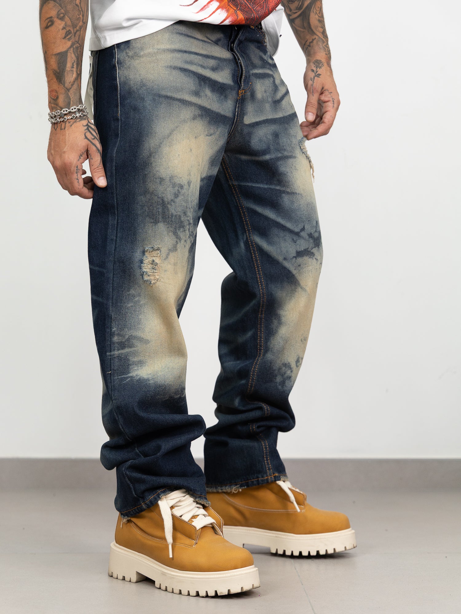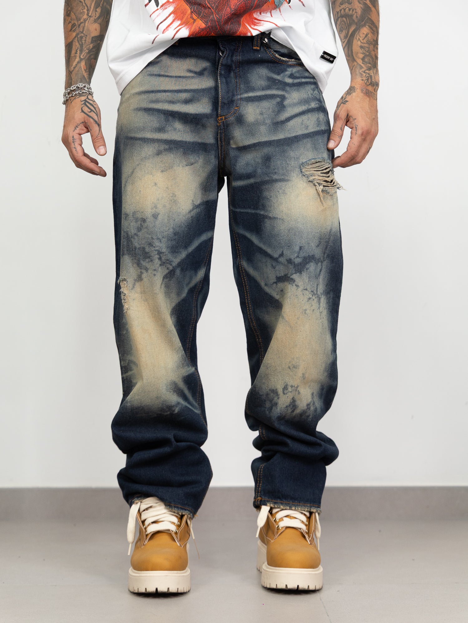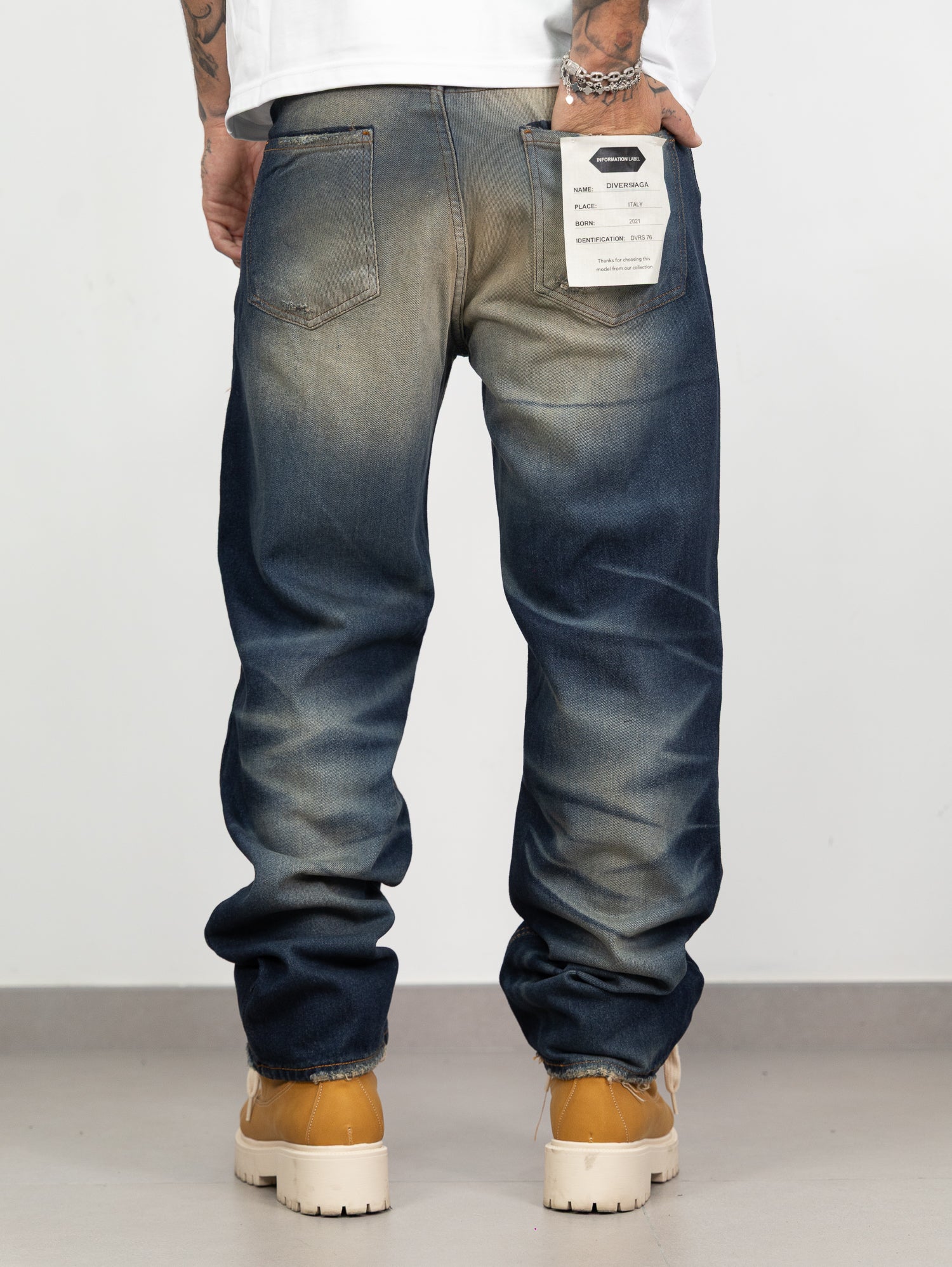 Denim con sfumature sabbiate fronte retro a contrasto,rotture frontali e dettaglio cucito sul retro.
