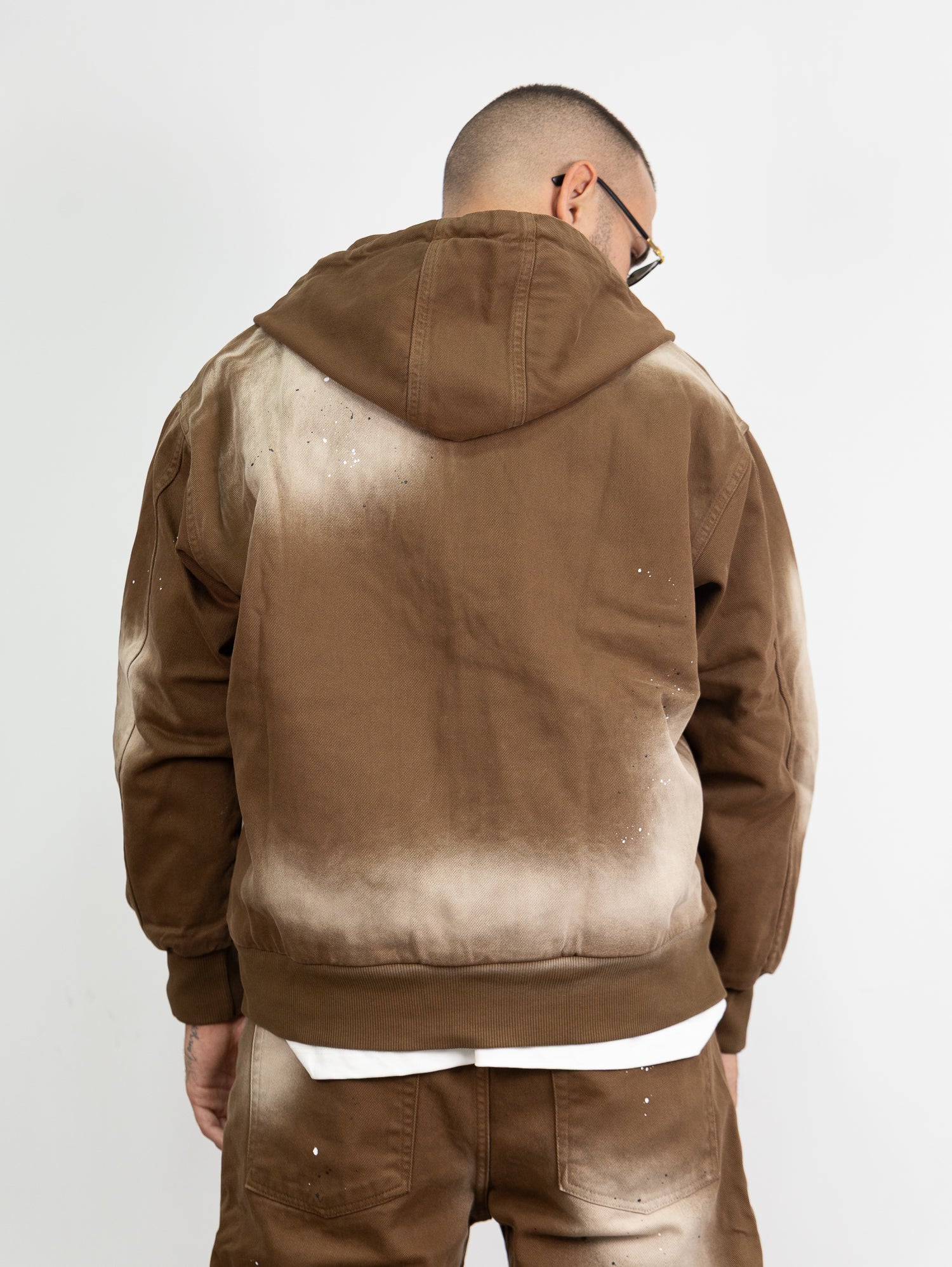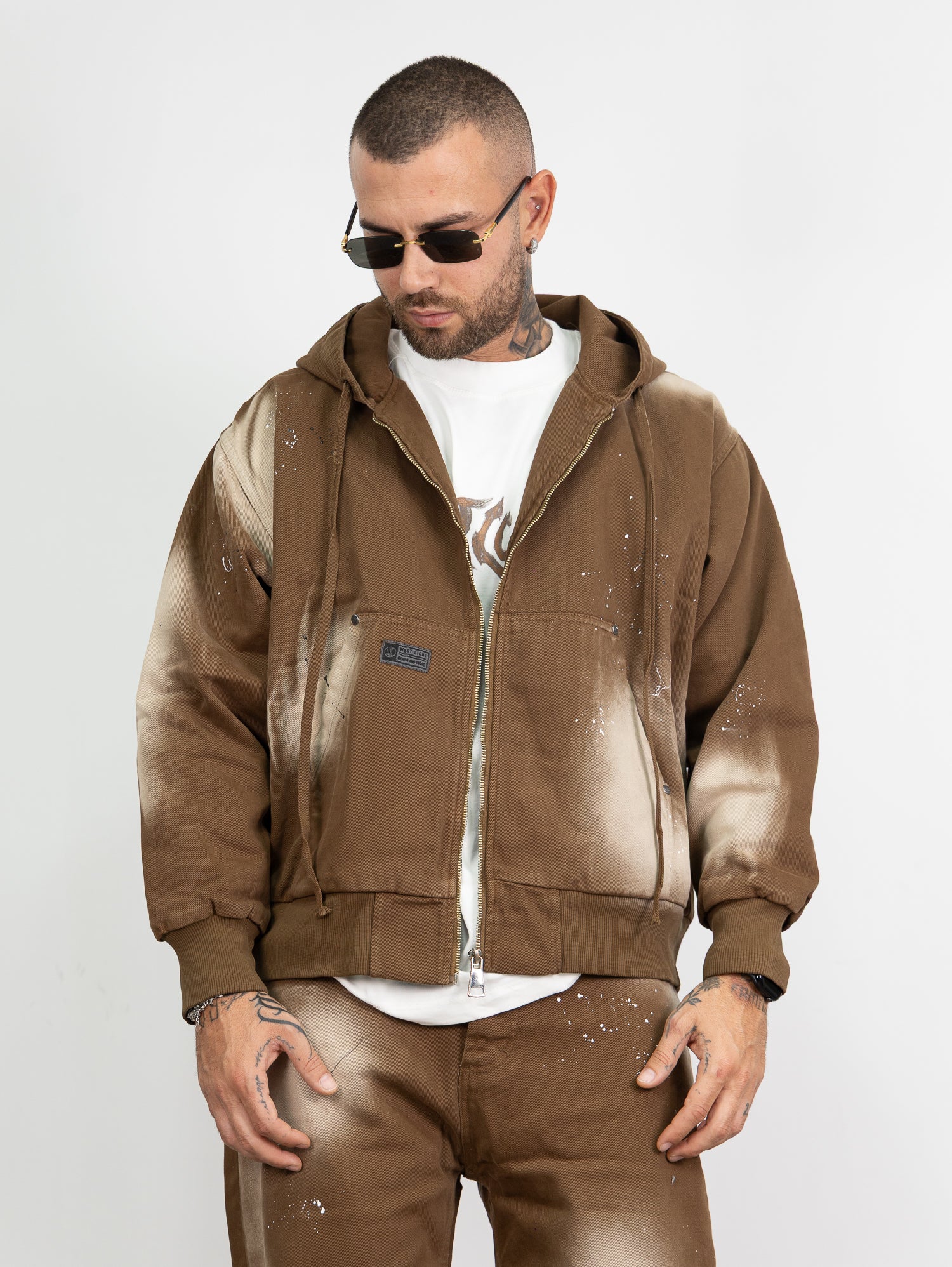 jacket\felpa trapuntato all'interno over size con zip apribile,cappuccio,schizzi di pitture con colori a contrasto