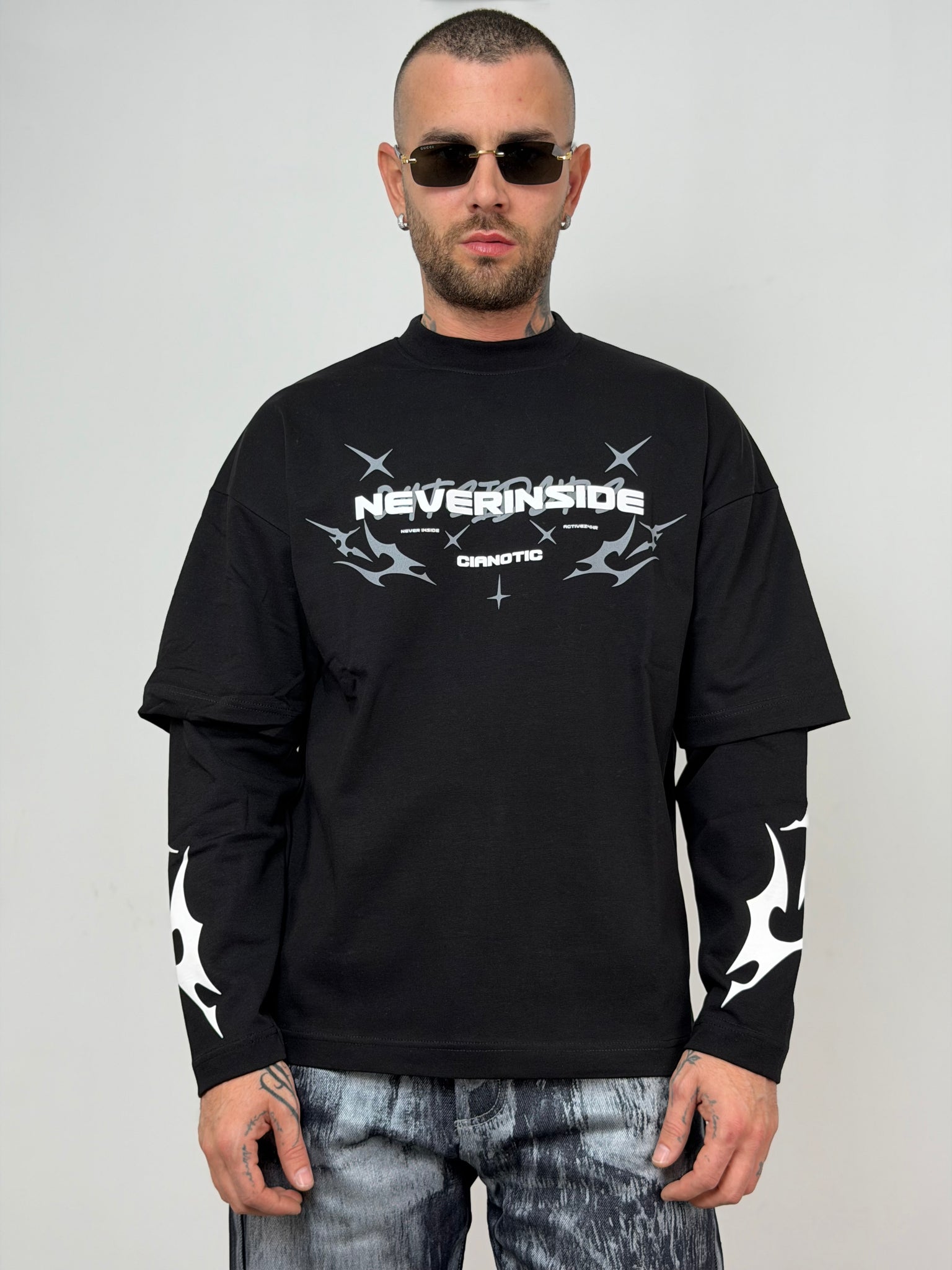 t-shirt doppia manica con stampa frontale e lungo le maniche a contrasto