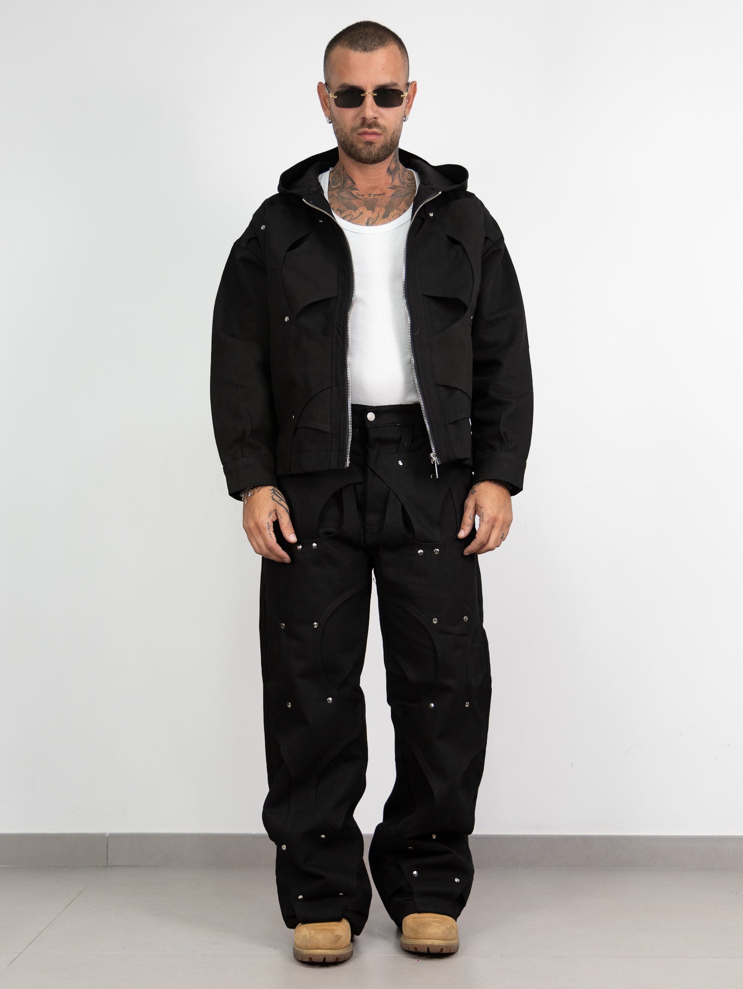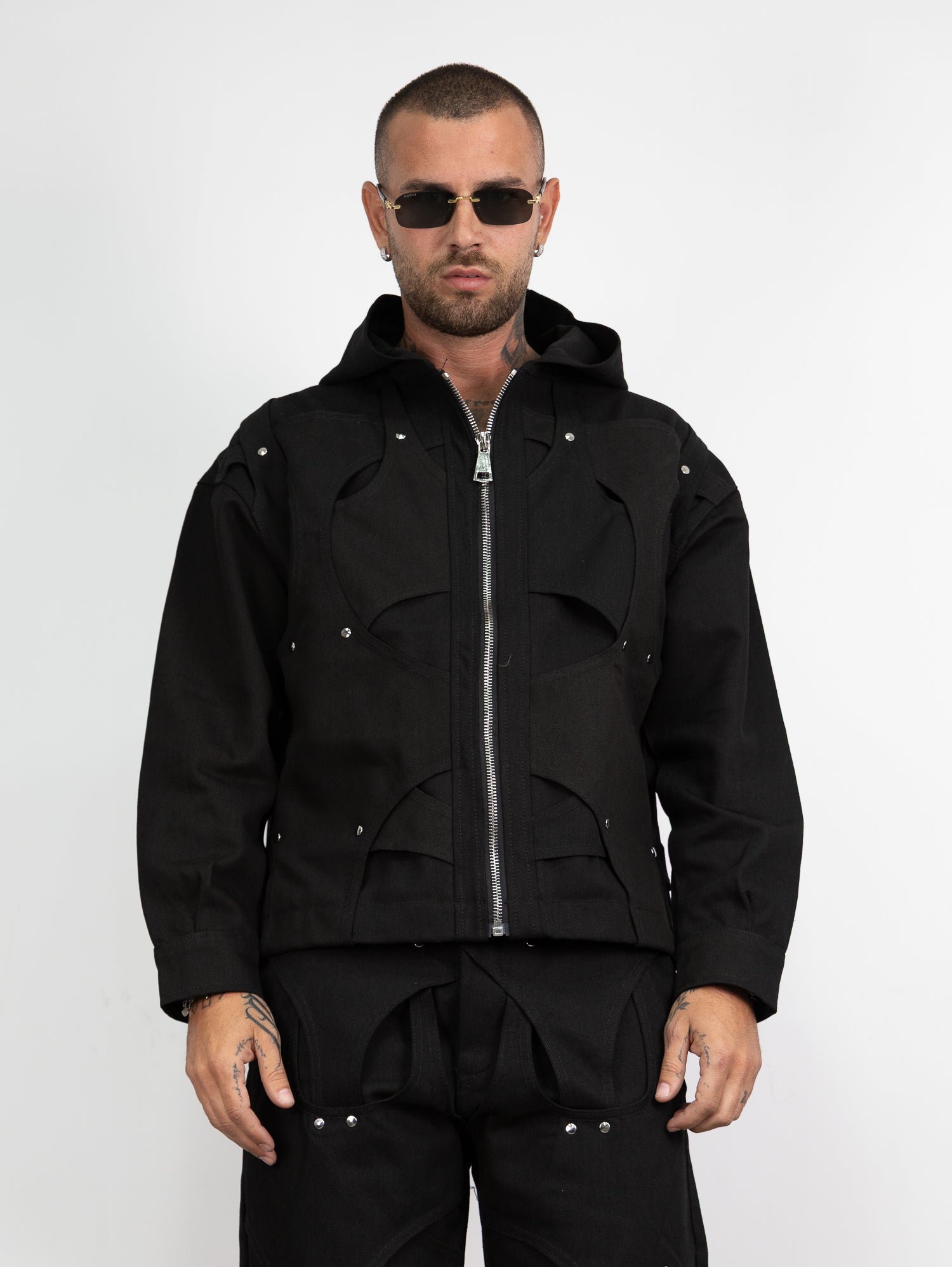 jacket con cappuccio,zip apribile e patch cucite colore su colore