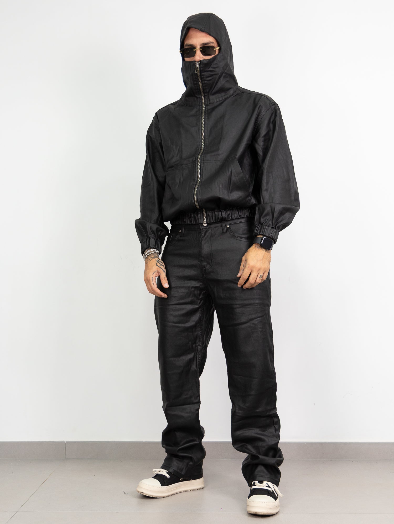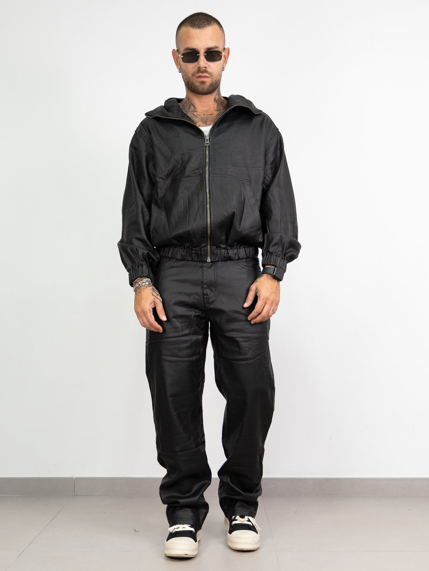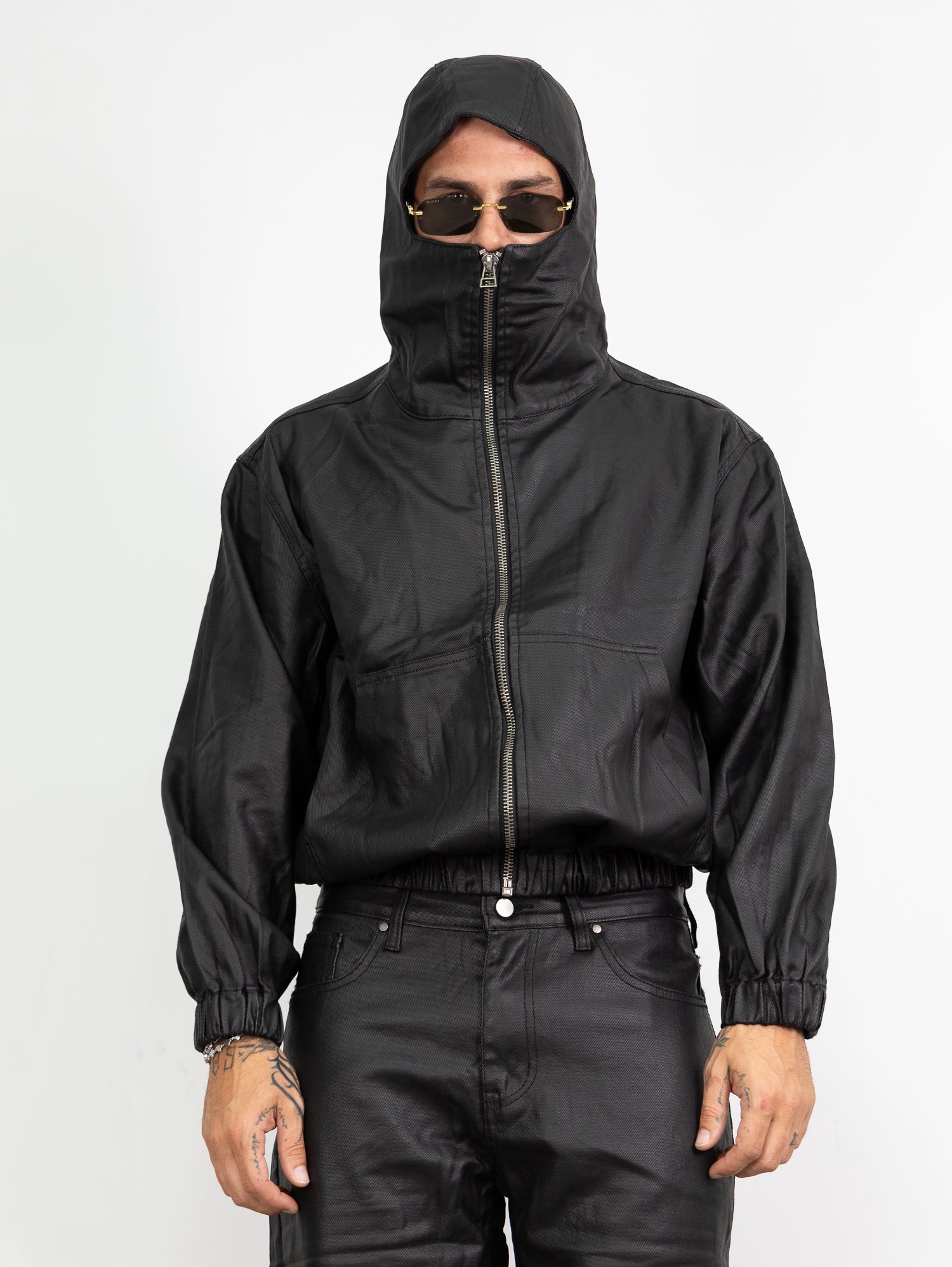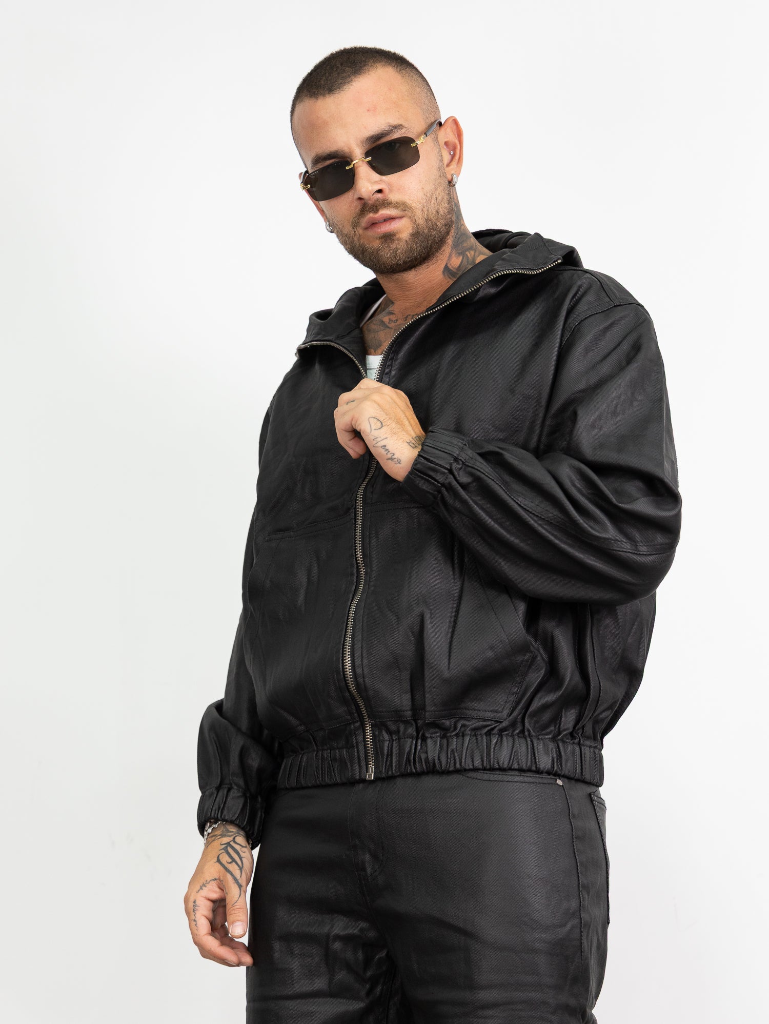 Jacket in ecopelle con zip frontale apribile,cappuccio,tascone ed elastico sul fondo e lungo i polsi.