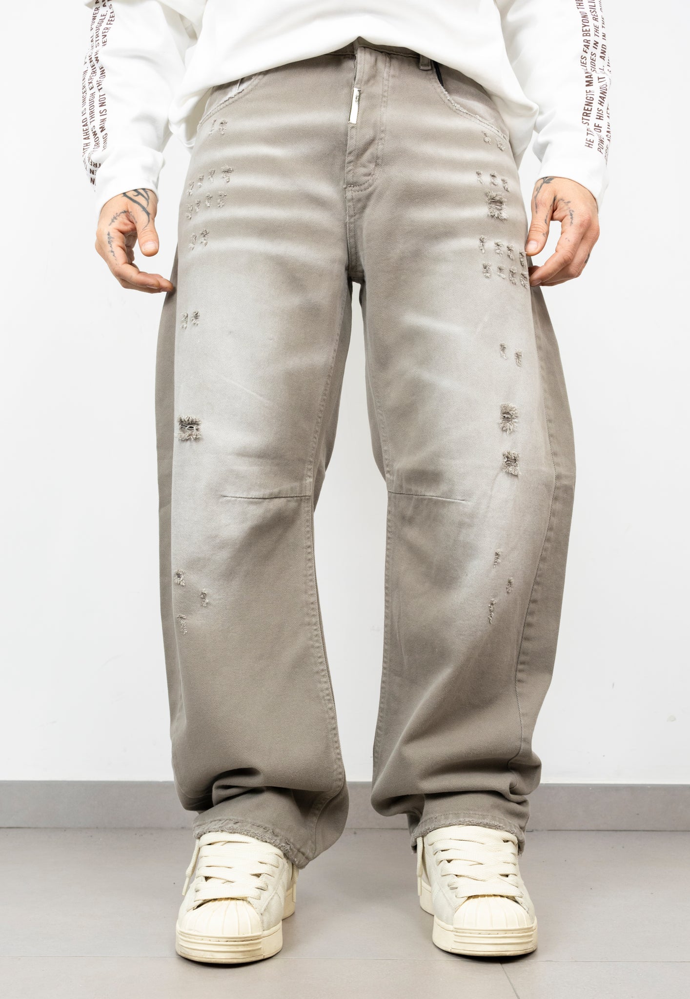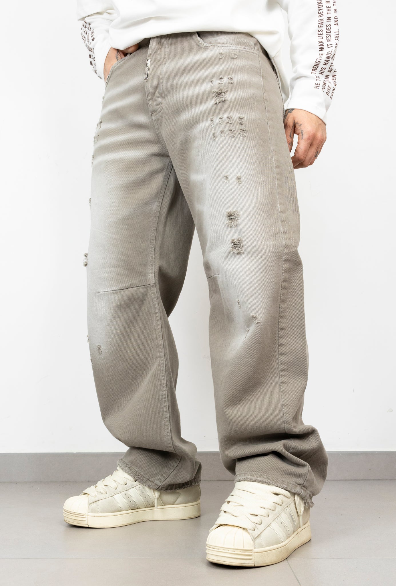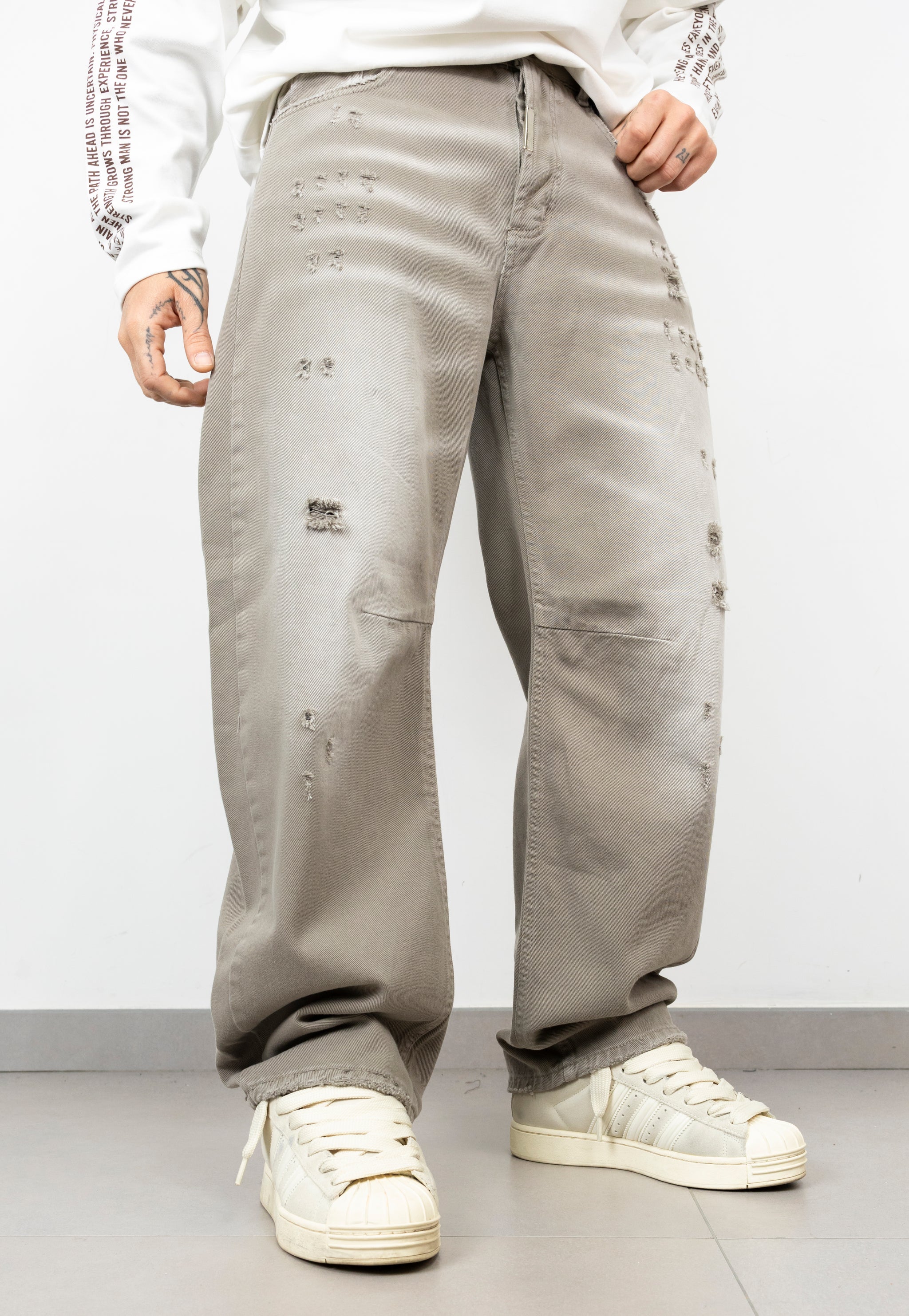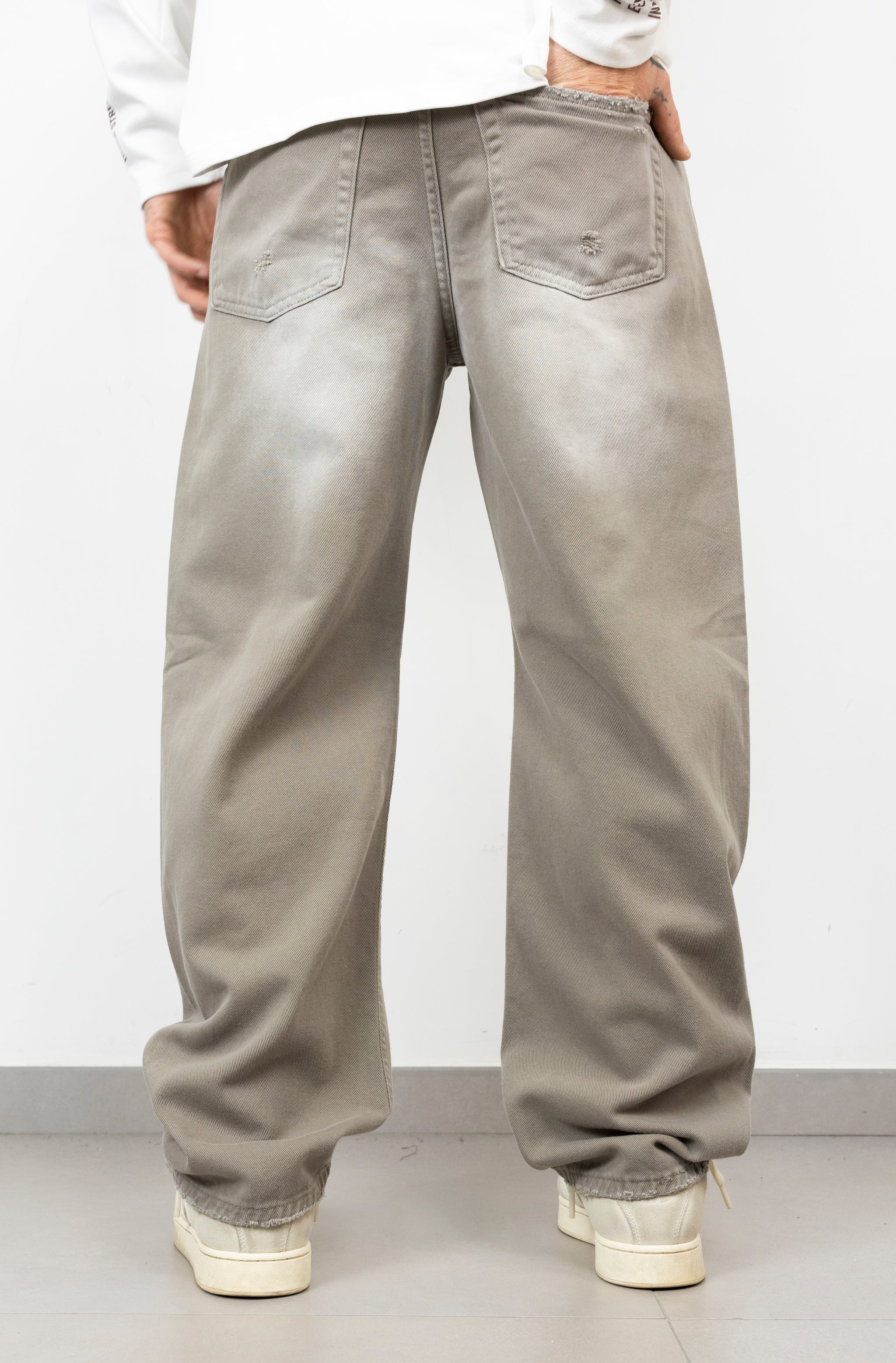 ballon in denim con rotture taglio vivo fronte,retro e sul fondo
