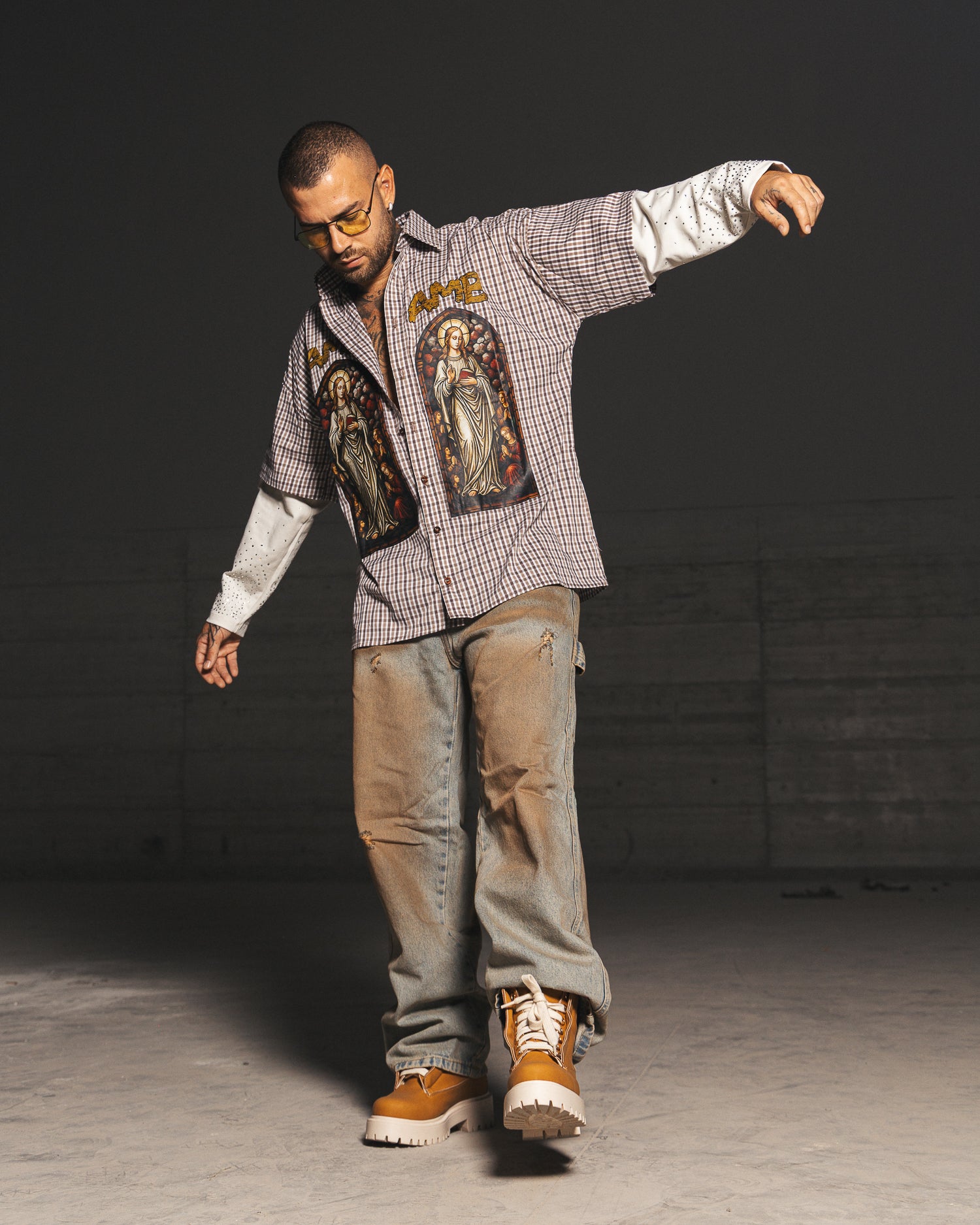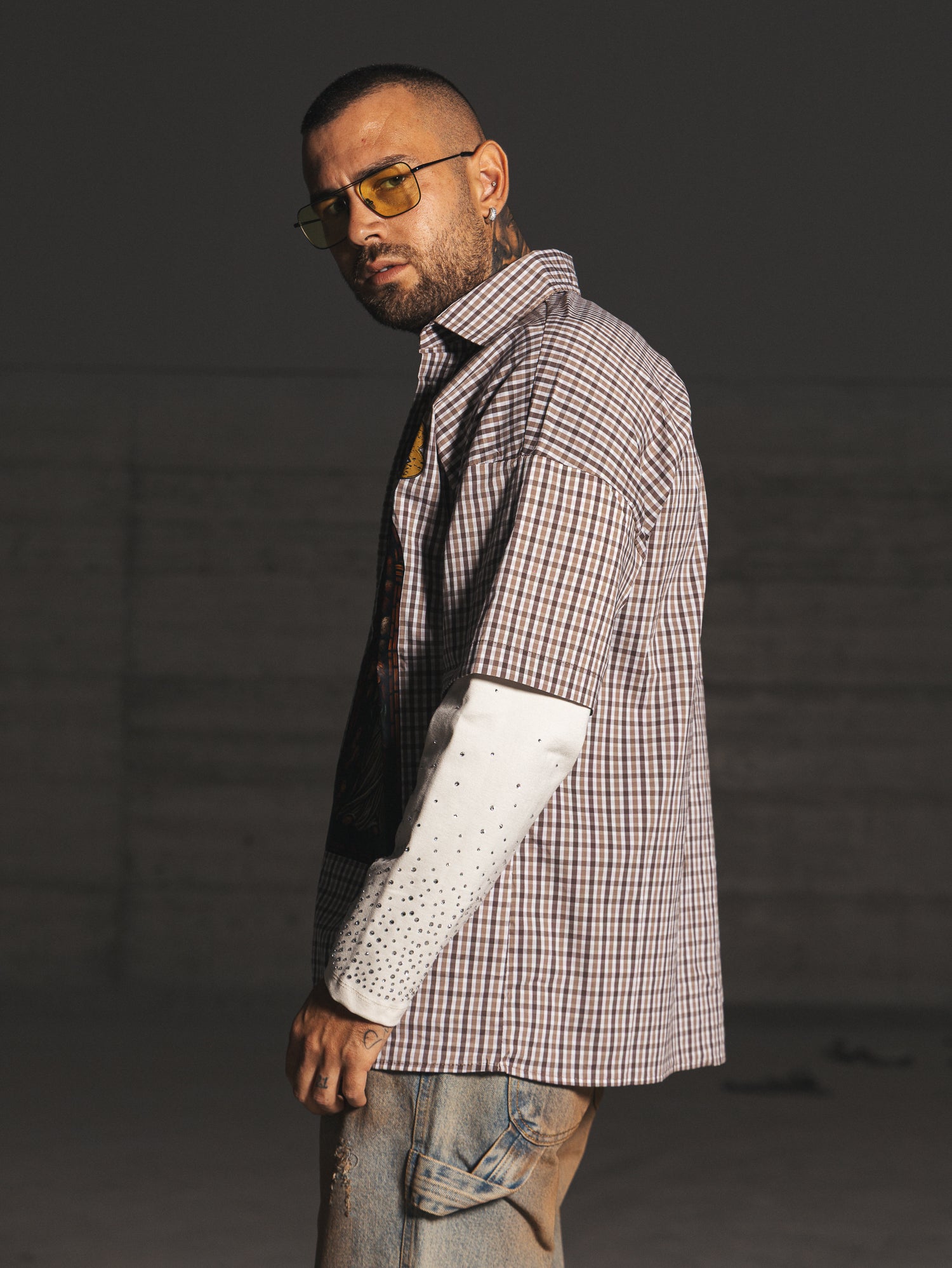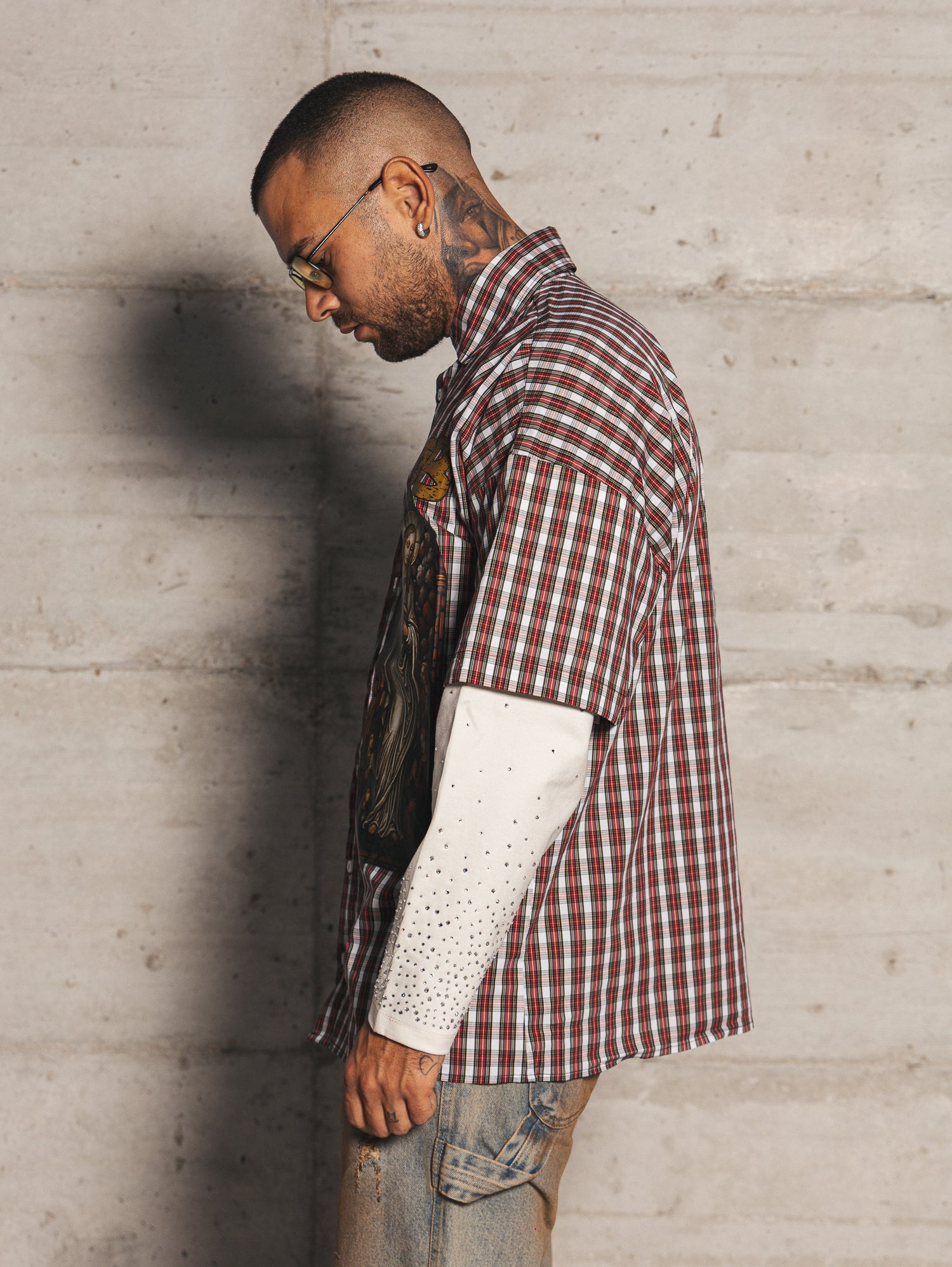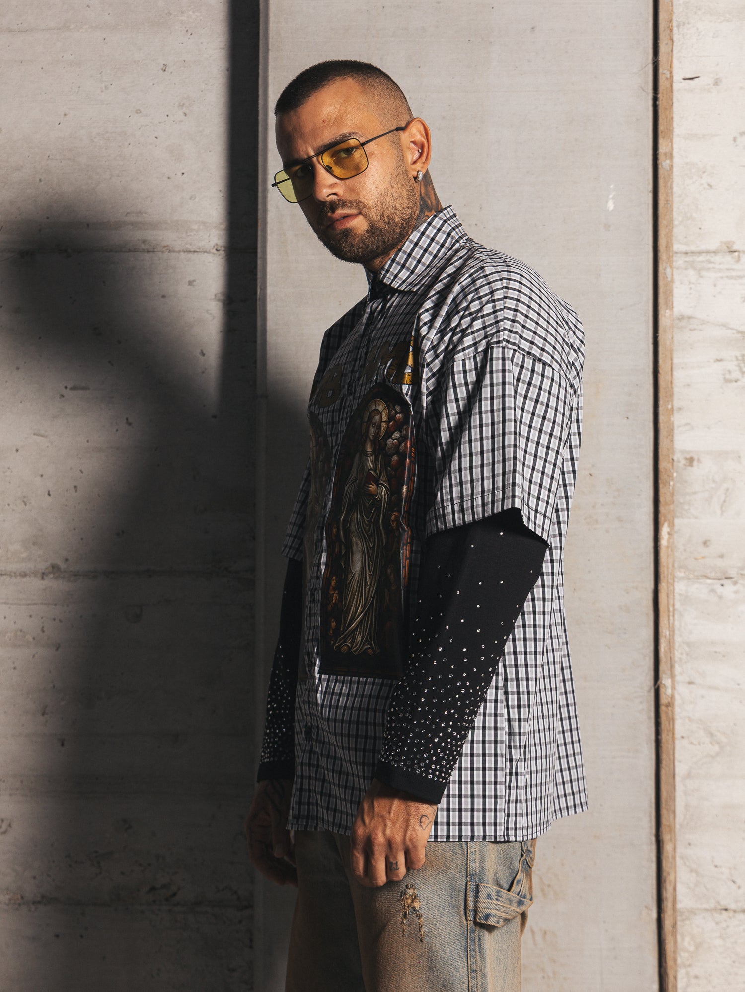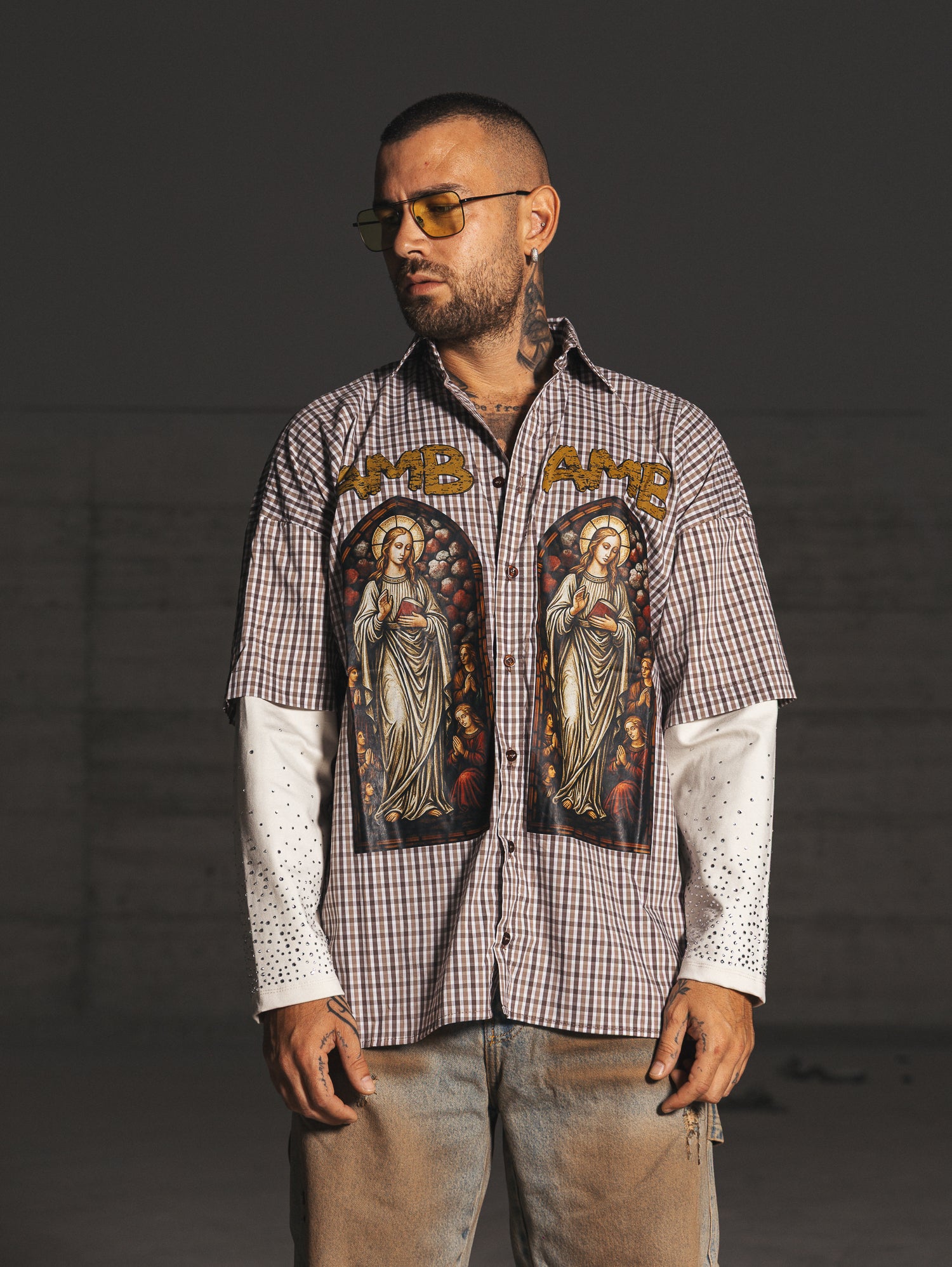 Camicia oversize,doppio tessuto,con doppia manica,bottoni frontali apribili,strass e stampa frontale.
