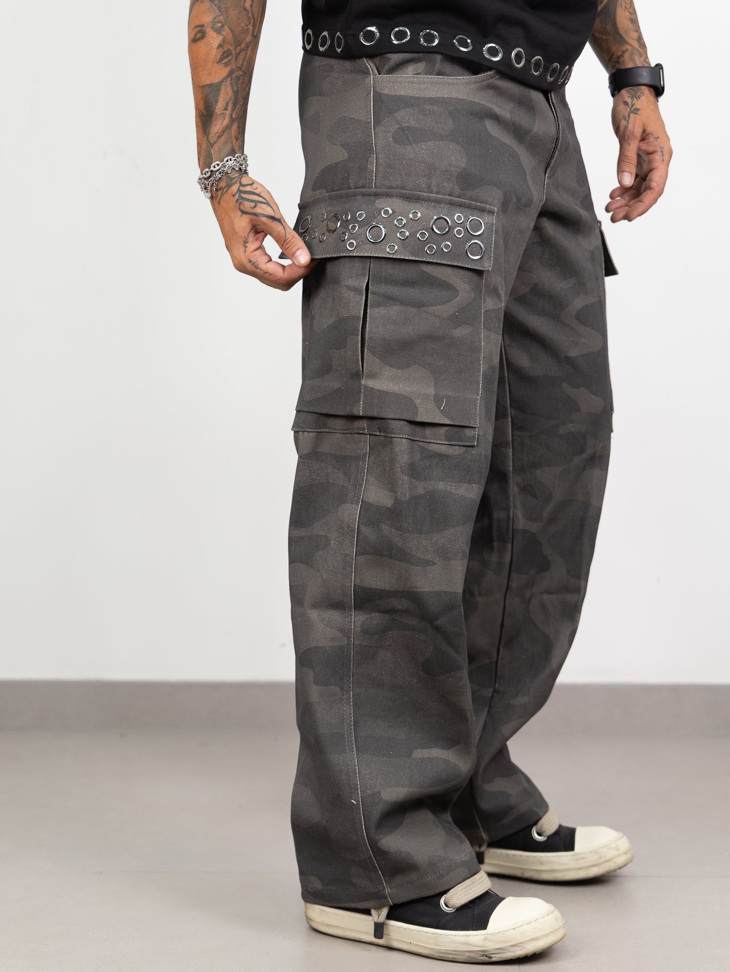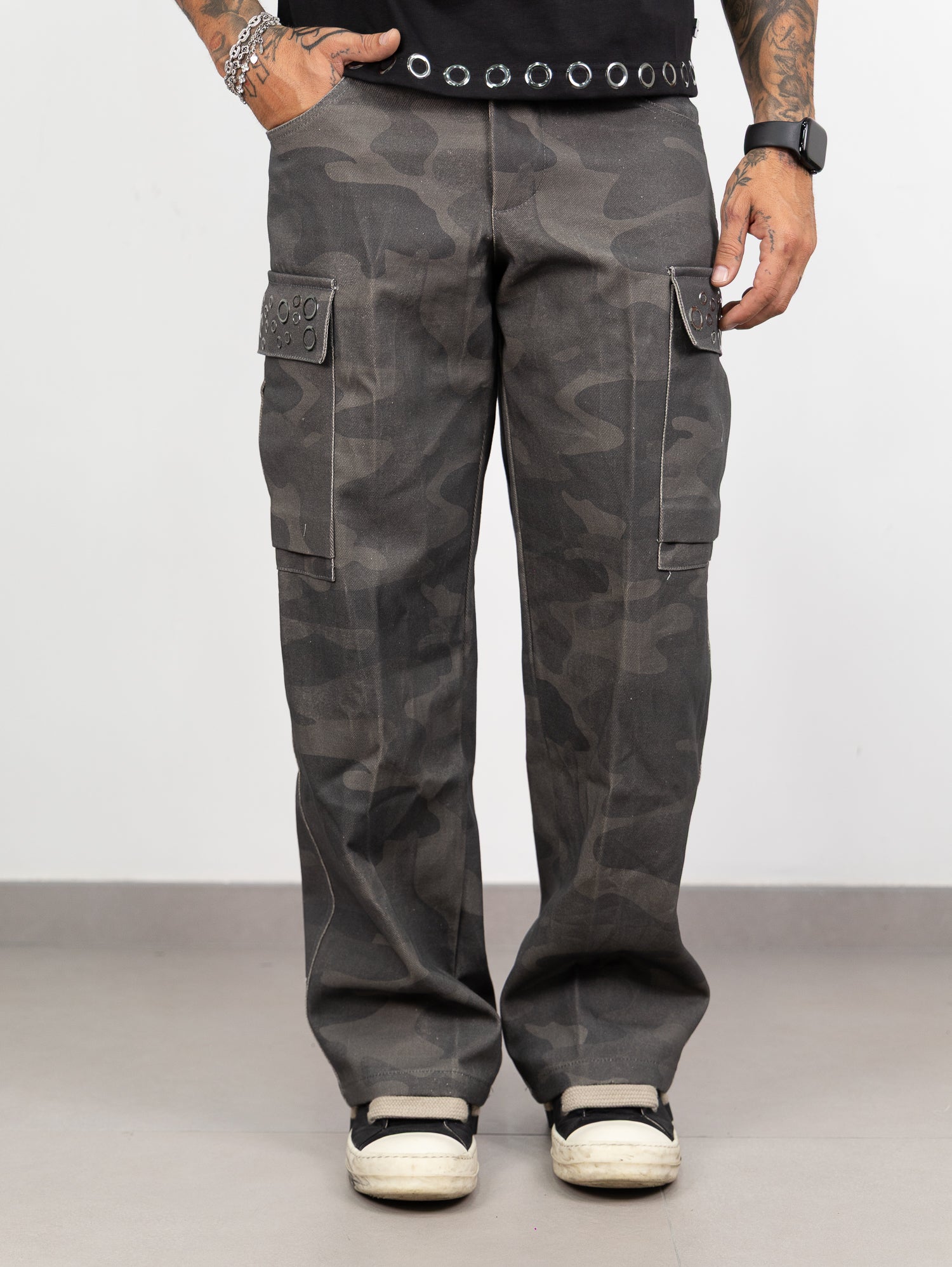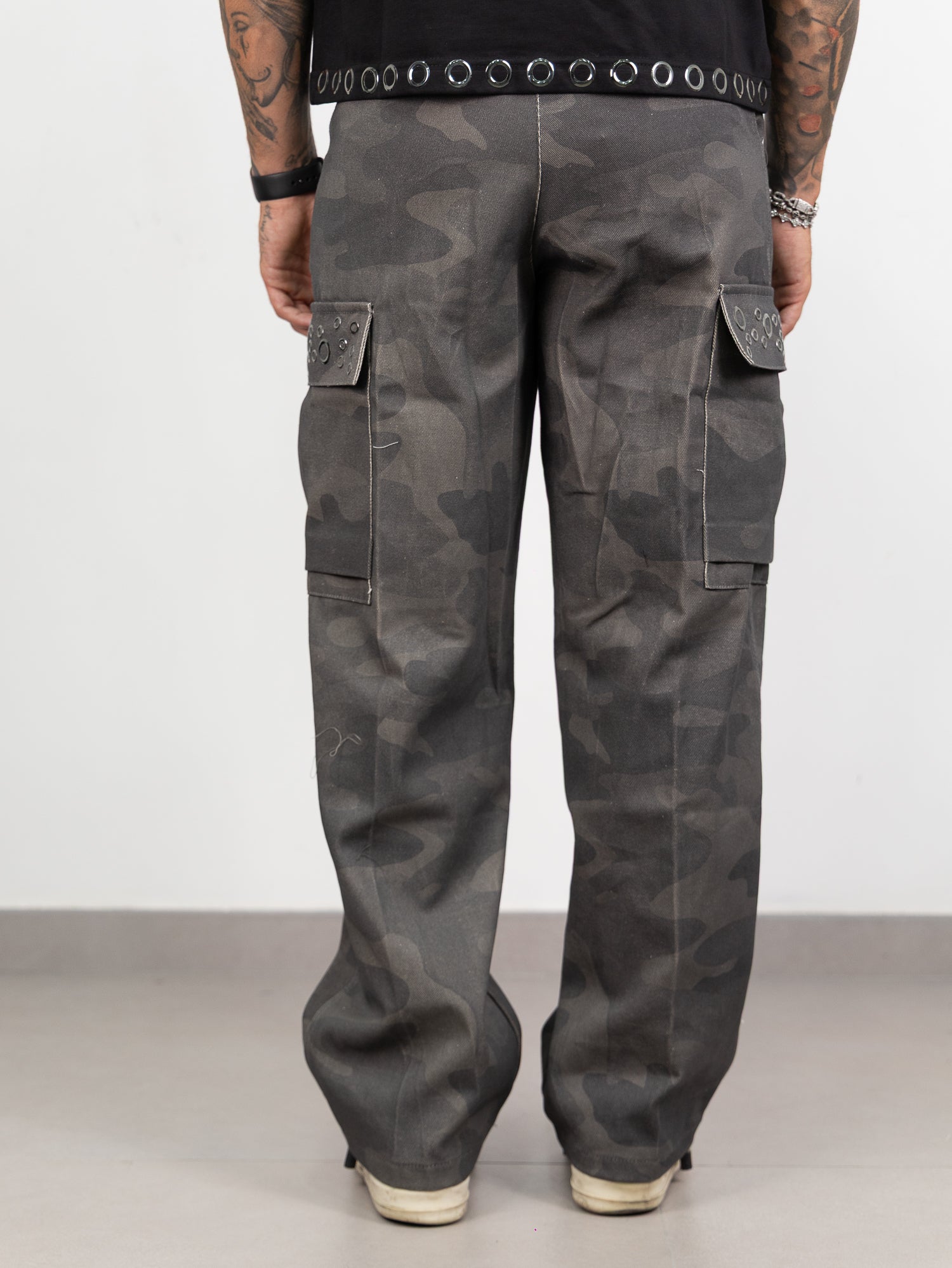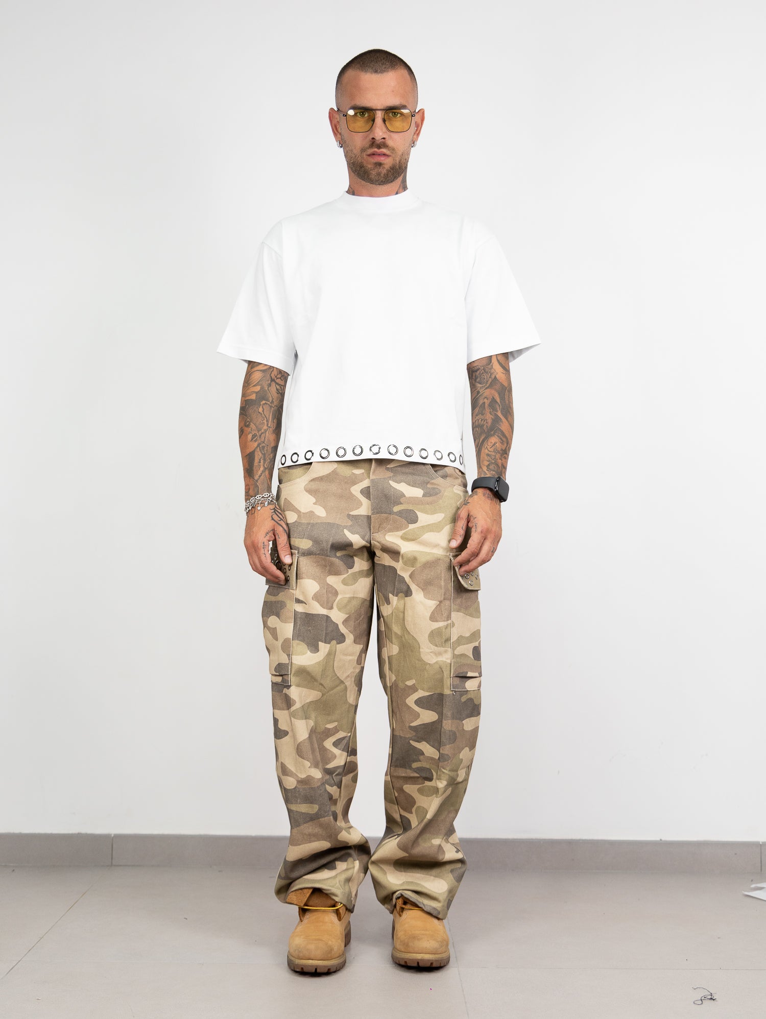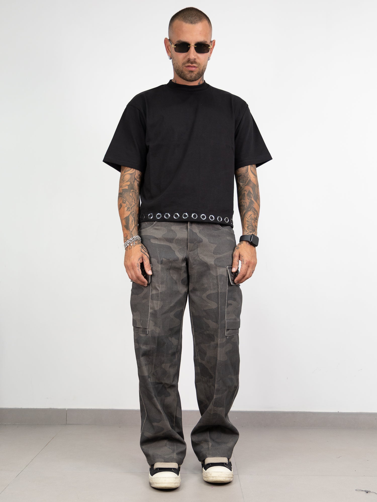 Cargo in denim mimetico con elastico e bottone in vita, con tasconi frontali con applicazione di occhielli.