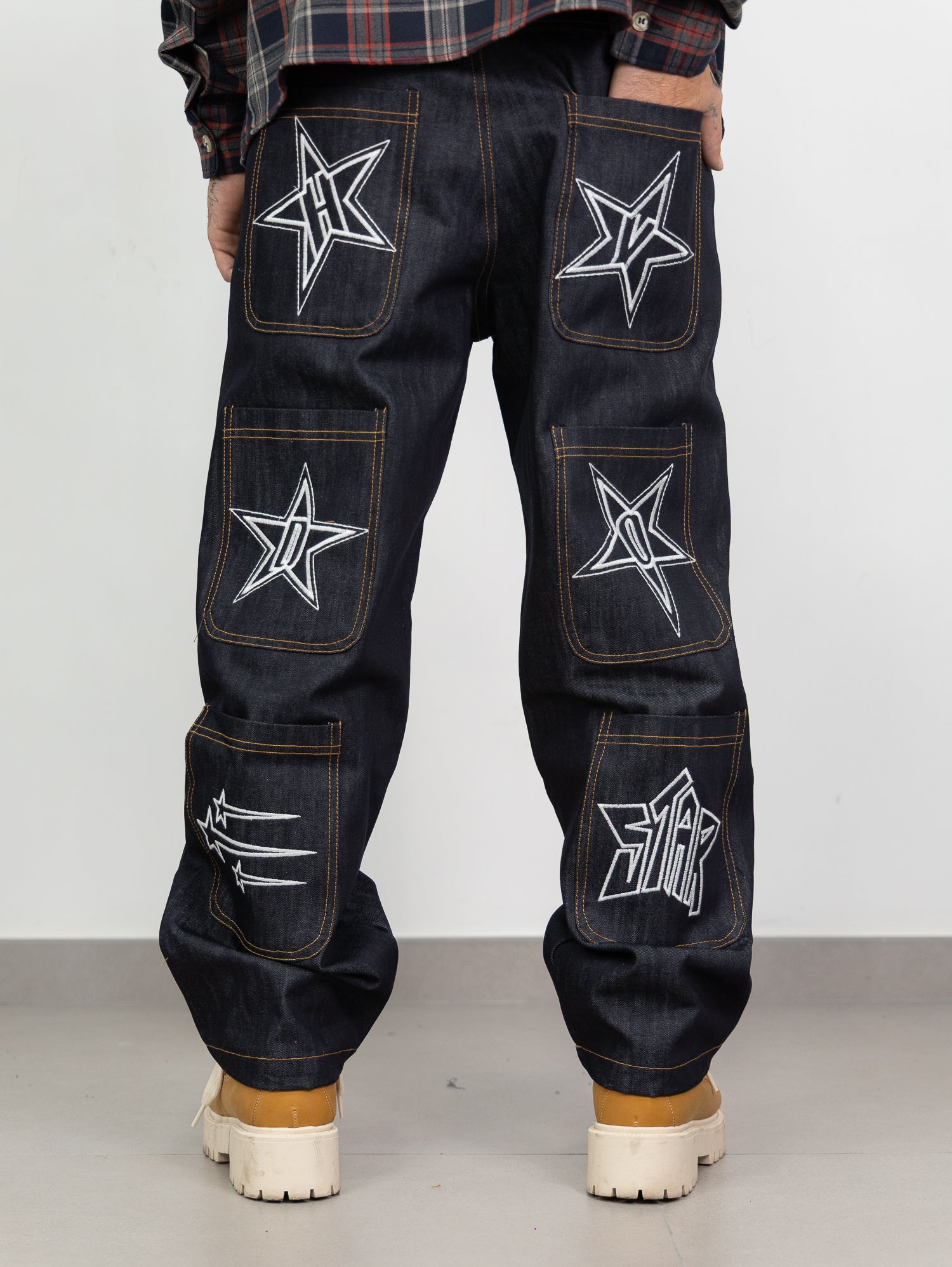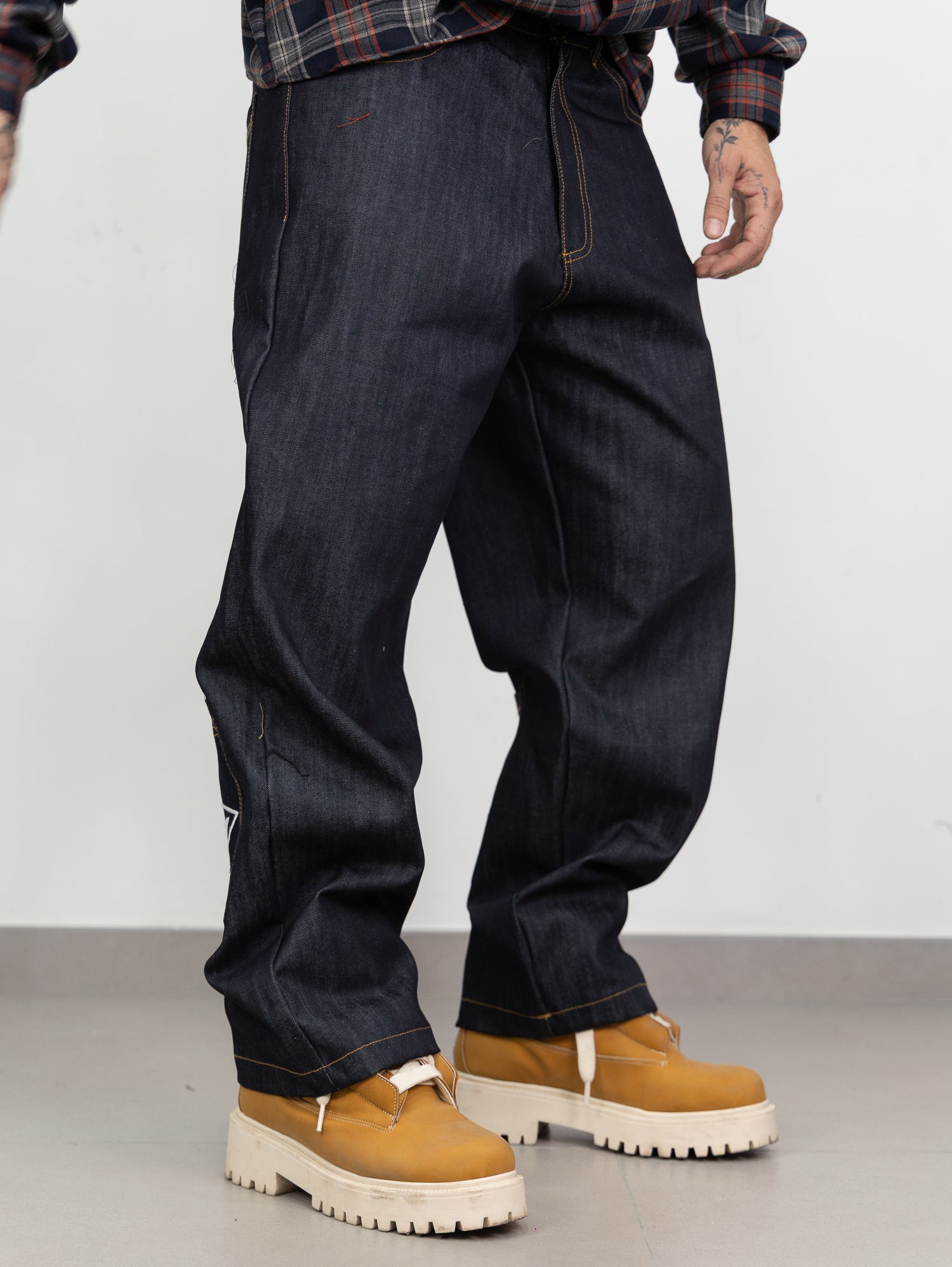 denim lavaggio zero con stampa ricamata retro a contrasto