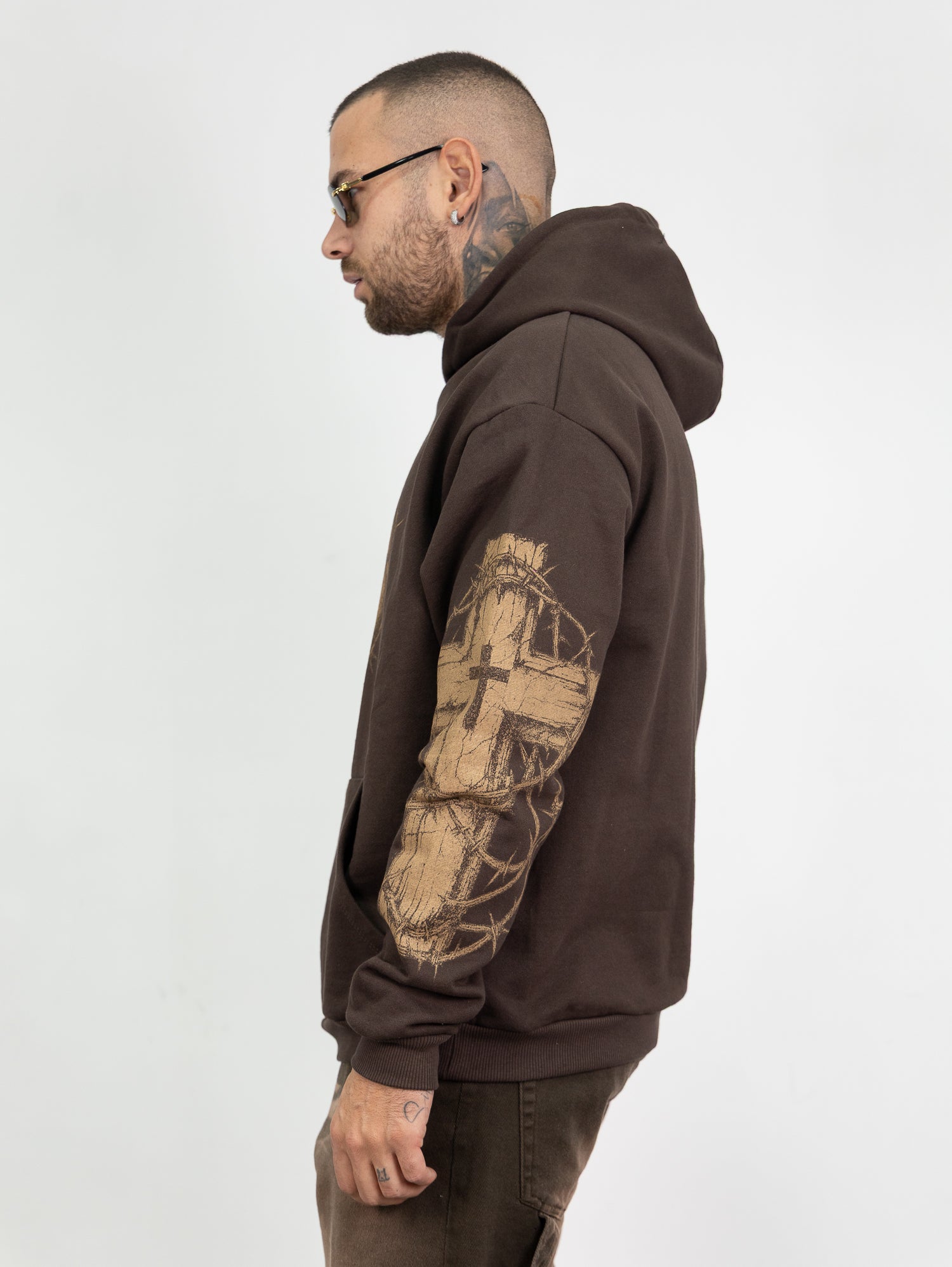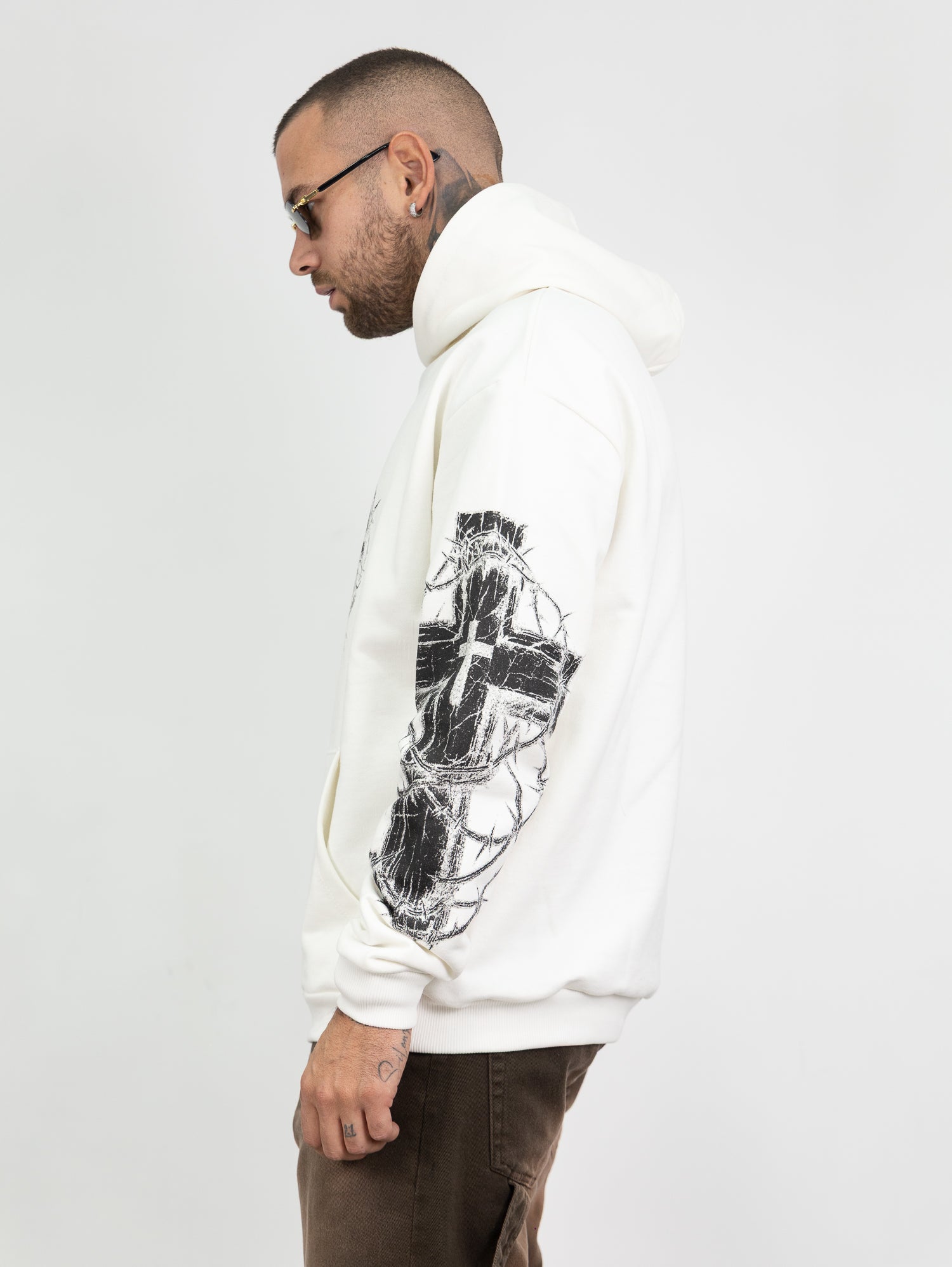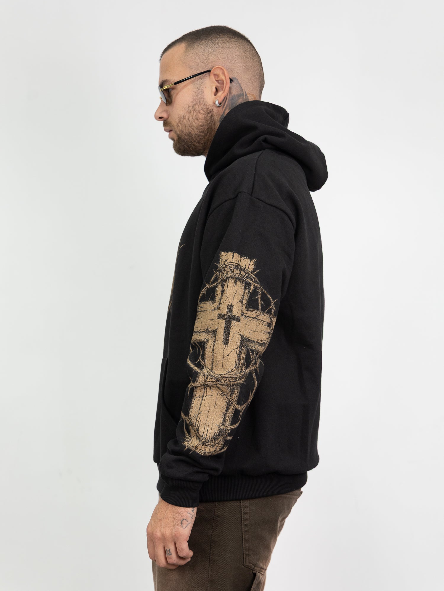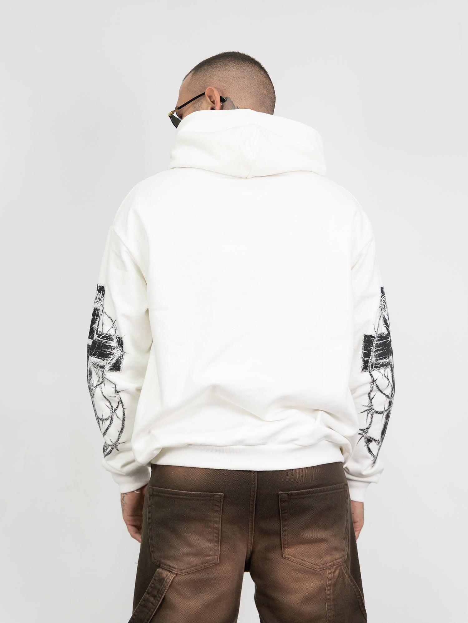 felpa con cappuccio,stampa frontale e lungo le maniche