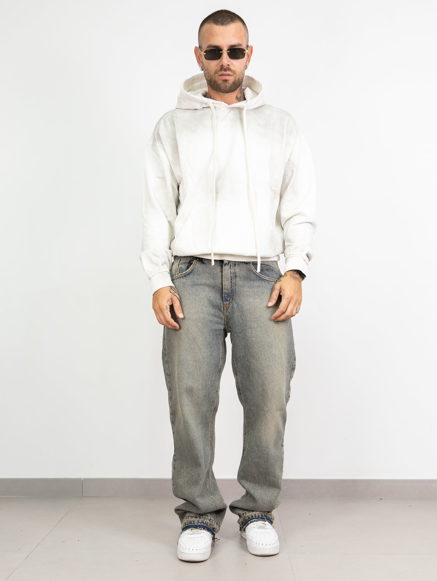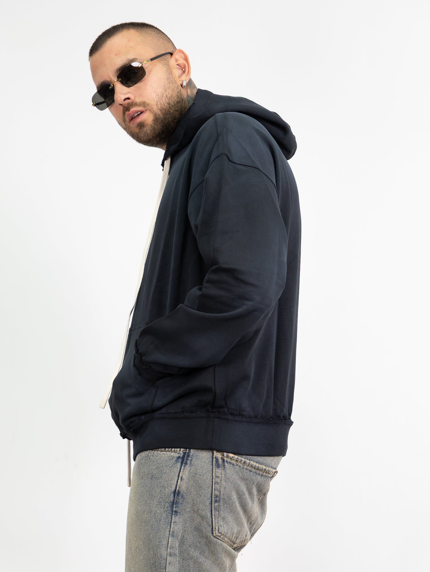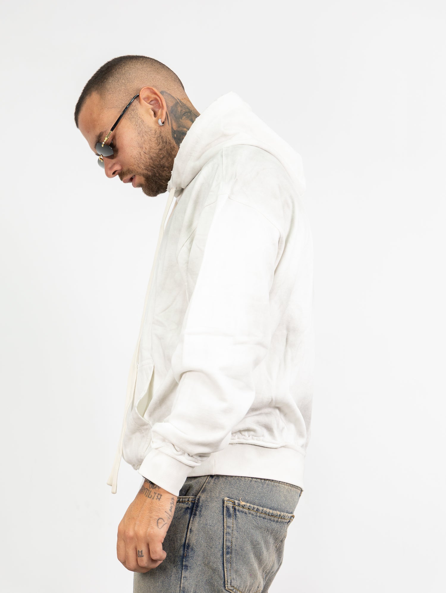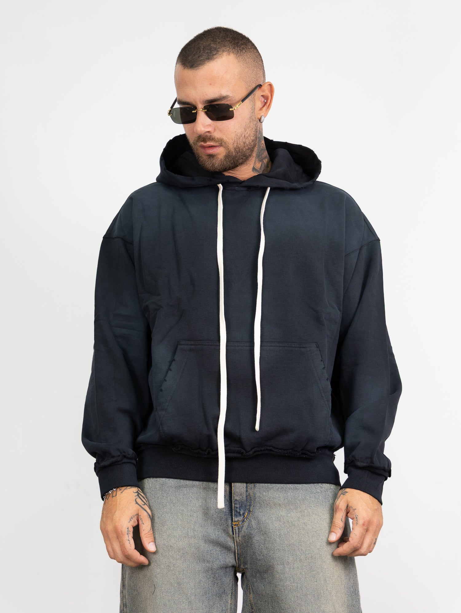 felpa in tessuto milano sfumata con cappuccio e laccio,tascone frontale,elastico sui polsi e sul fondo con rotture taglio vivo fronte\retro.