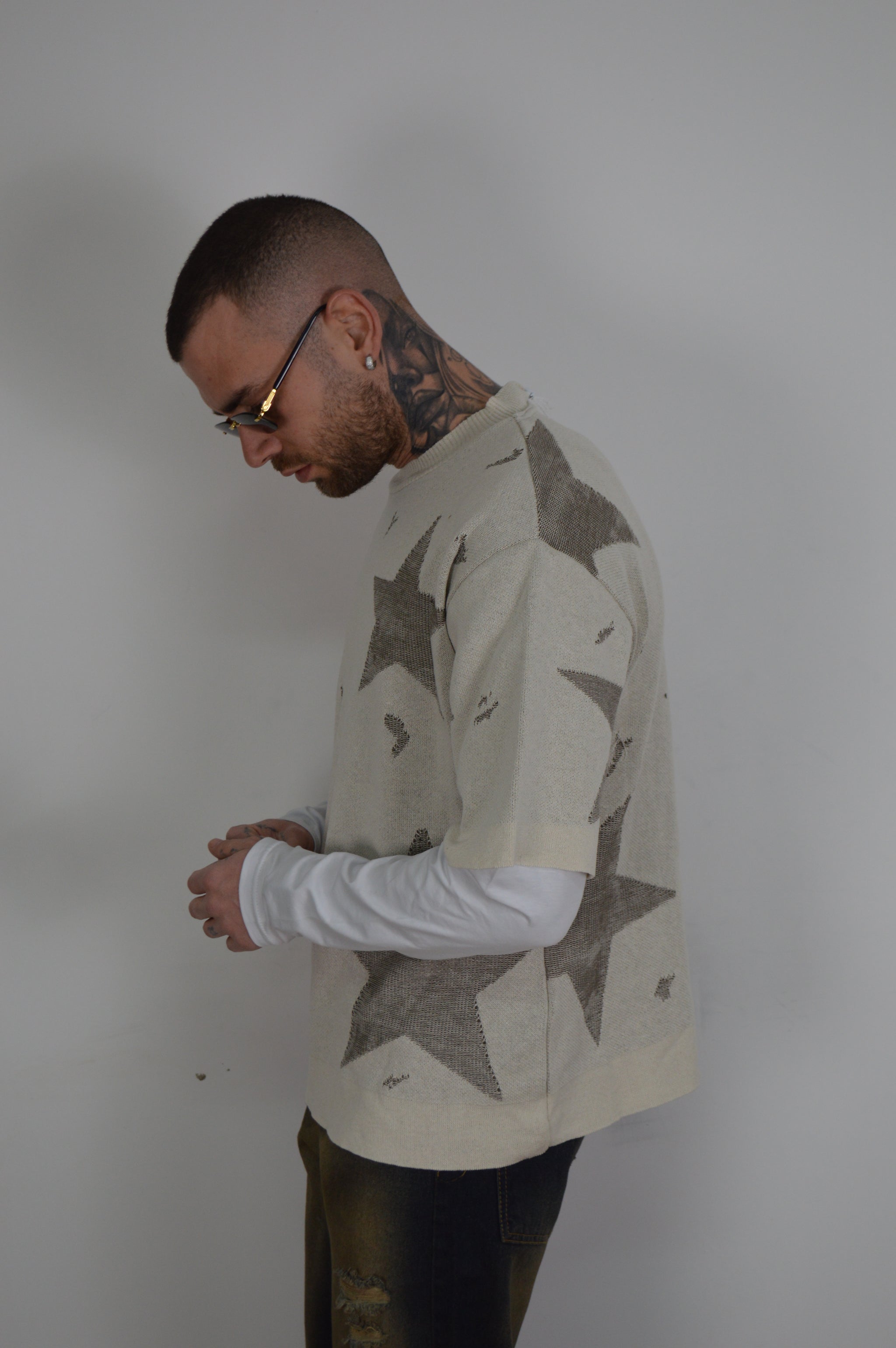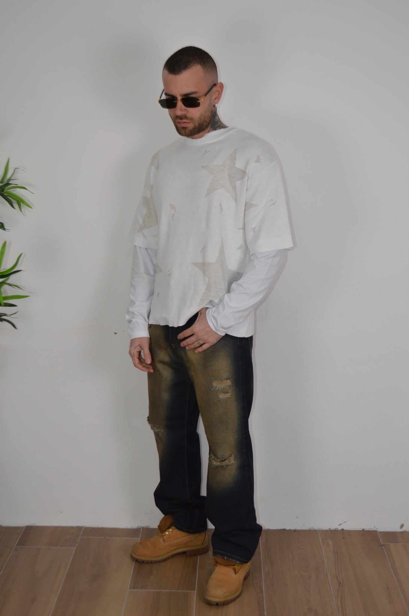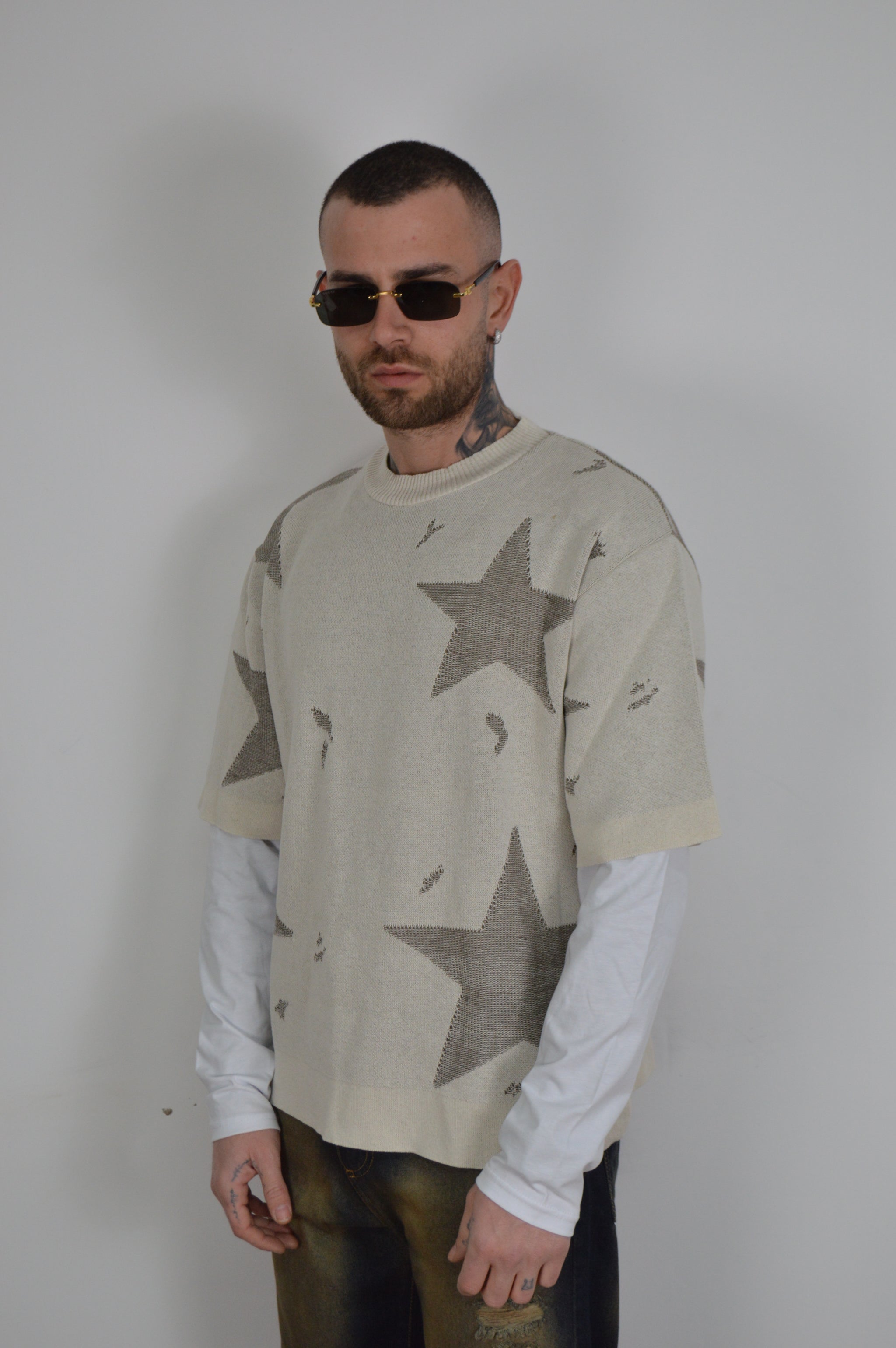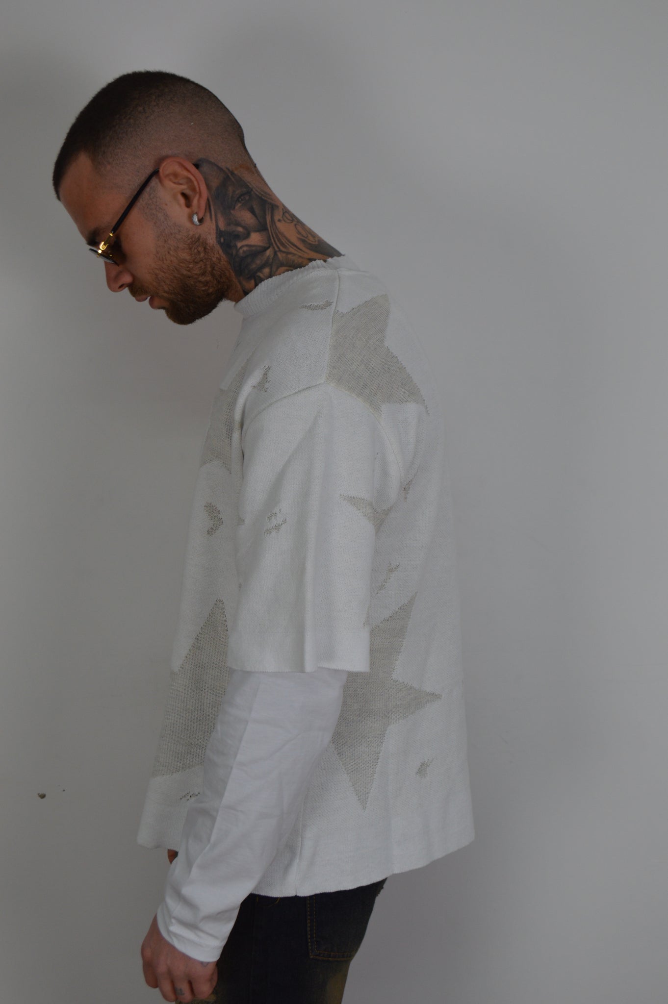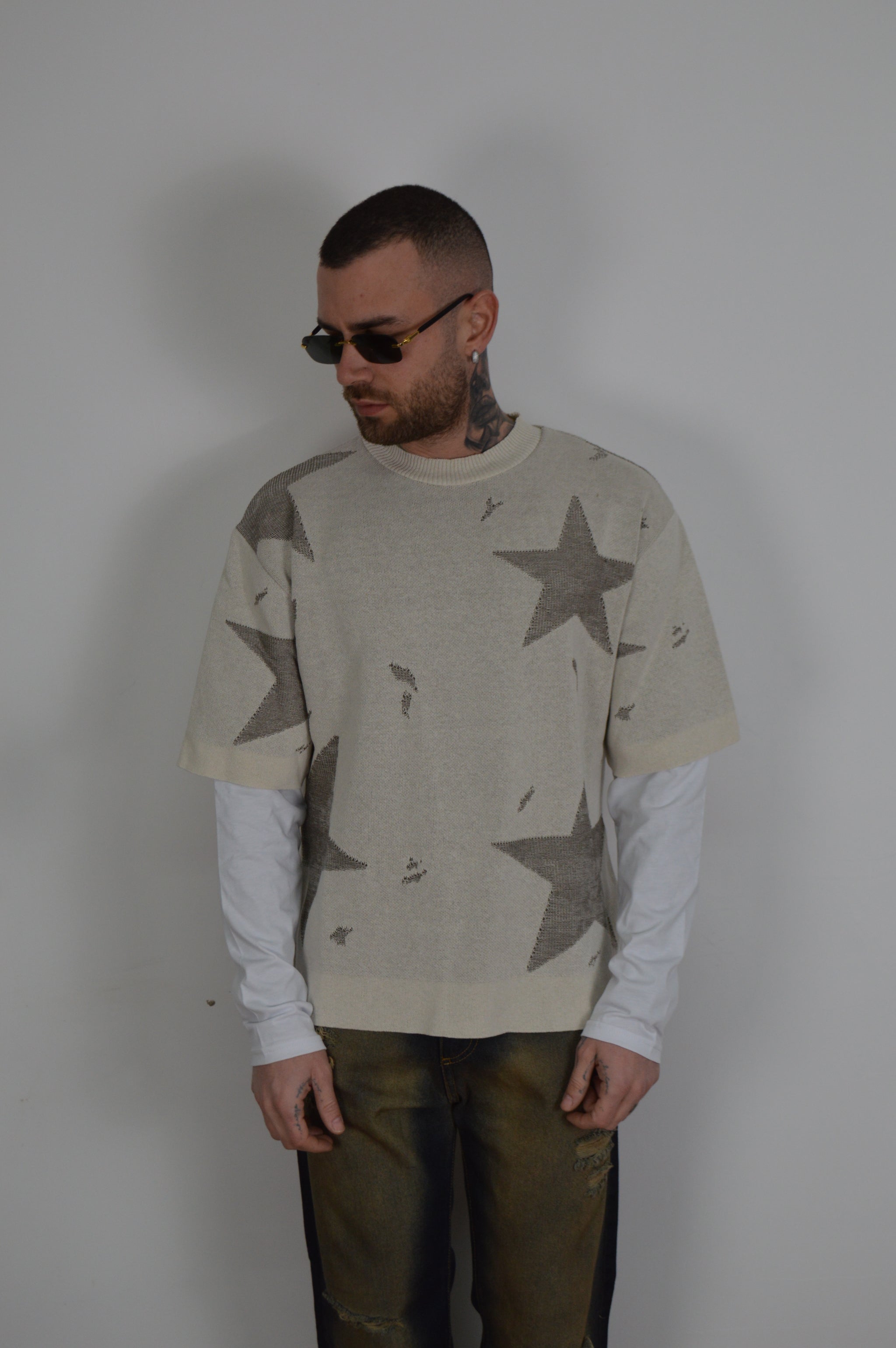 maglia in filo con doppia manica in cotone,doppio colore con stelle cucite a contrasto.