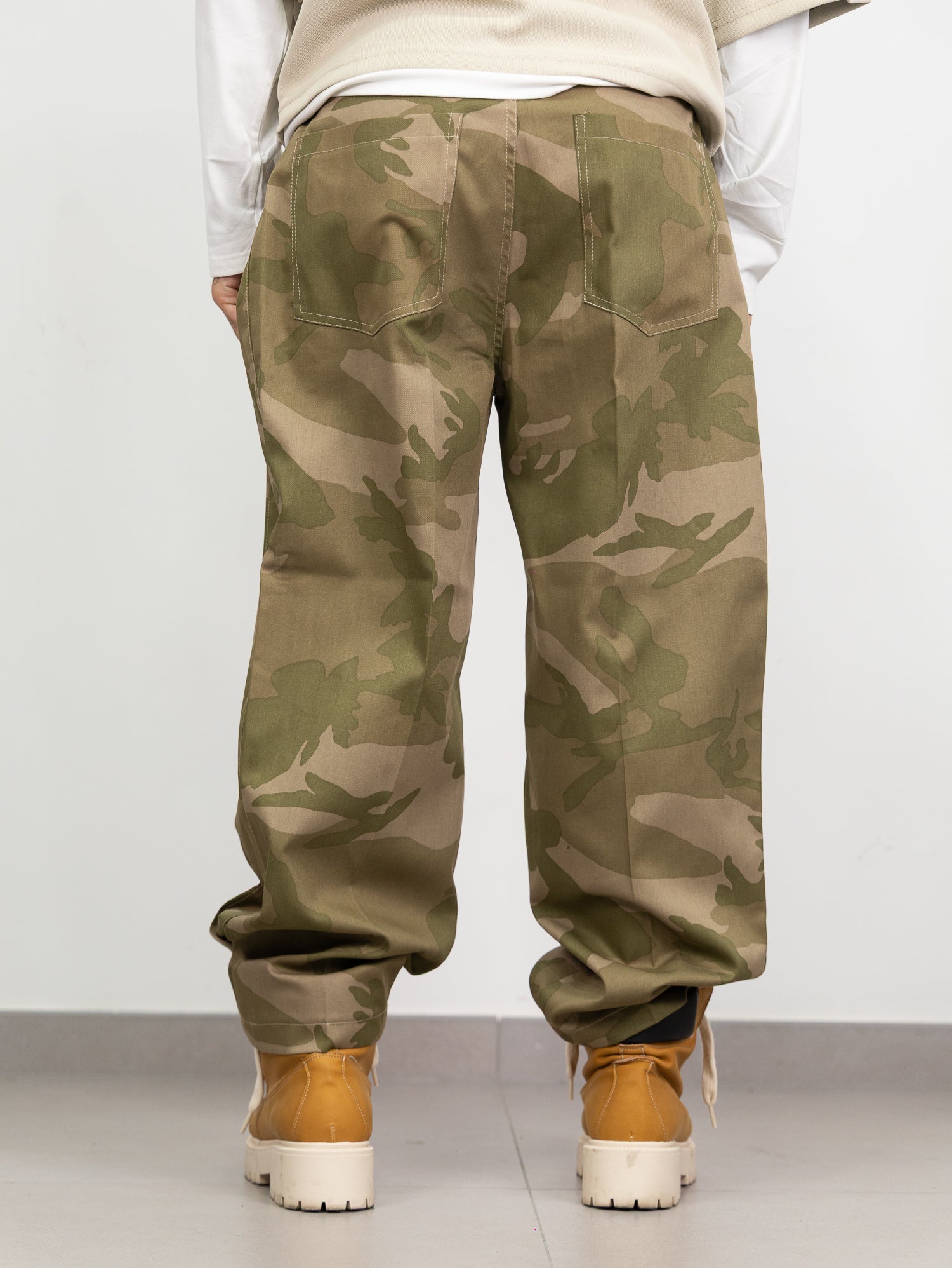 Pantalone mimetico,fondo largo,con elastico e bottone in vita.