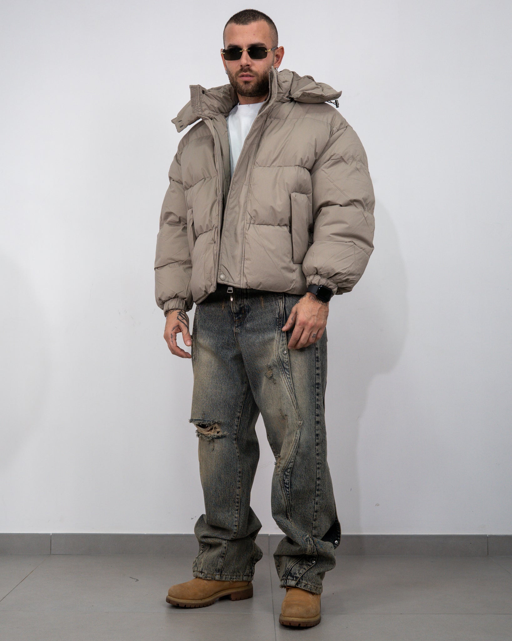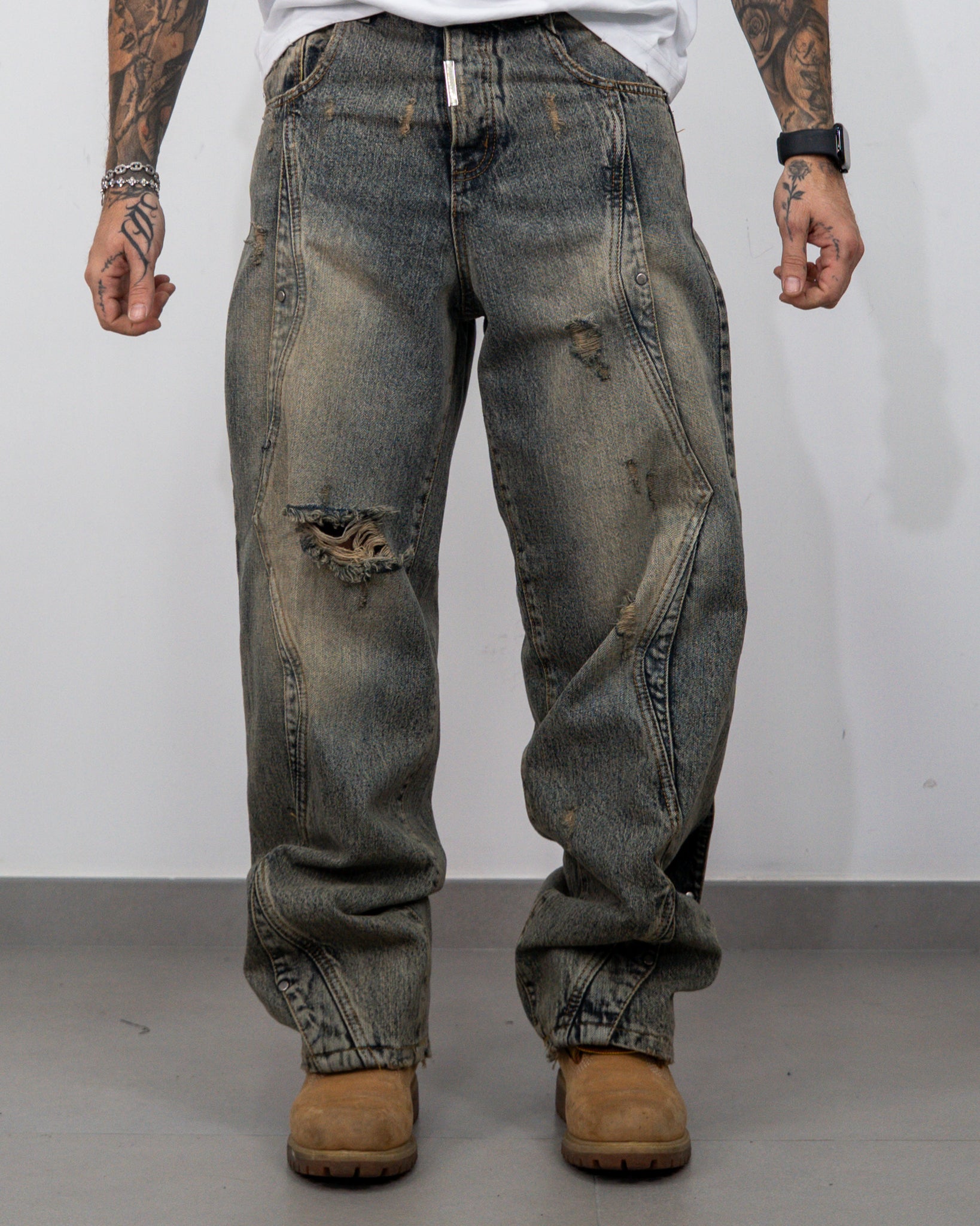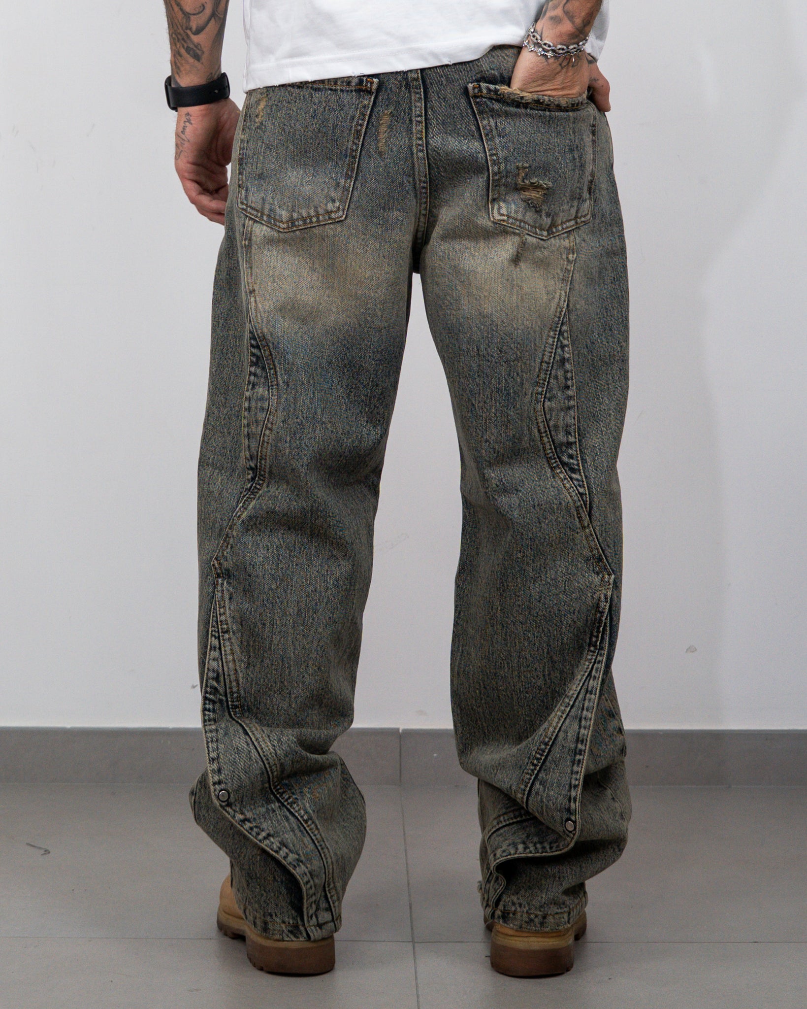 baggy in denim sfumato con rotture taglio vivo fronte\retro,cuciture esterne in rilievo con dettagli occhielli.