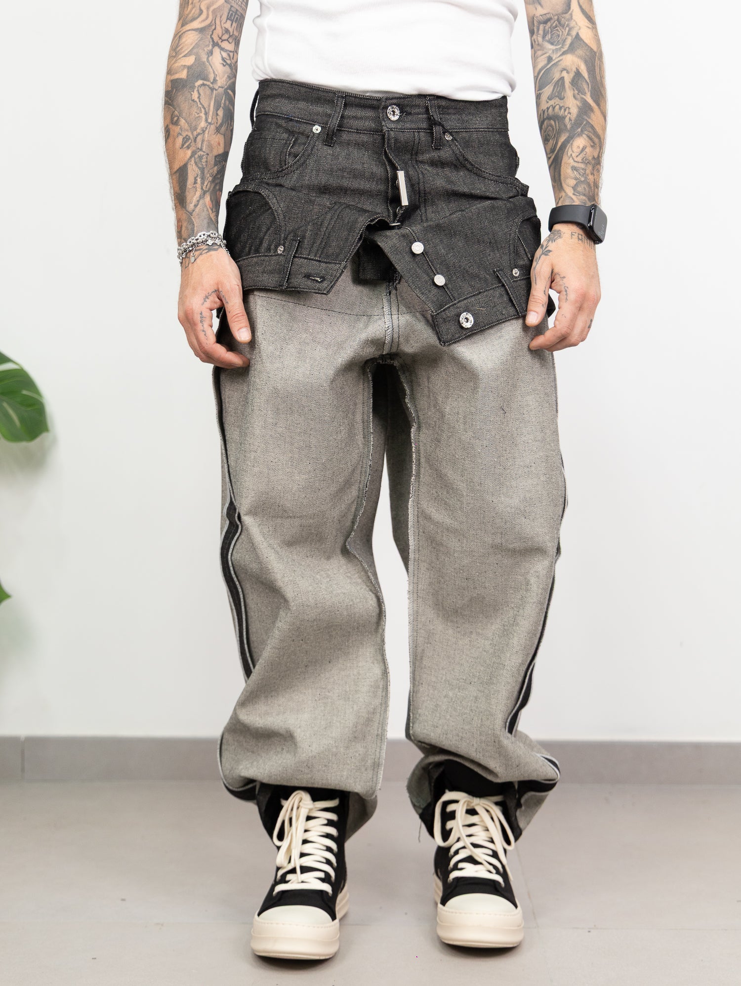 baggy in denim doppio colore,con doppia abbottonatura,reversibile.