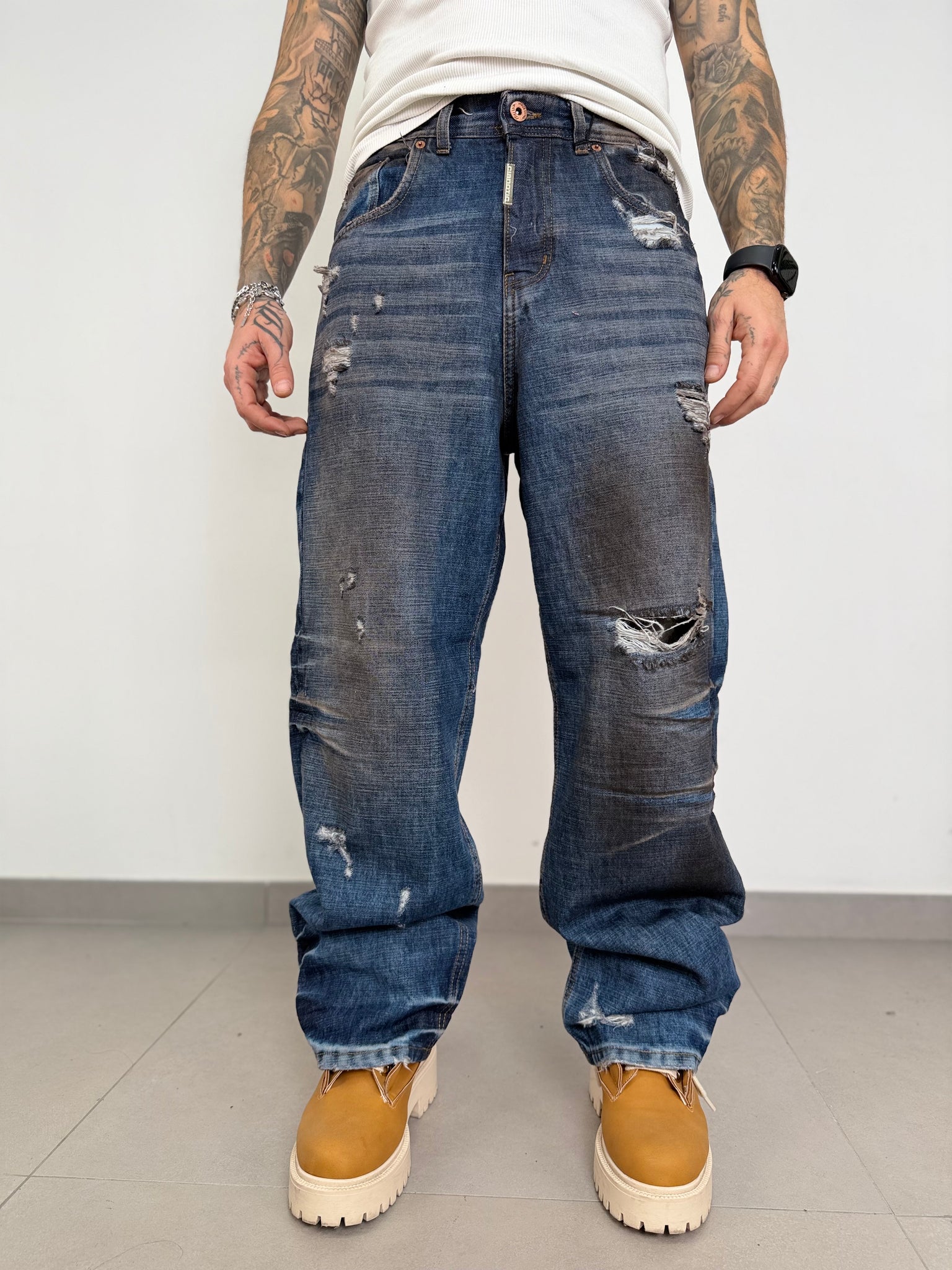 baggy sfumato bicolor,con rotture taglio vivo frontali