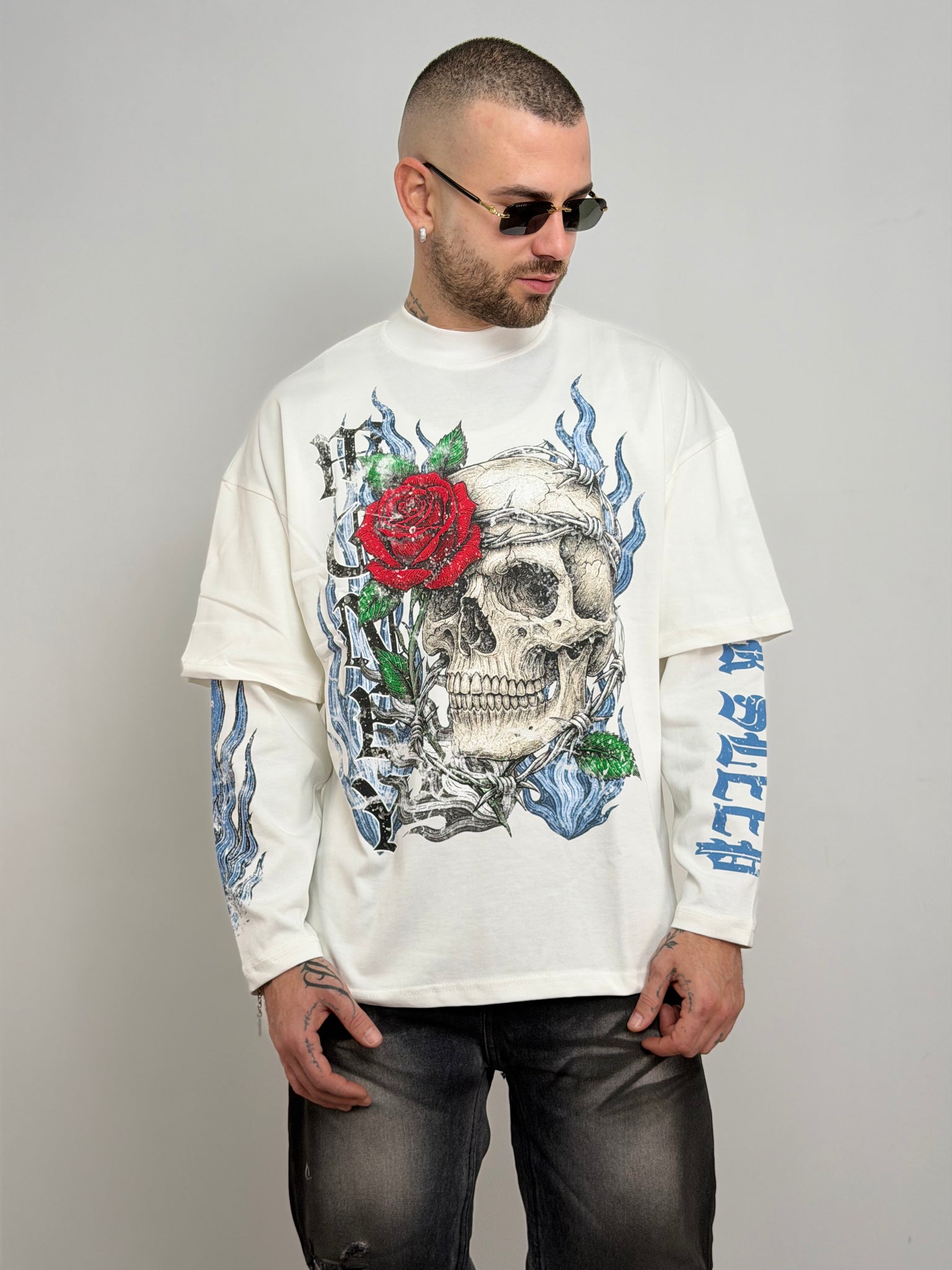 t-shirt doppia manica con stampa frontale e lungo le maniche a contrasto