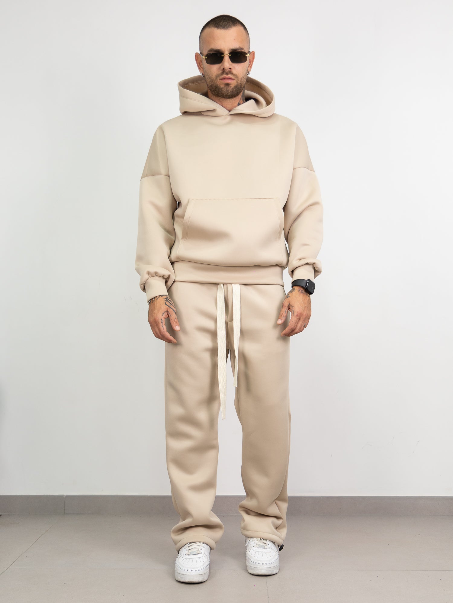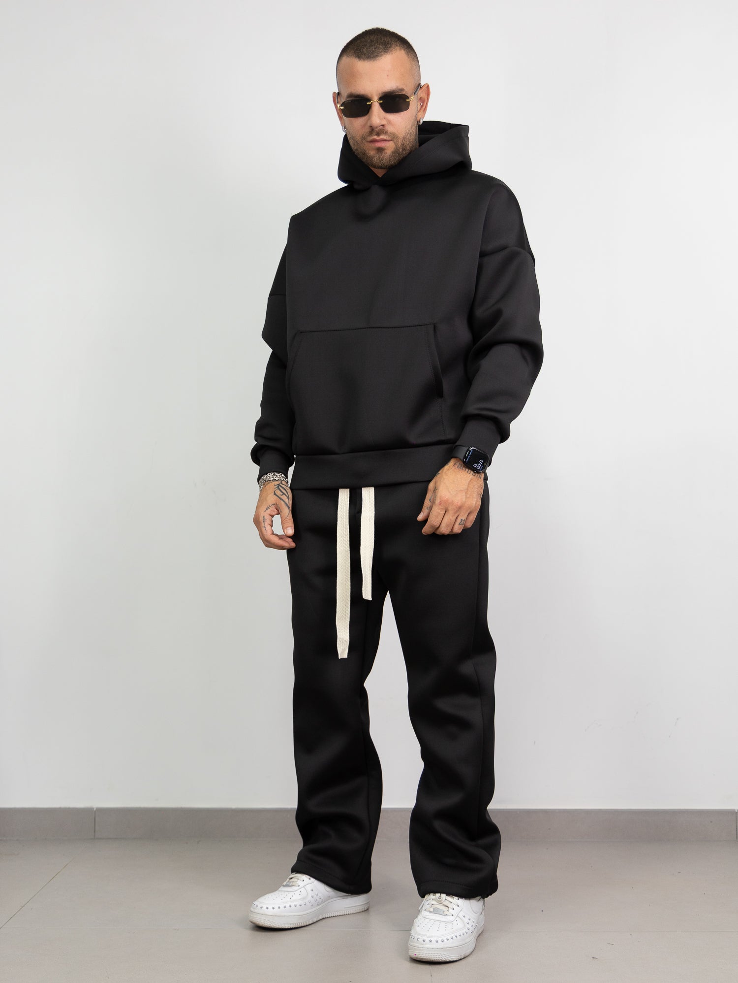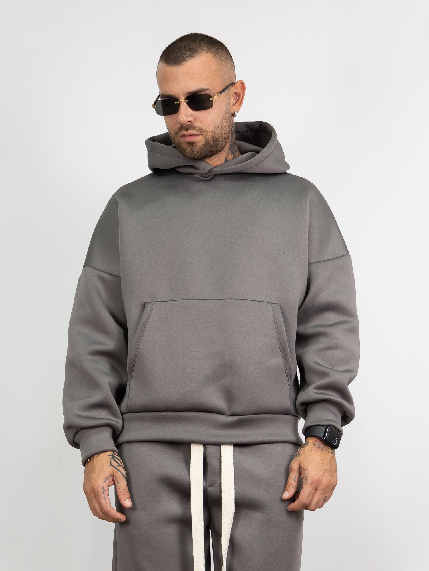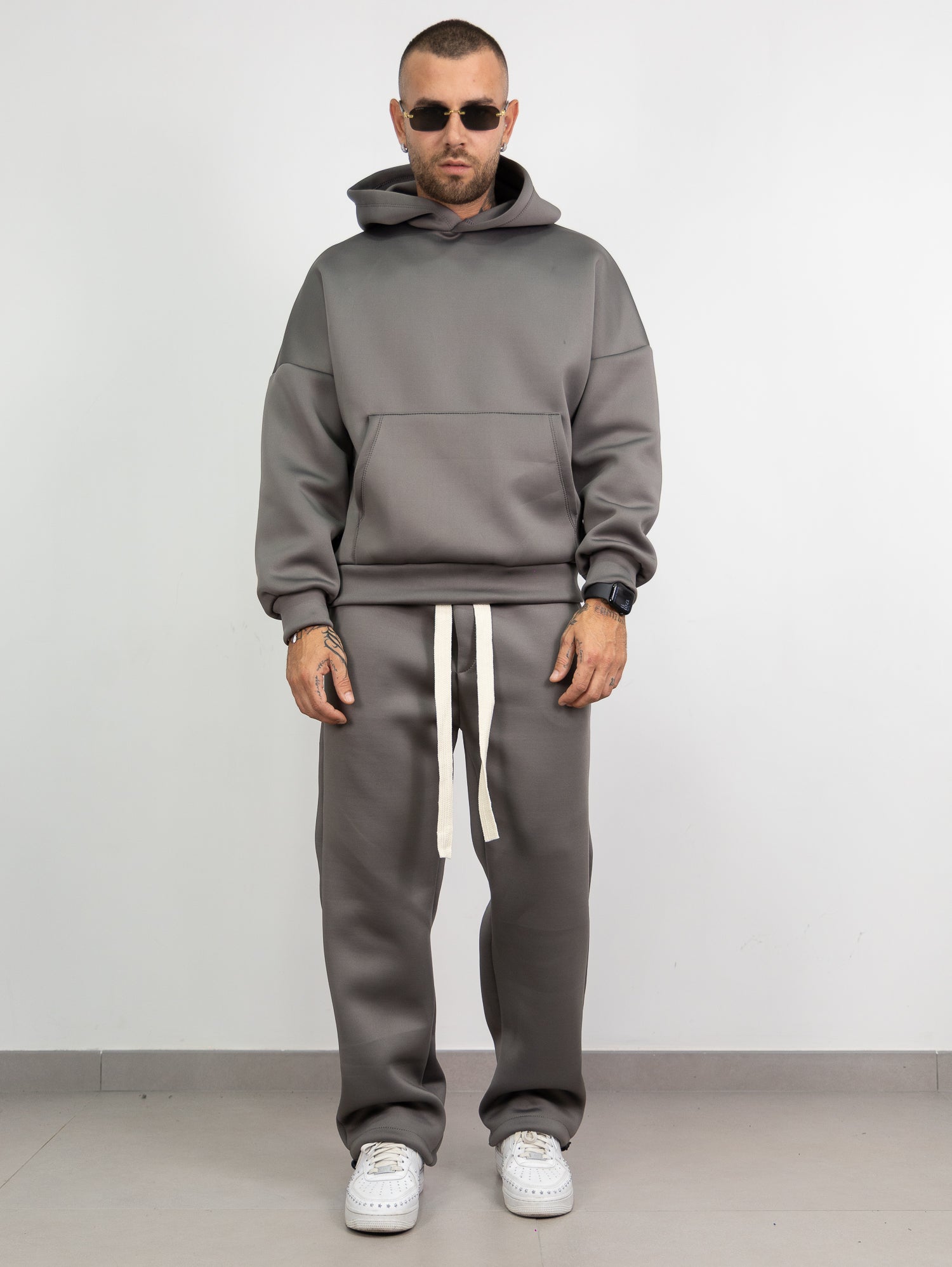 felpa con cappuccio e tascone frontale,pantatuta con elastico e laccione in vita con parachute regolabile sul fondo