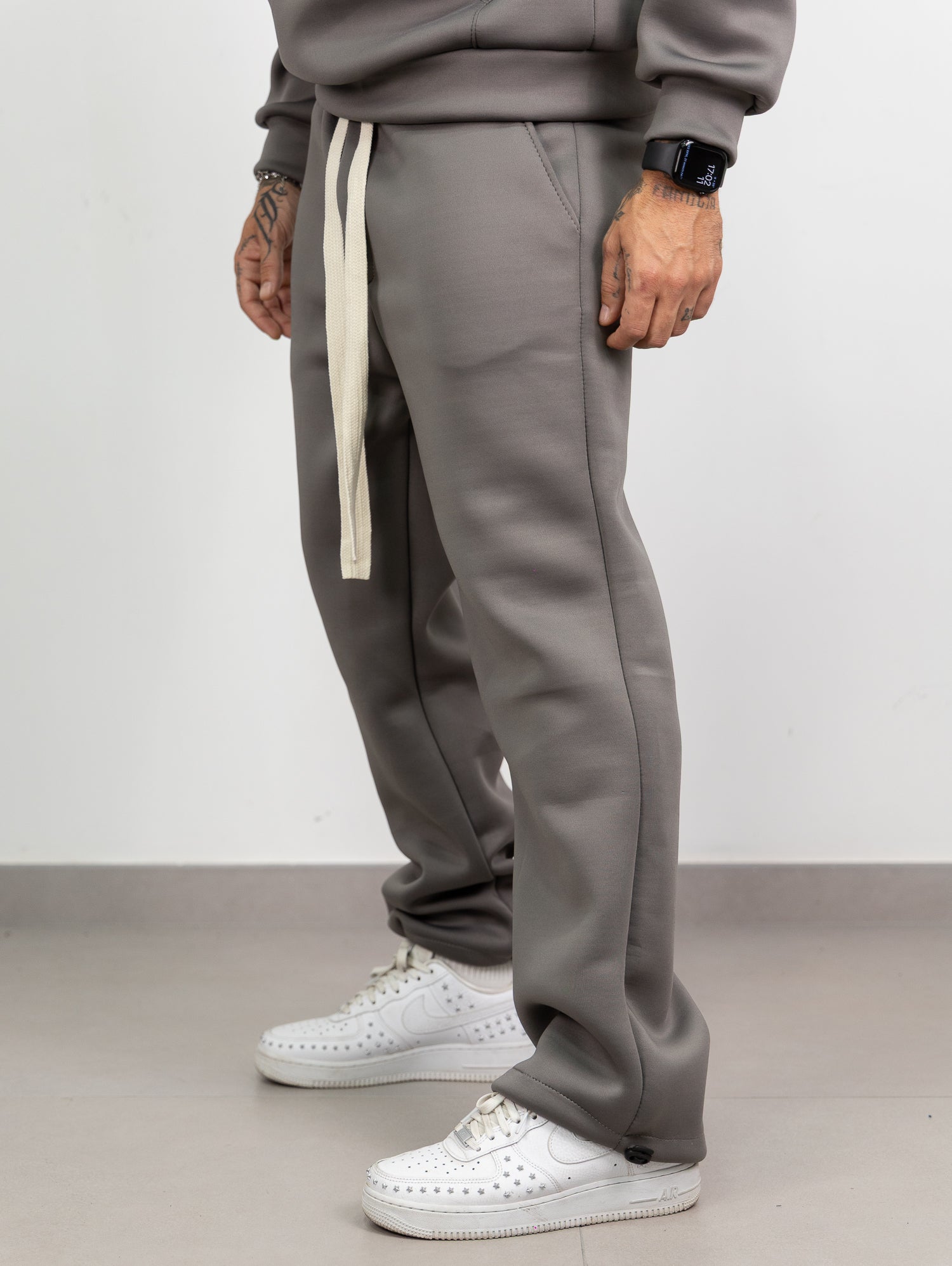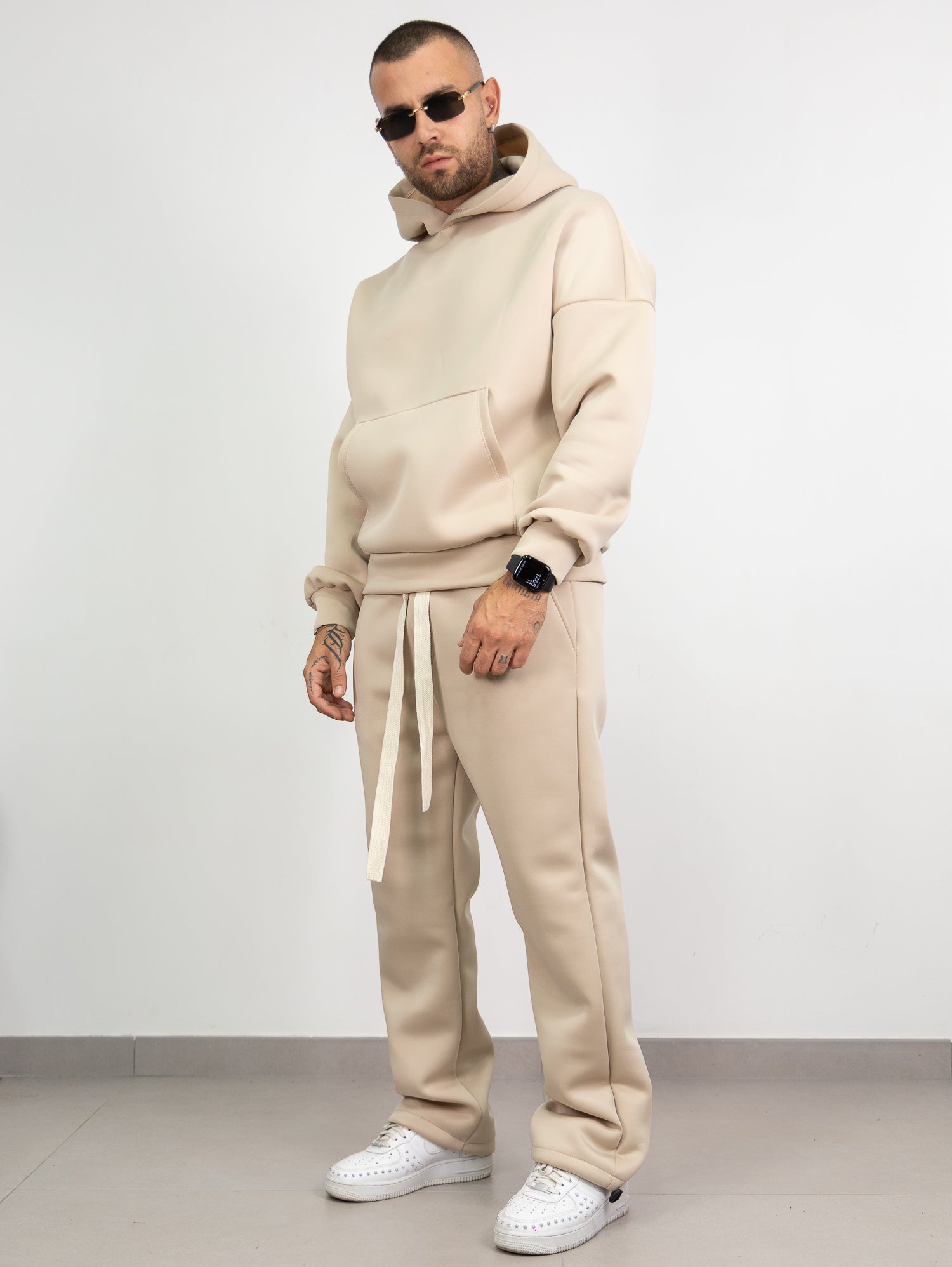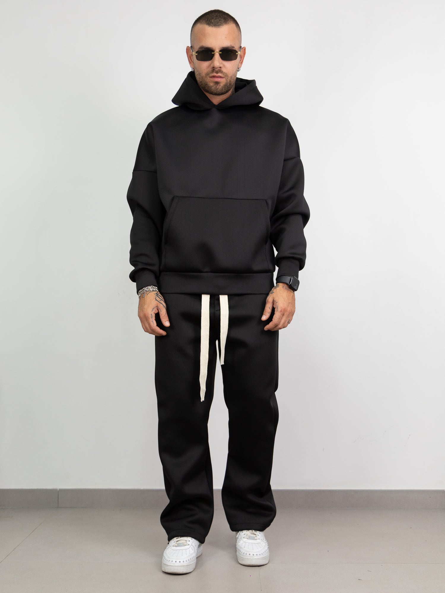 felpa con cappuccio e tascone frontale,pantatuta con elastico e laccione in vita con parachute regolabile sul fondo
