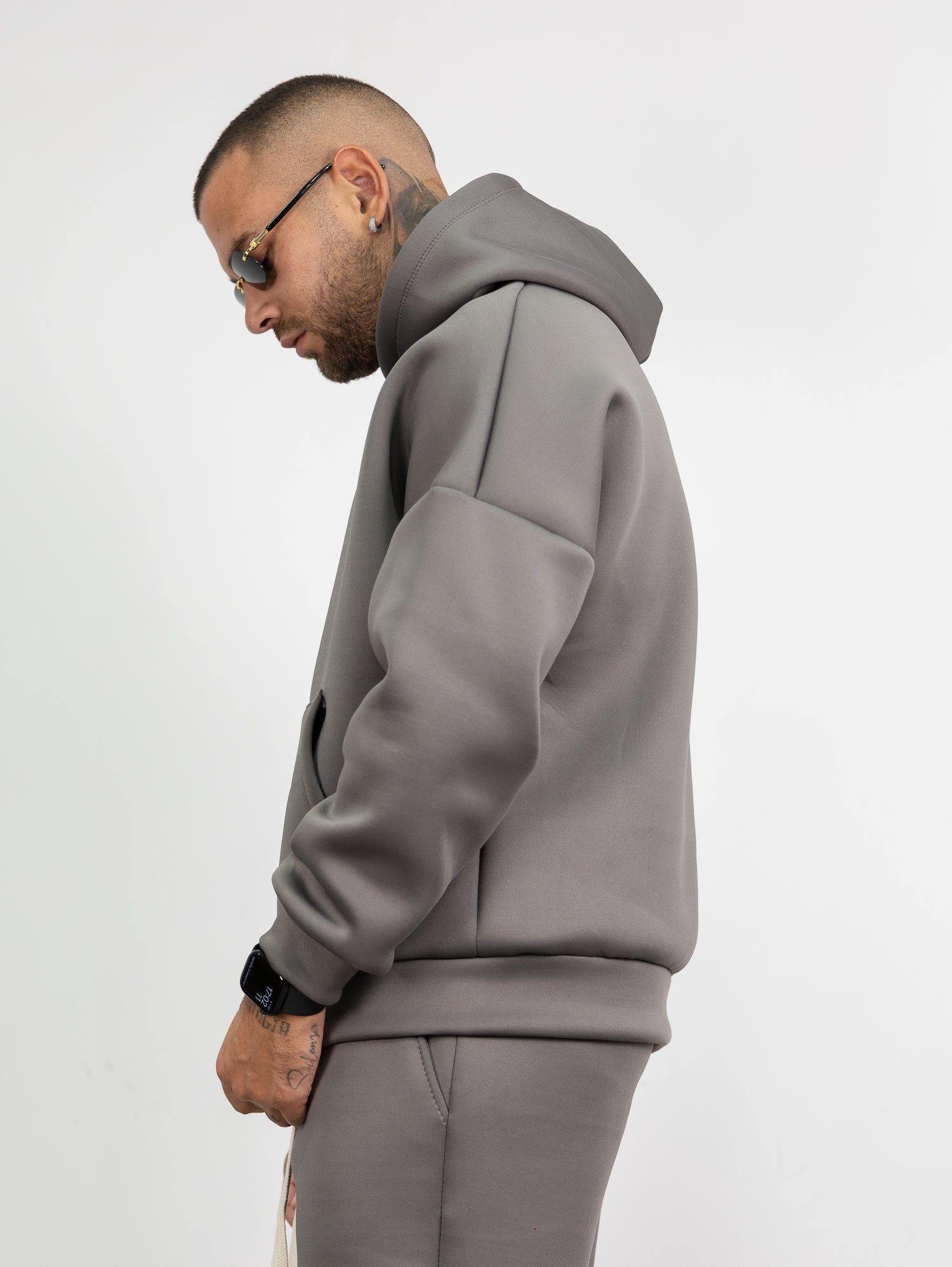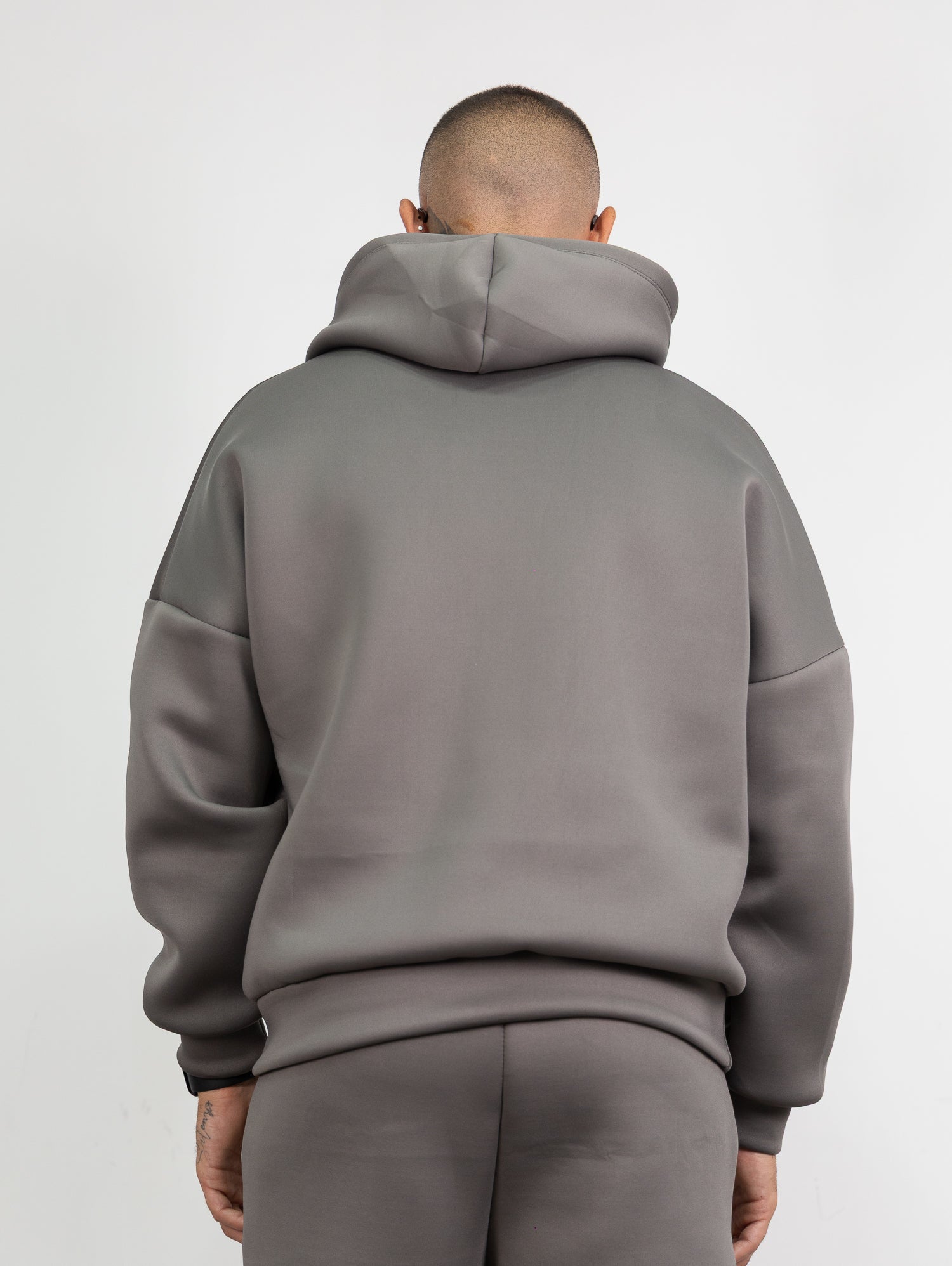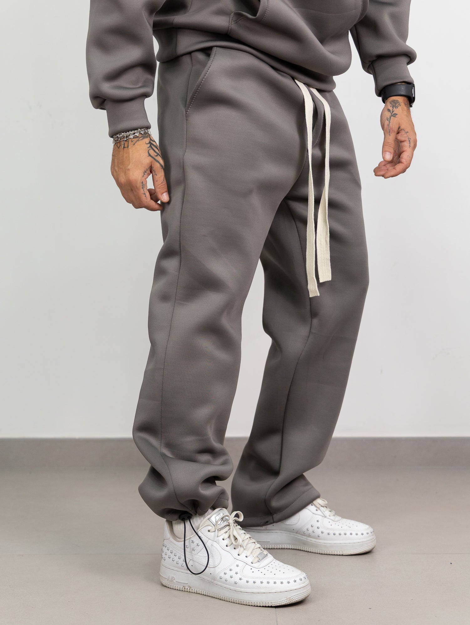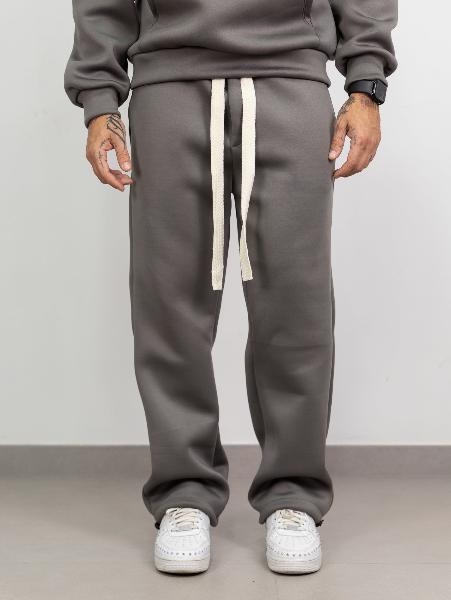 felpa con cappuccio e tascone frontale,pantatuta con elastico e laccione in vita con parachute regolabile sul fondo